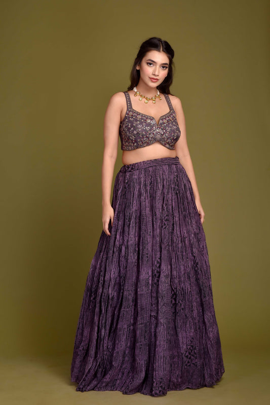 DEEP PURPLE PRINTED LEHENGA WITH MIRROR WORK BLOUSE