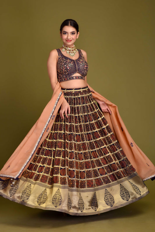 NAVY BLUE GAJI SILK LEHENGA IN AJRAKH PRINT