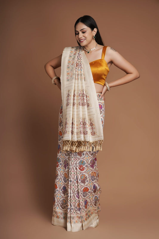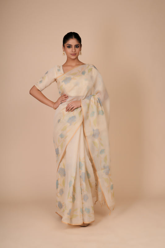 OFF WHITE LINEN SAREE WITH GOLDEN PALLU