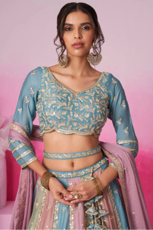 PASTEL BLUE EMBROIDERED NET LEHENGA