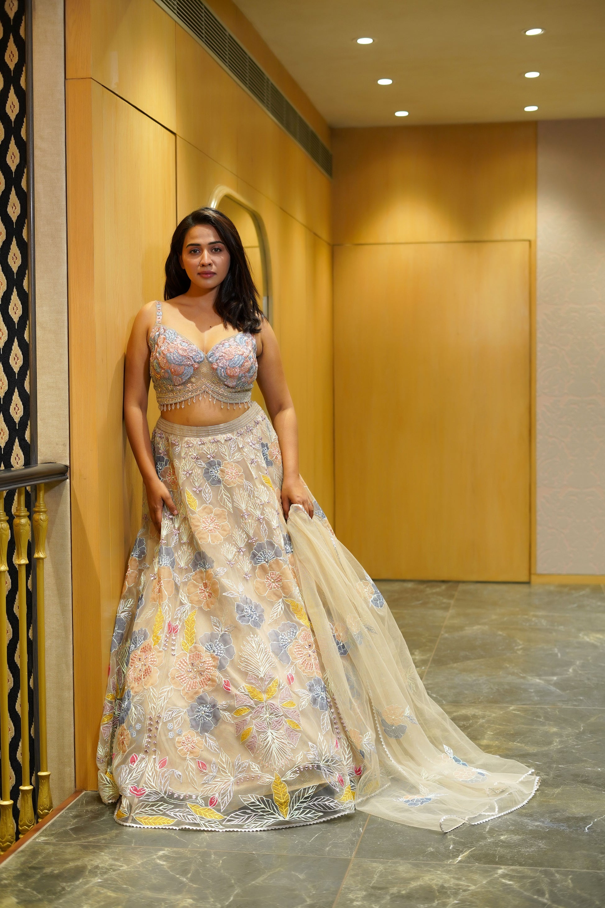 Featuring exquisite almond beige lehenga in net base from Indrani store. This gorgeous lehenga is exquisitely crafted with elegant mirror & sequins that shimmers and sparkles with every move you make.