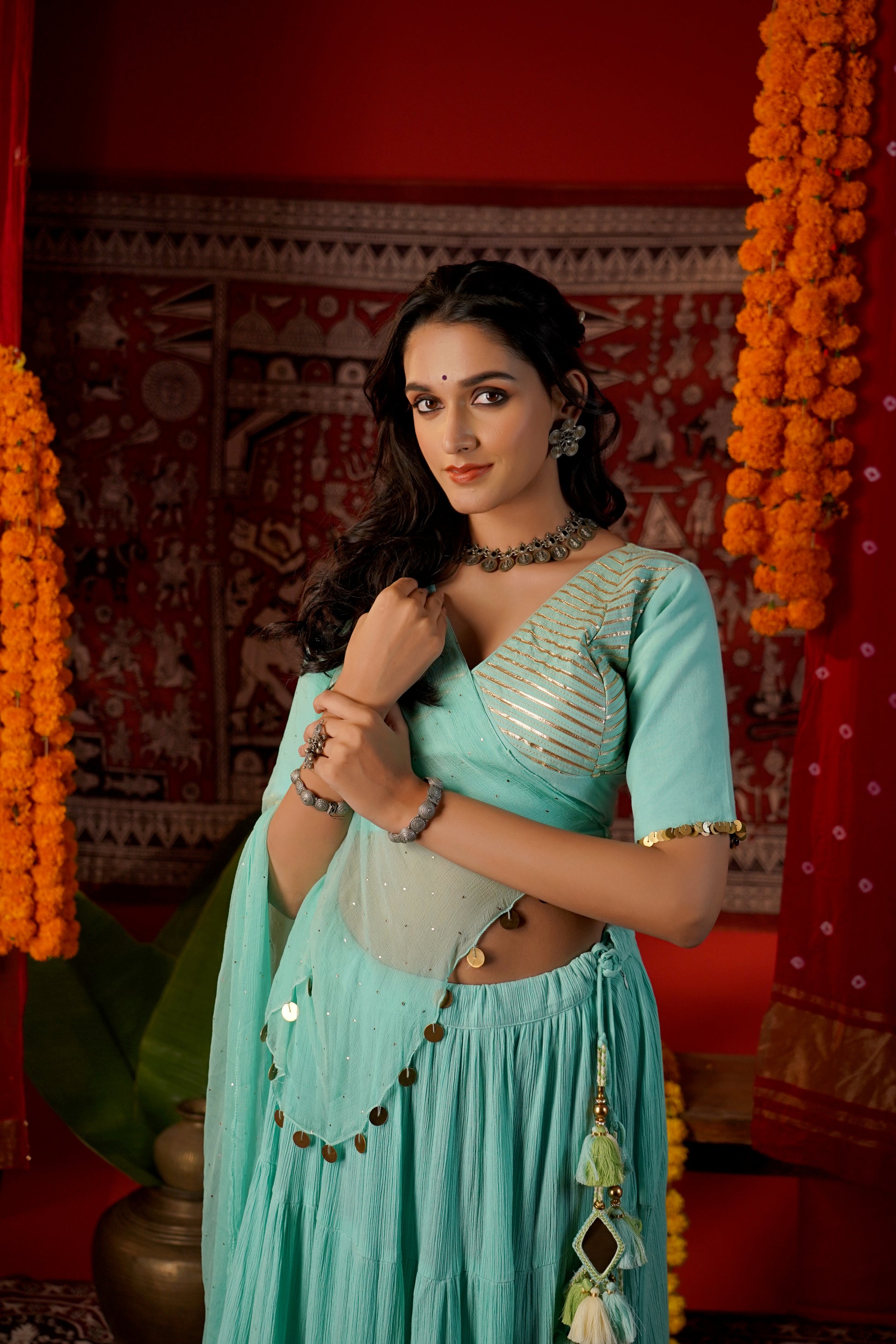 Indulge in the richness of this AQUA BLUE lehenga in crushed cotton fabric from Indrani store. The lehenga comes with a matching blouse and a mukaish work chiffon dupatta. Whether you're swirling to the beats of Garba or reveling in the festive fervor, this lehenga is a perfect companion for Navratri.