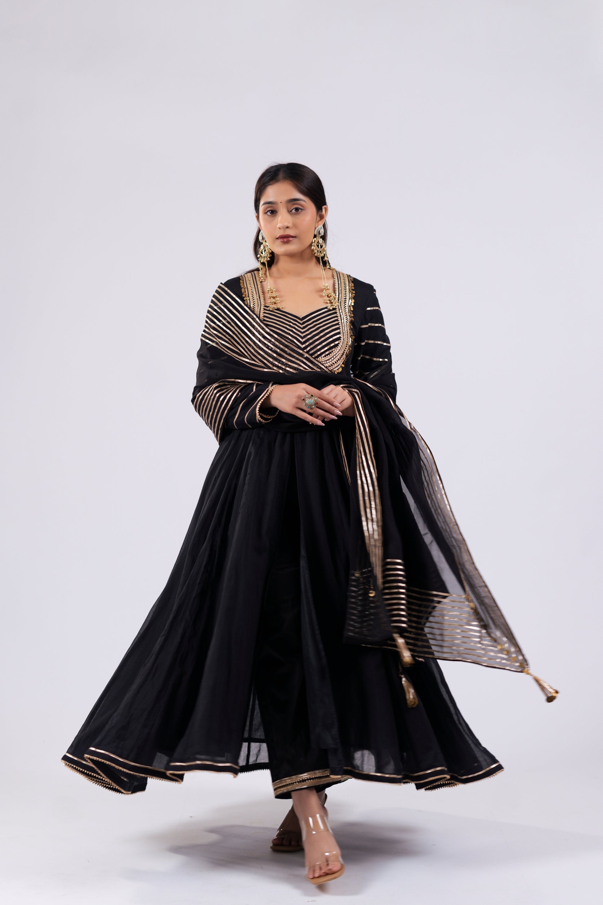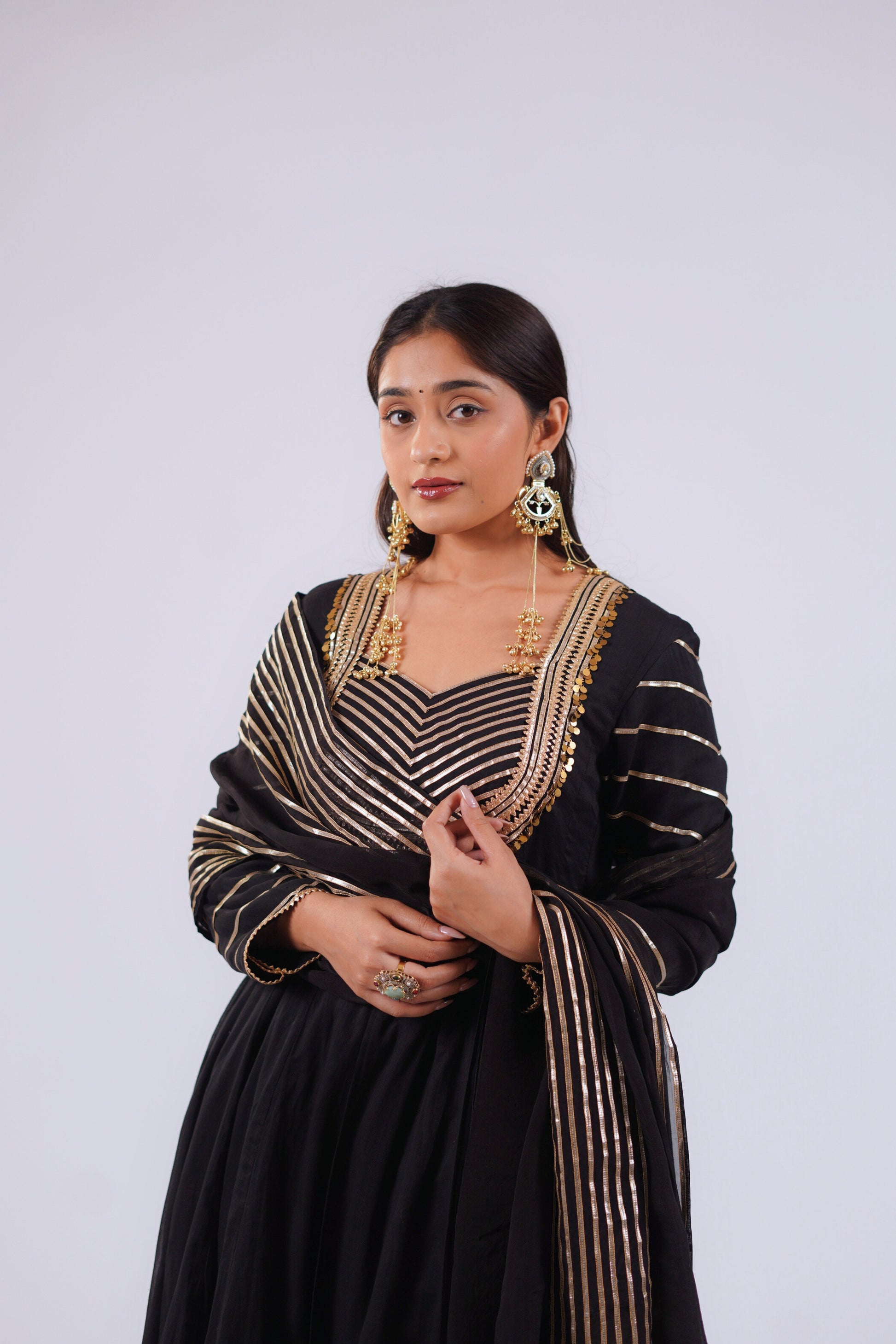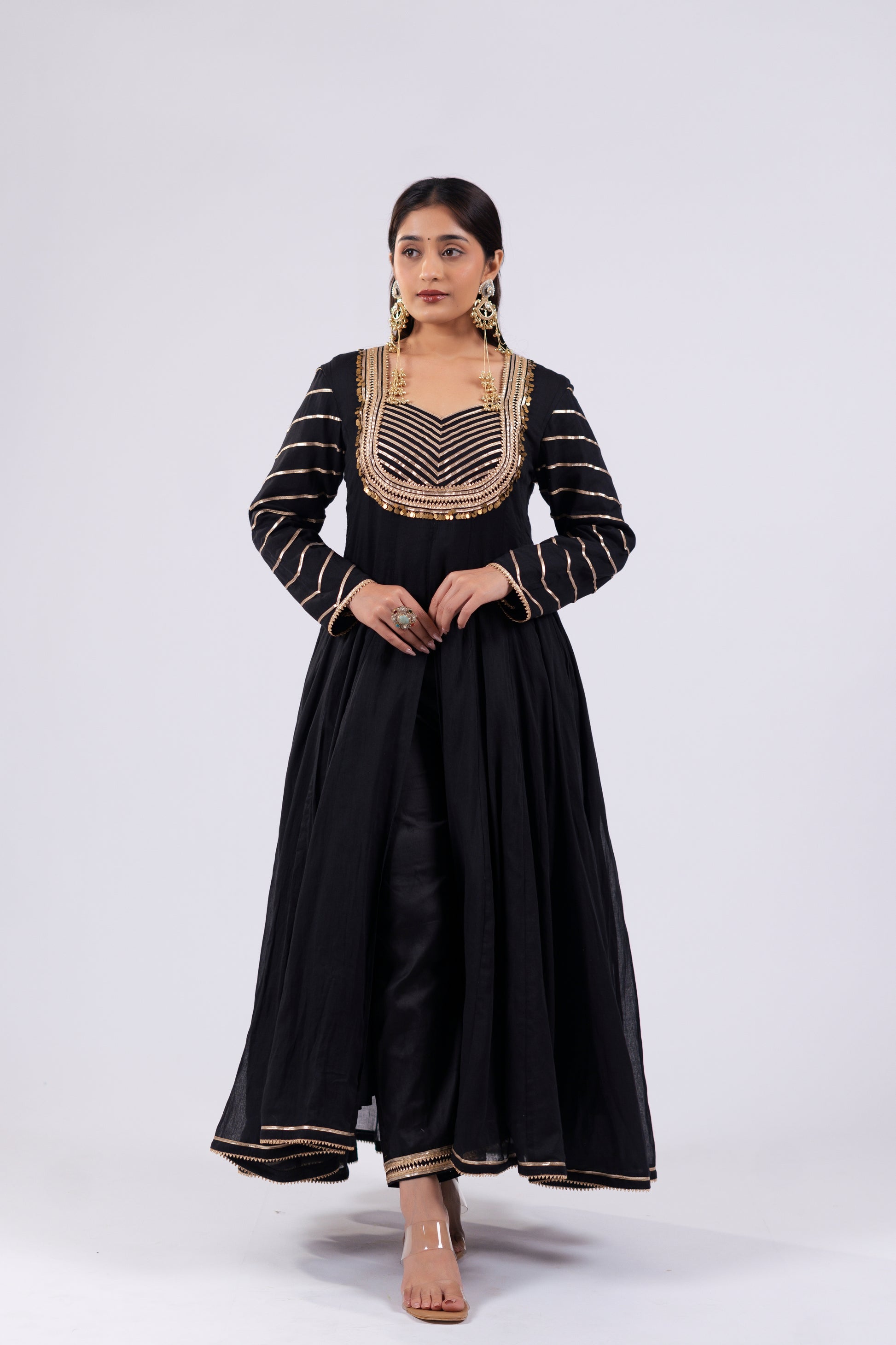 Step into effortless elegance with this black anarkali set in soft mul cotton fabric from Indrani store. Designed with a beautiful, flowing flare and a stylish front slit, it creates a striking yet graceful silhouette. The neckline is adorned with delicate embroidery detailing, adding a refined touch of craftsmanship. Paired with a matching dupatta, this ensemble is perfect for festive evenings and sophisticated celebrations.