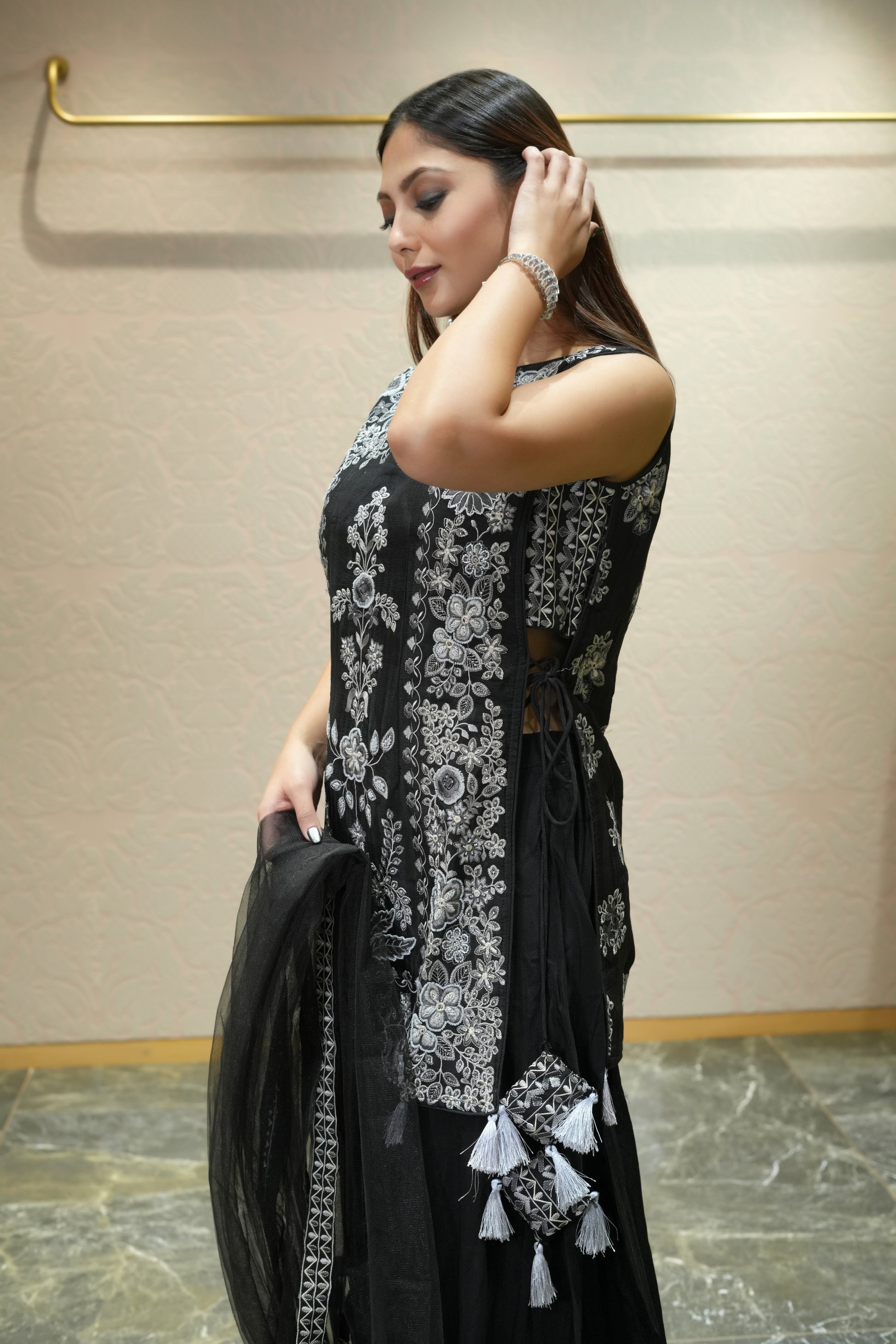 Introducing the gorgeous black palazzo set in chinon silk base from Indrani store. It has beautiful embroidered top with stylish side cuts. It comes with a matching palazzo and a net dupatta.