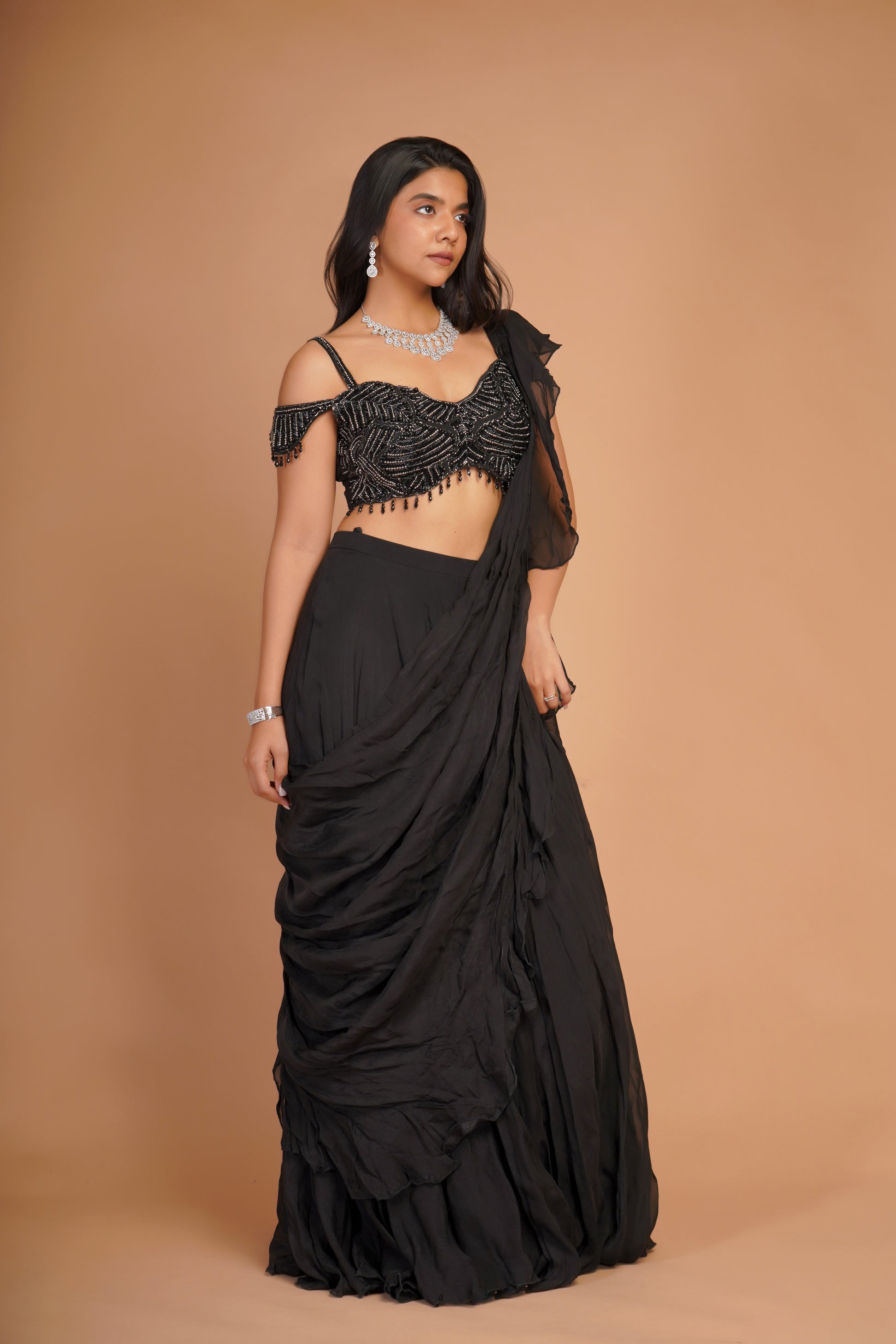 Combining beauty & grace, this lightweight black pre-stitched saree crafted in georgette wins every vote from modern fashionistas from Indrani store. This ensemble has a fancy sleeved blouse with stones and cutdana work with tassel detailing.
