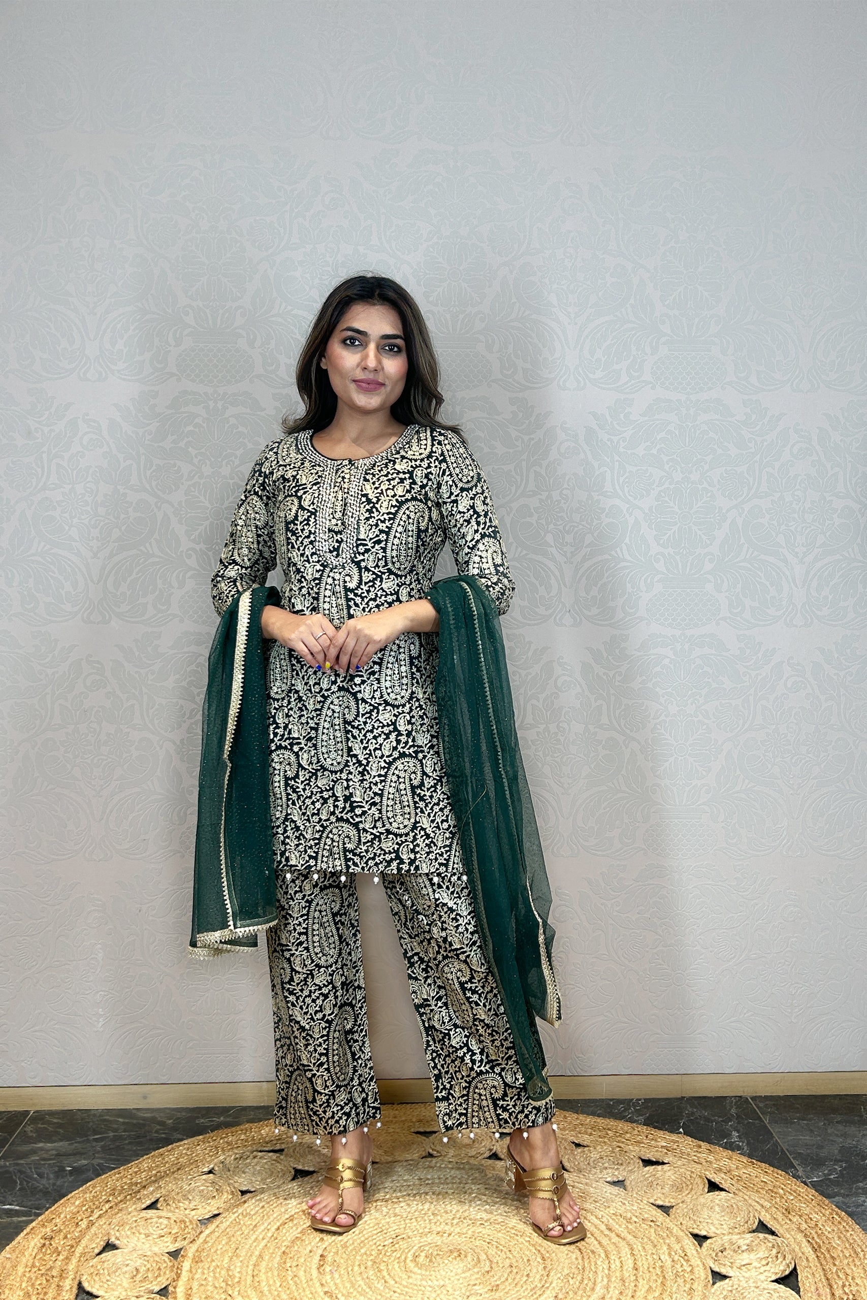 Featuring a bottle green suit set in georgette fabric base from Indrani store. It is a fully heavy embroidered set with a matching net dupatta.