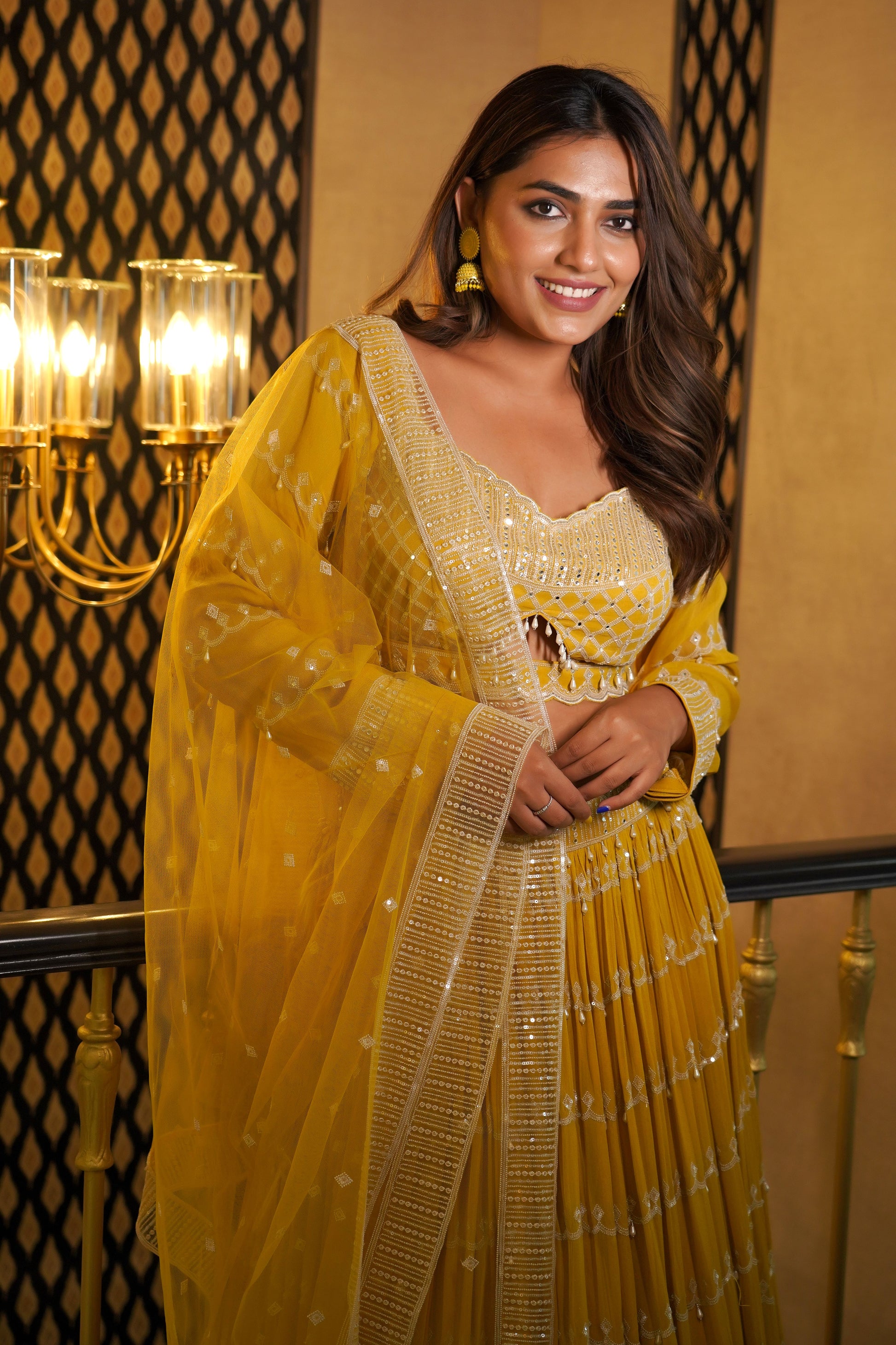 Featuring this canary yellow lehenga in georgette base from Indrani store. The skirt has beautiful all over pearl embroidery along with sequins. It comes with a matching embroidered blouse and a net dupatta.