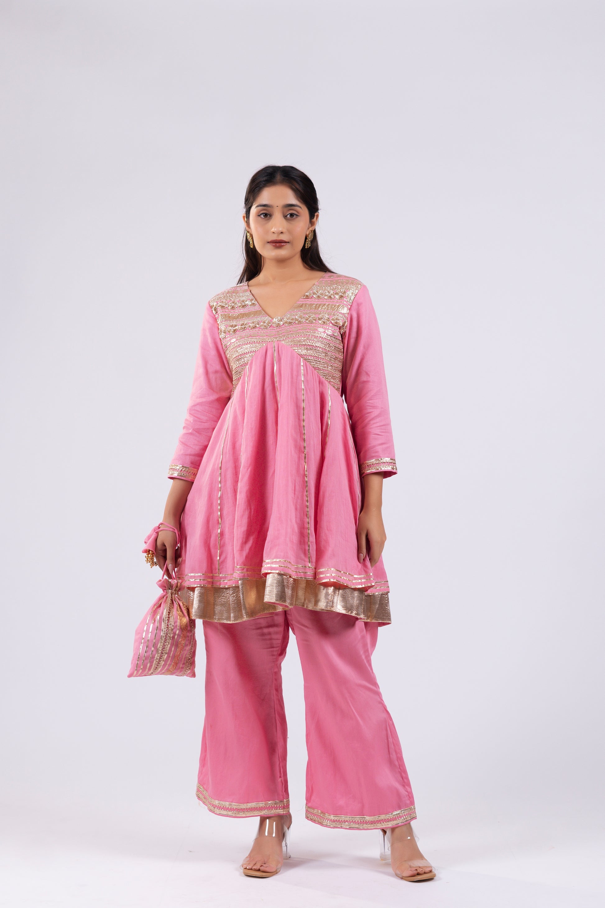 Make a statement in this candy pink kurti set from Indrani store, designed for a chic contemporary appeal. The layered short kurti features a gorgeous flare, perfectly paired with stylish bell-bottom pants for a modern, fashion-forward silhouette. Delicately embedded with tui and lampi embroidery, the ensemble reflects fine craftsmanship with a playful elegance. Complete with a matching dupatta and coordinating potli, this set is ideal for festive occasions and standout celebrations.