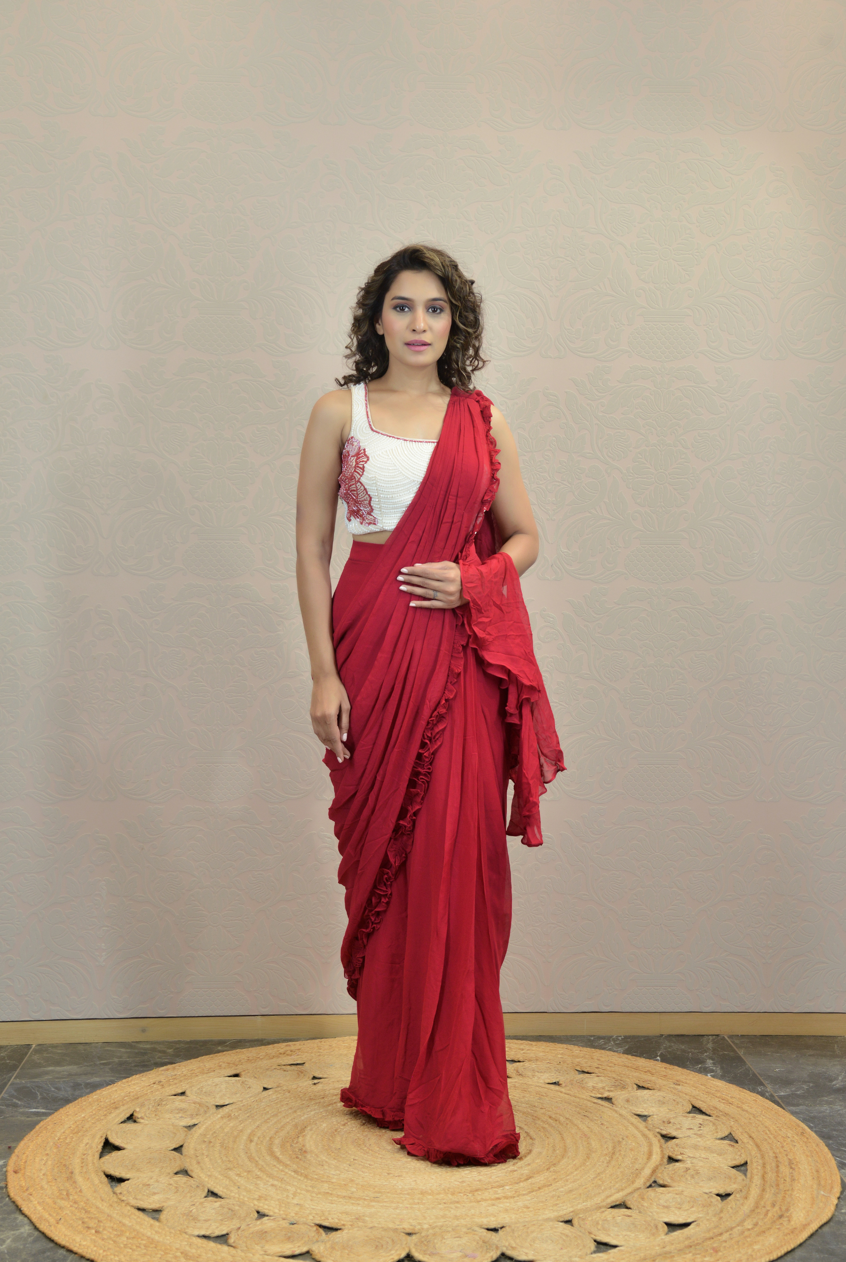 Featuring a candy red pre stitched saree georgette base from Indrani store. It comes with a contrasting white embroidered sleeveless blouse.