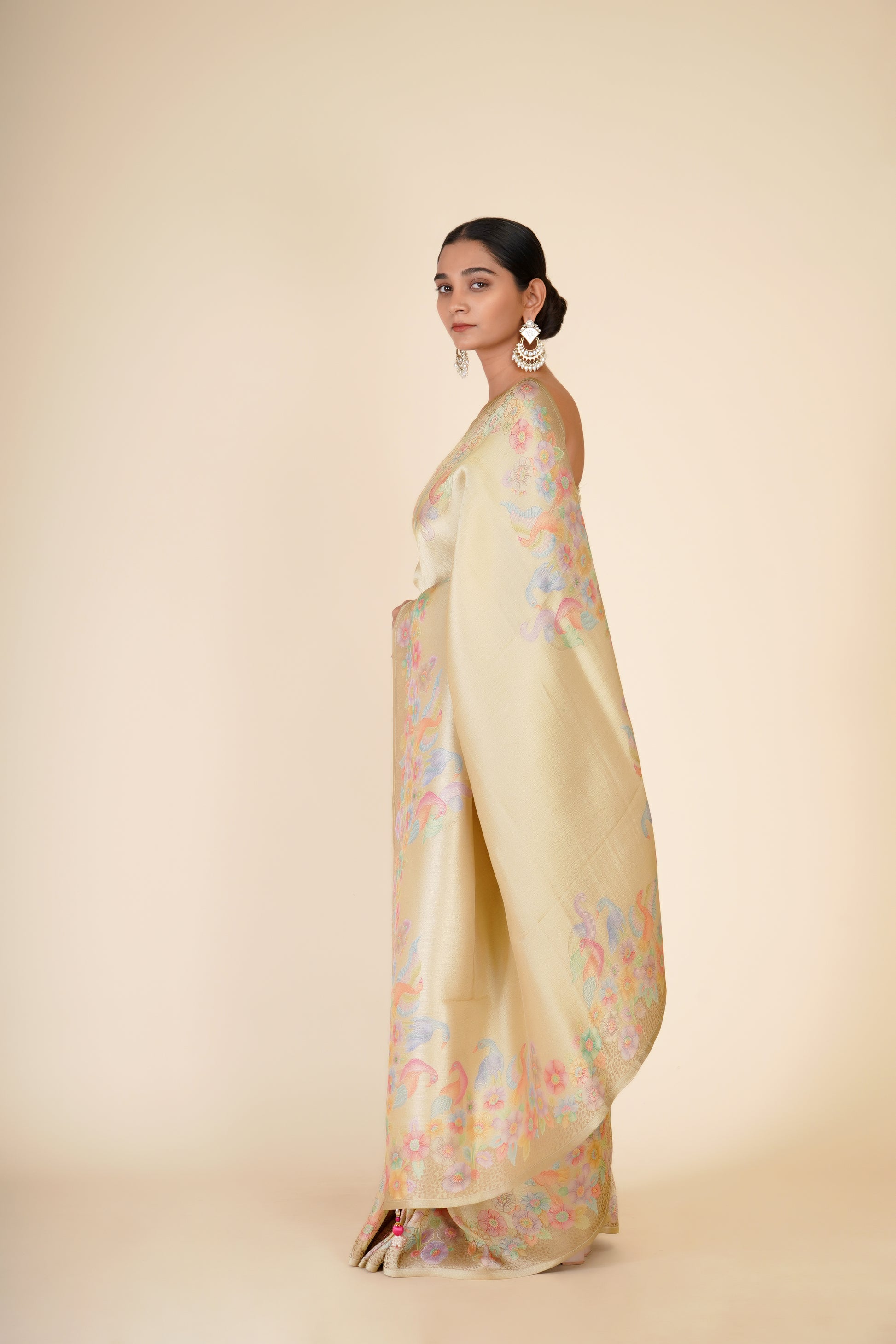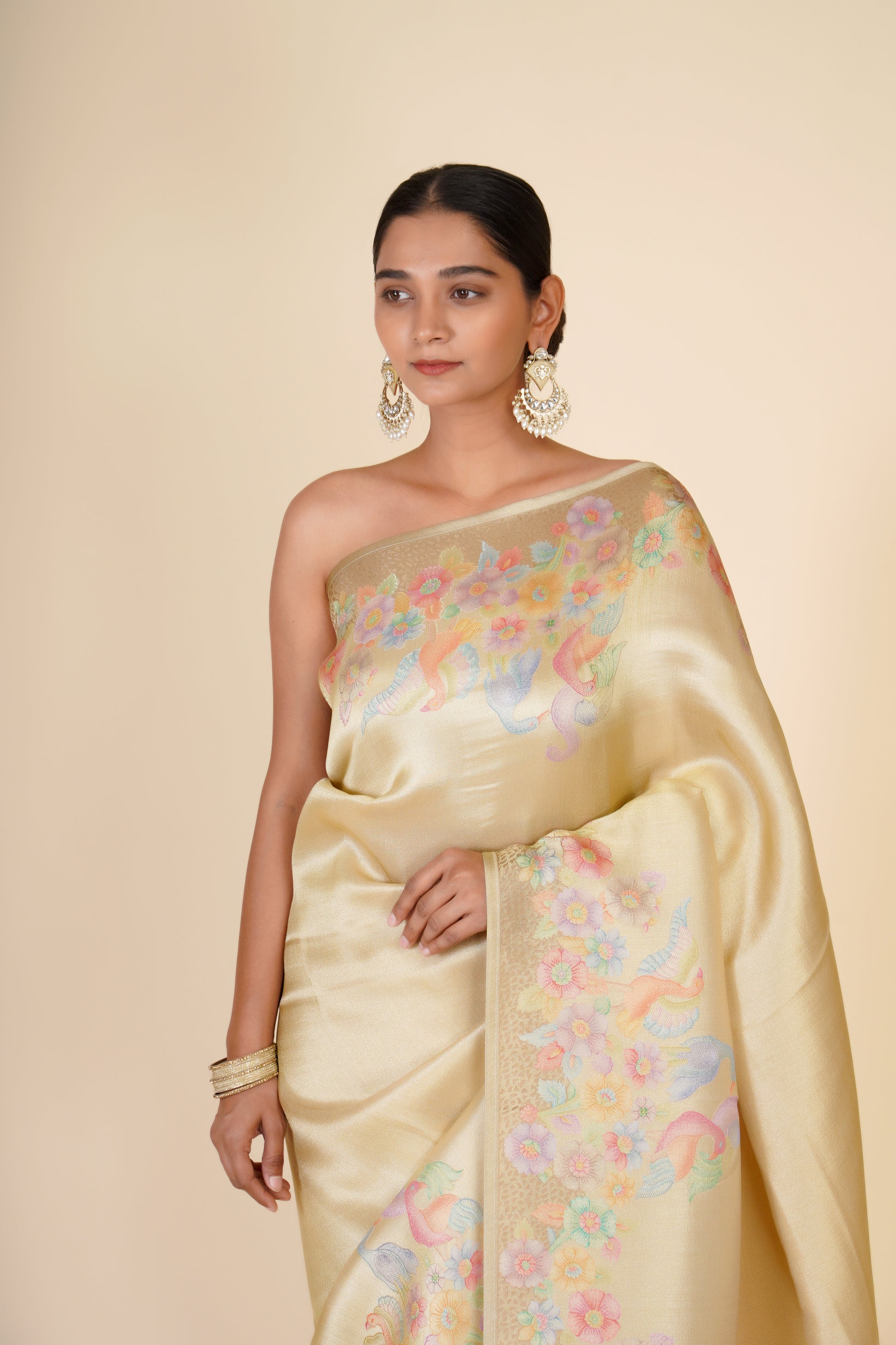 Featuring this stunning champagne gold saree in tissue fabric from Indrani store. The saree has a beautiful multi color pattern in the border. The saree has a radiant shine all over with plain blouse material.