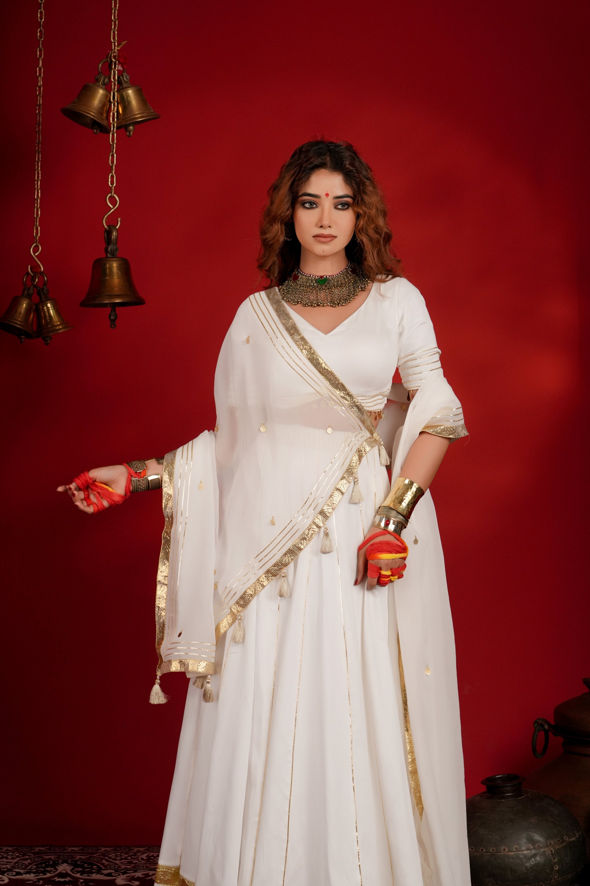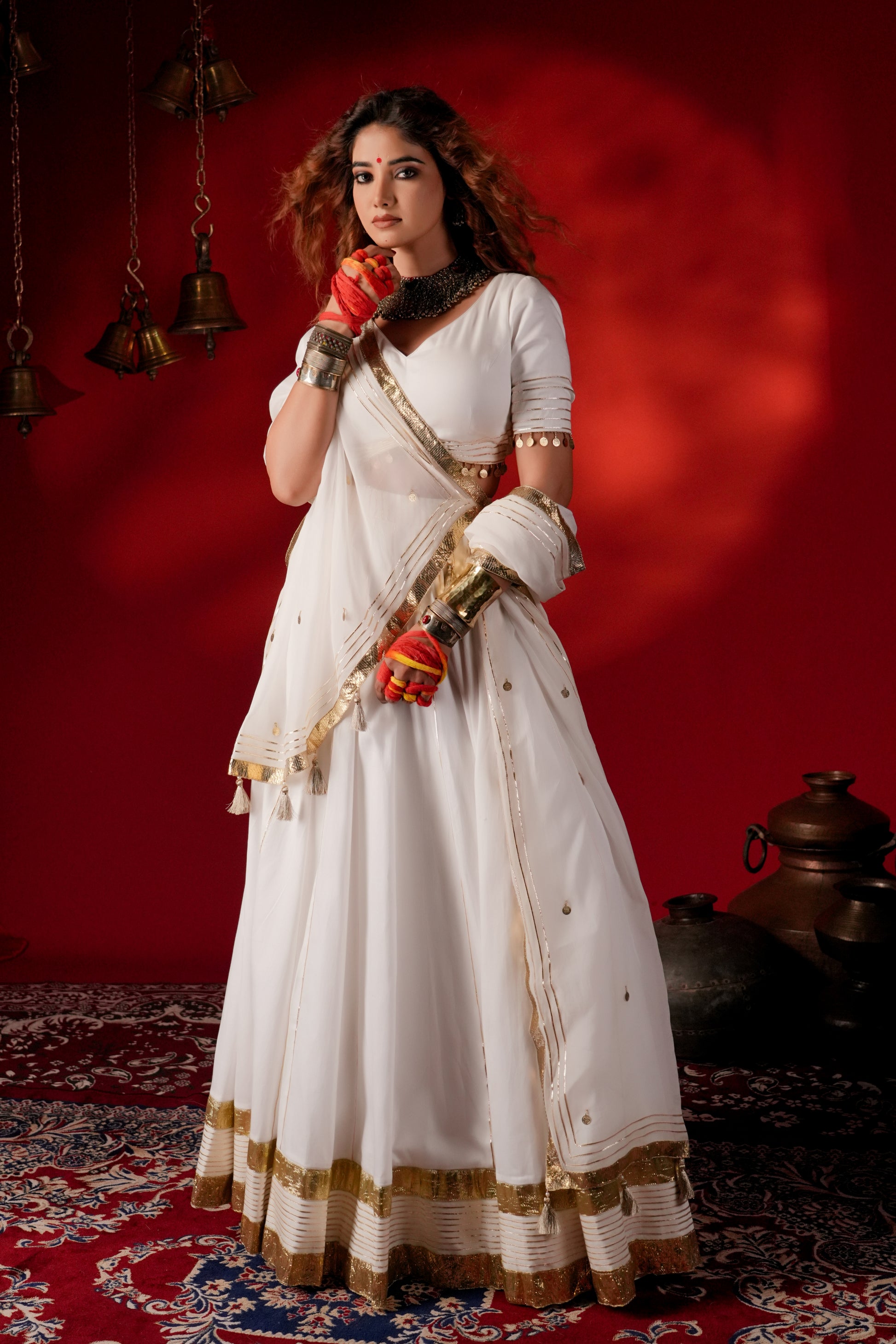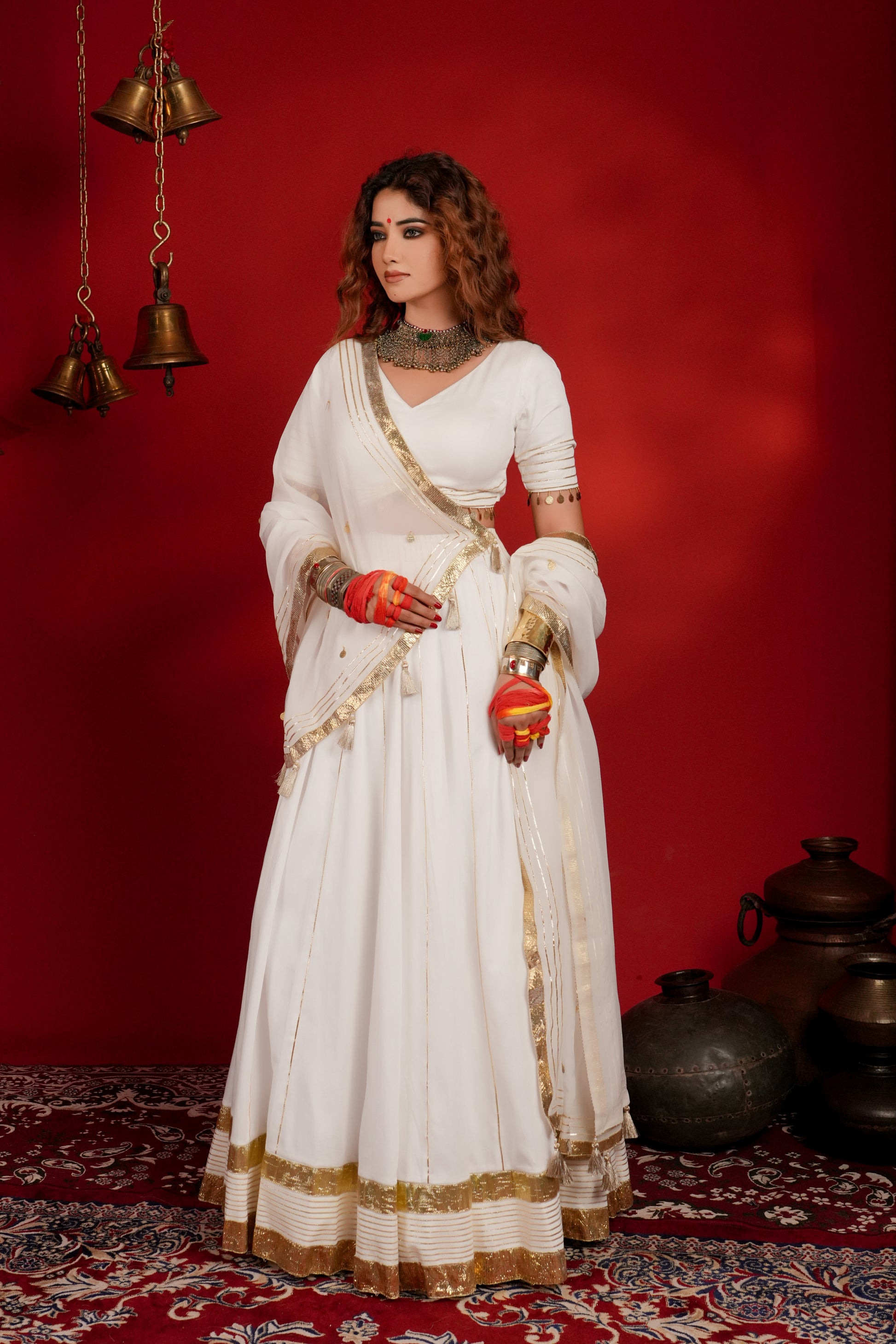 Indulge in the sophisticate white lehenga in cotton satin fabric from Indrani store. The lehenga has beautiful two layer with gota patti & lampi skirt border all over with tassel detailing. The lehenga is paired with matching blouse and embroidered dupatta. The lehenga’s 12-meter flare creates a breathtaking silhouette—elegant, graceful, and truly captivating, whether you're swirling to the beats of Garba or revelling in the festive fervour.