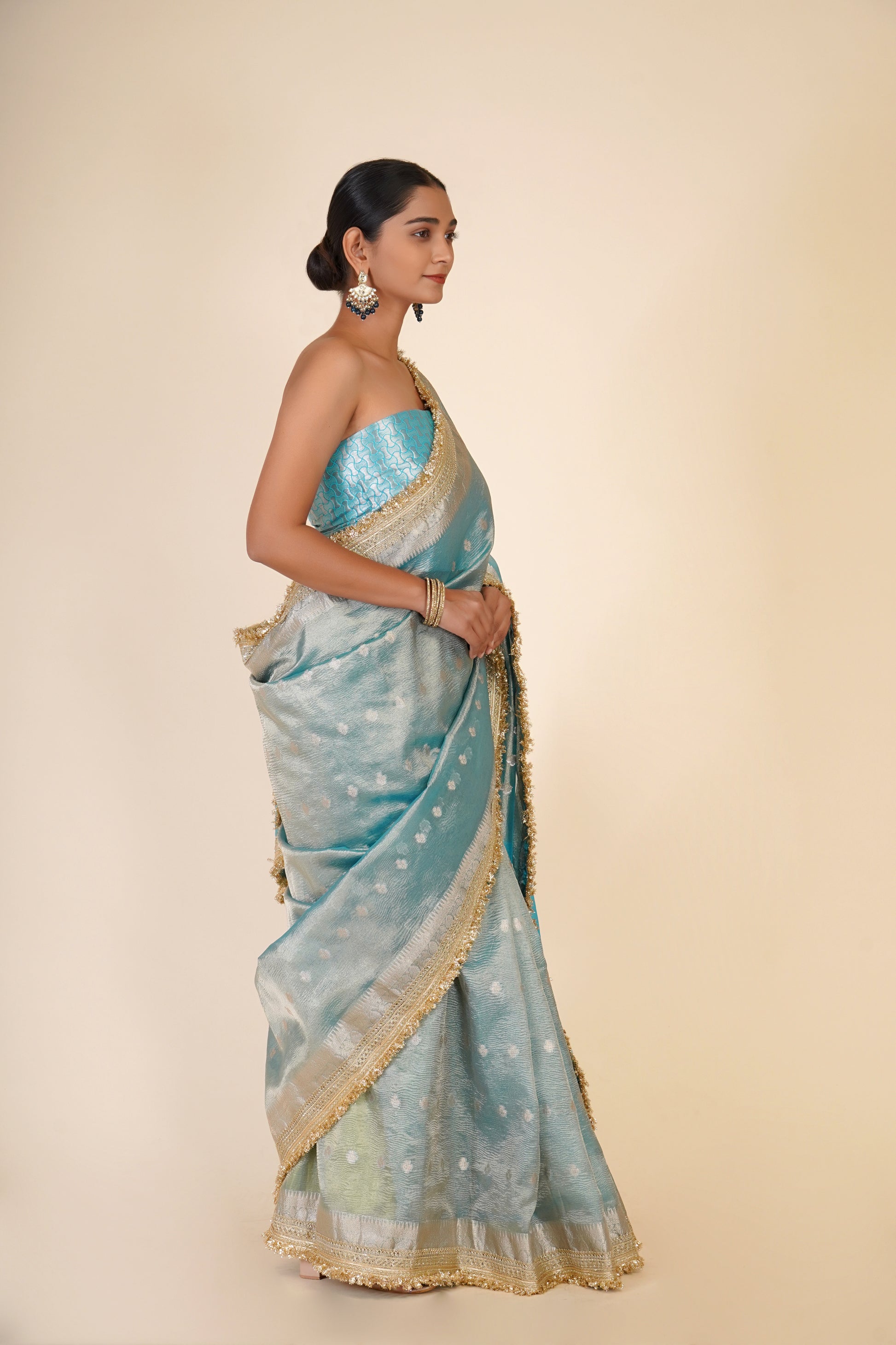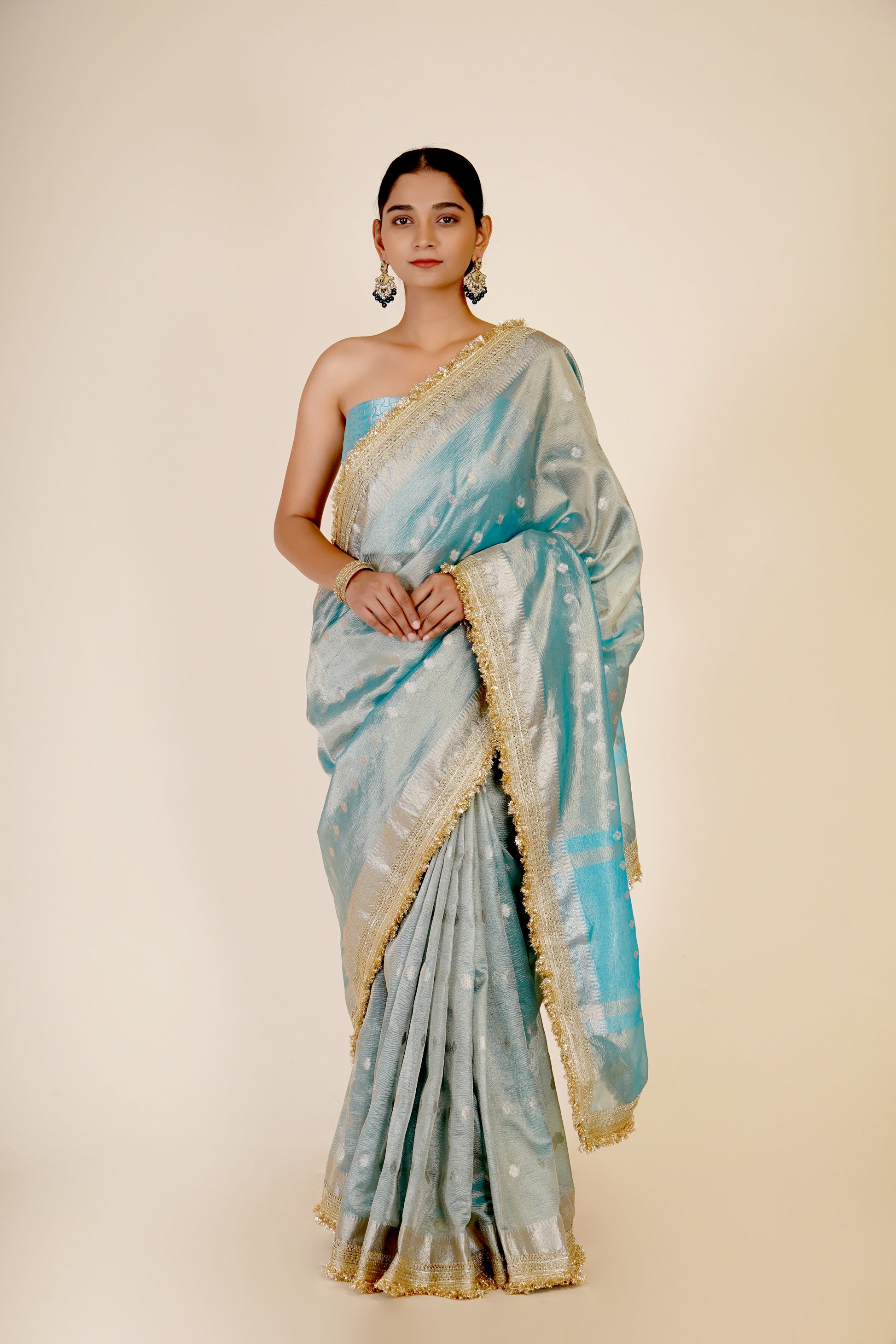 Adorn this beautiful cyan blue saree in tissue organza fabric from Indrani store. This elegant saree has sheen in it with silver zari buttas making it perfect for any special occasion. This saree comes with a matching unstitched brocade blouse material.