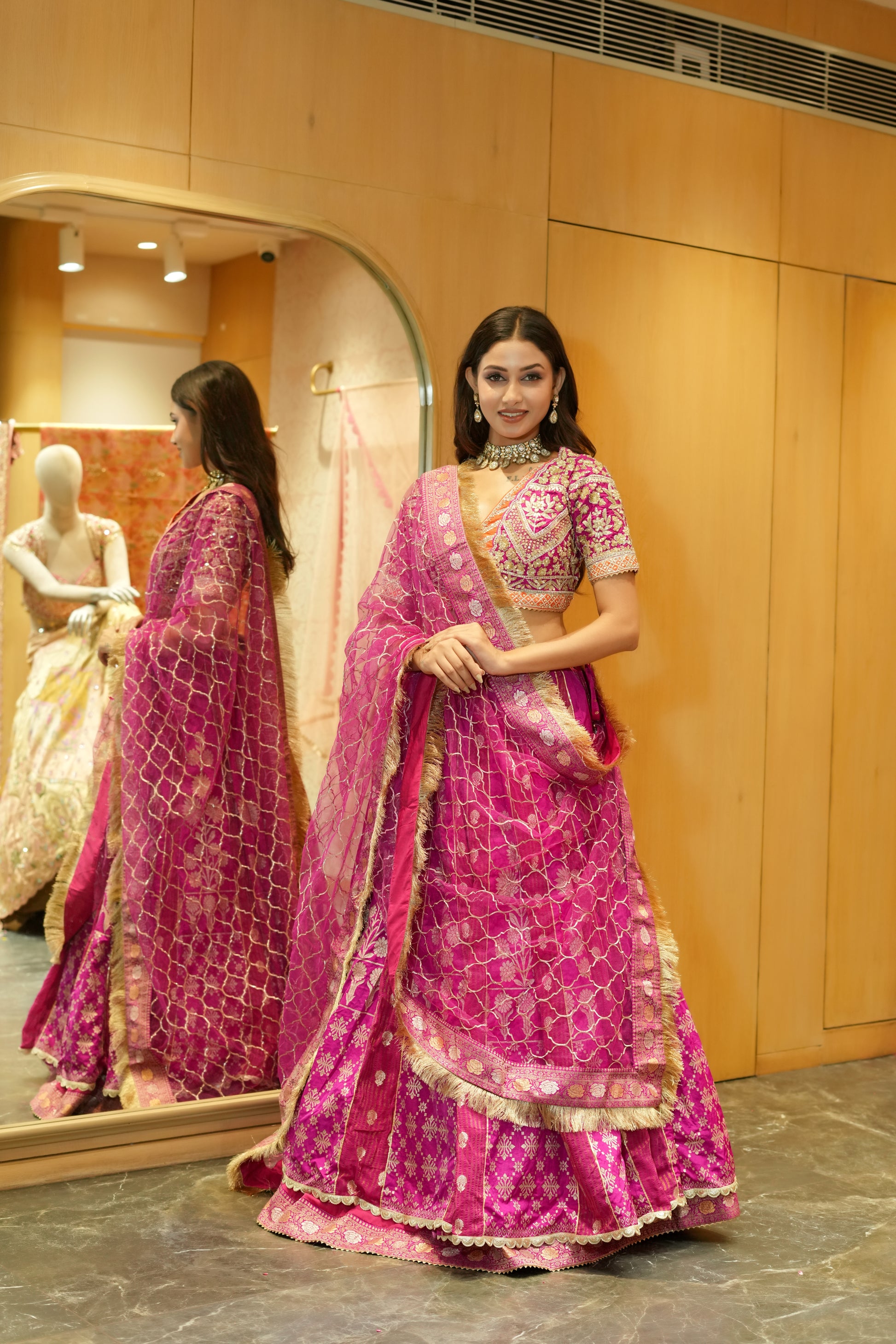 Introducing this vibrant rani pink lehenga in banarasi silk fabric from Indrani store. It is accentuated with exquisite embroidery of toi & zardosi. The skirt has beautiful multi kali pattern all over with Banarasi weaving. It comes with matching heavy embroidered blouse and a embedded net dupatta.