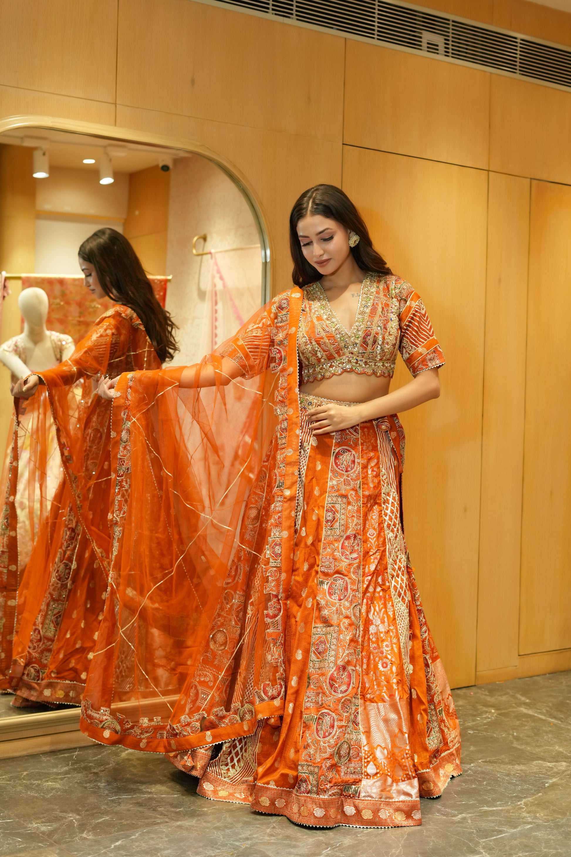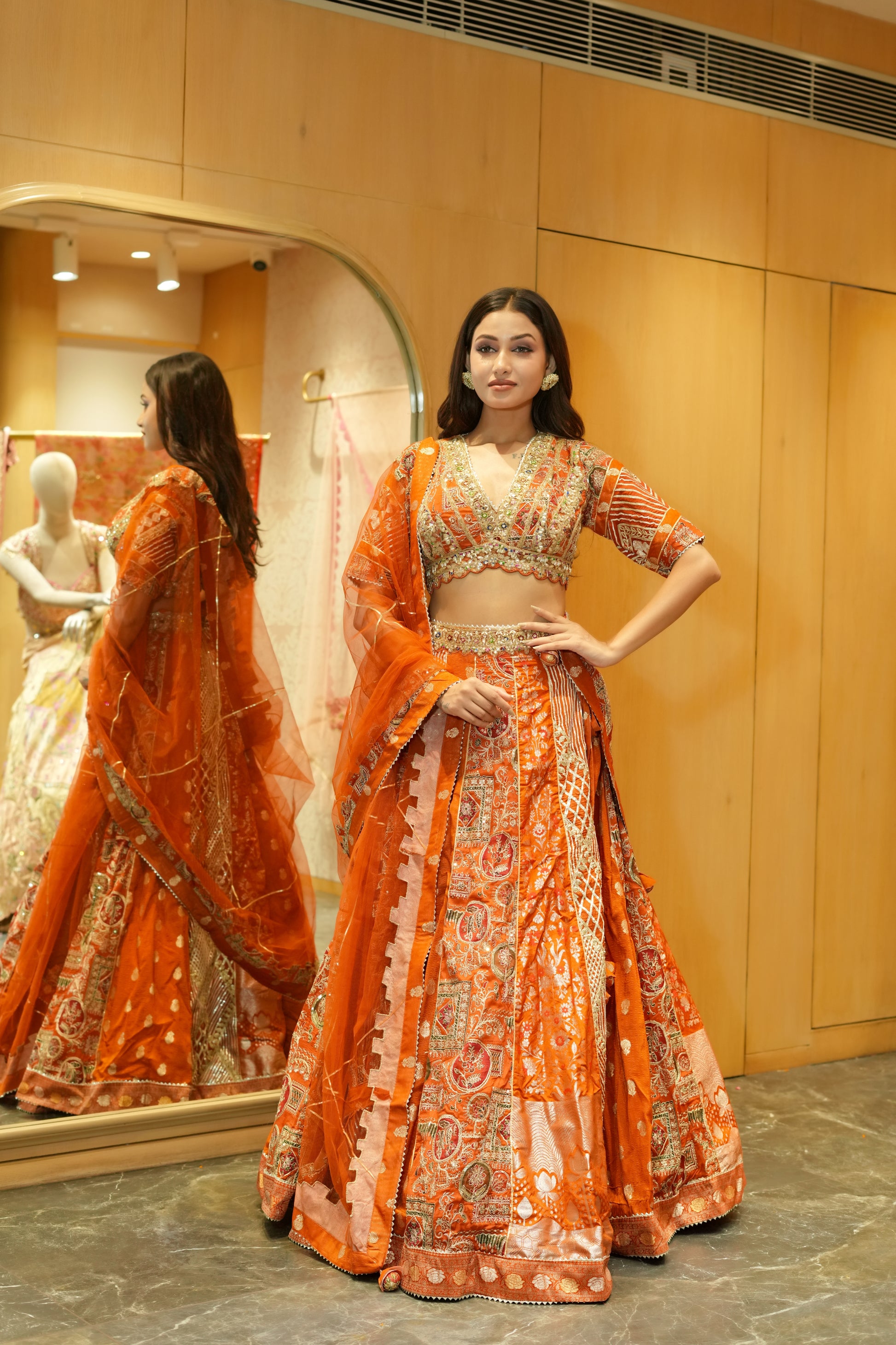 Introducing this striking Spanish orange multi kali lehenga in multi fabric from Indrani store. The lehenga is adorned with different kalis all over. It comes with a matching heavy embroidered lehenga and a embedded net dupatta.