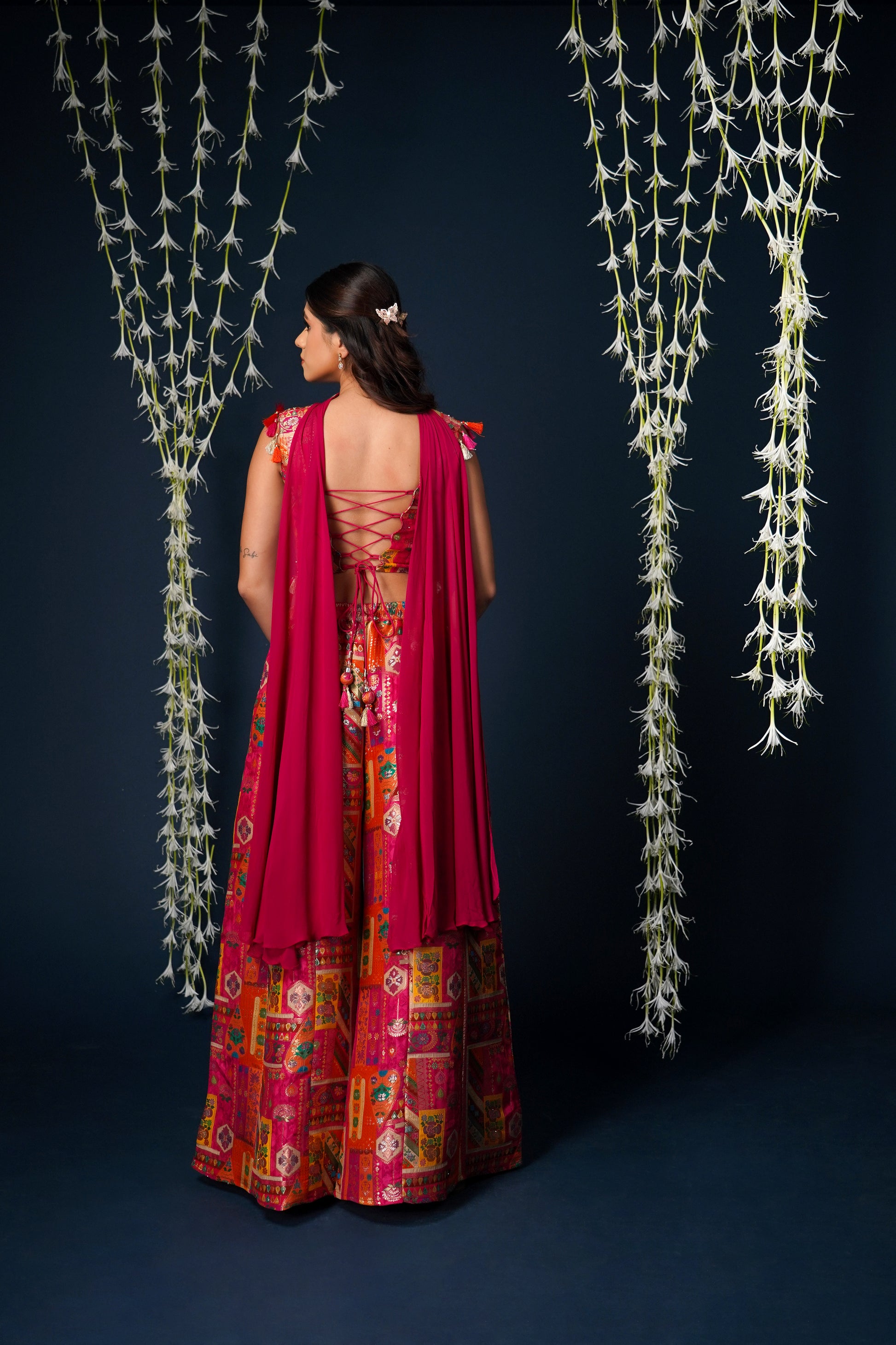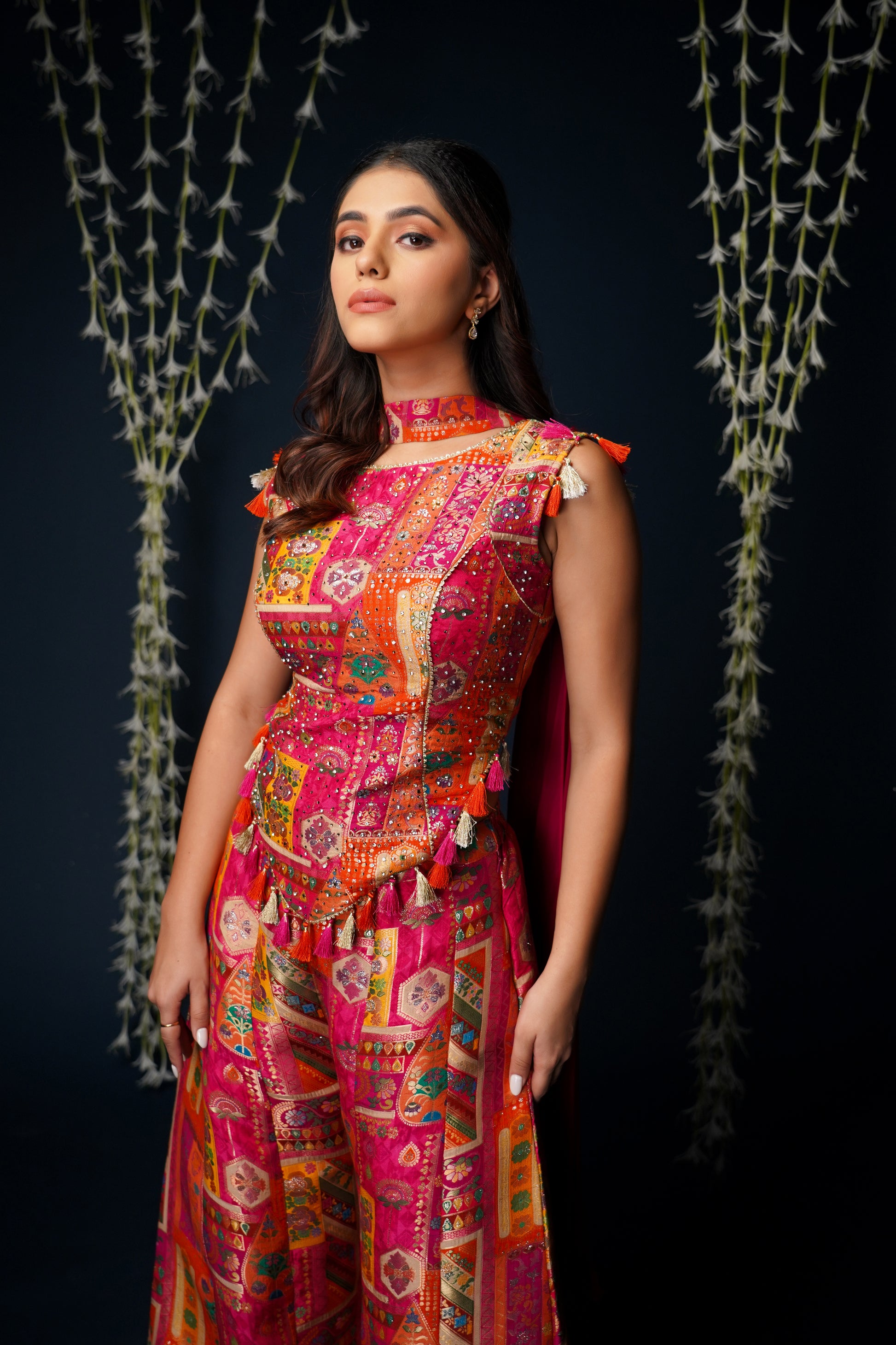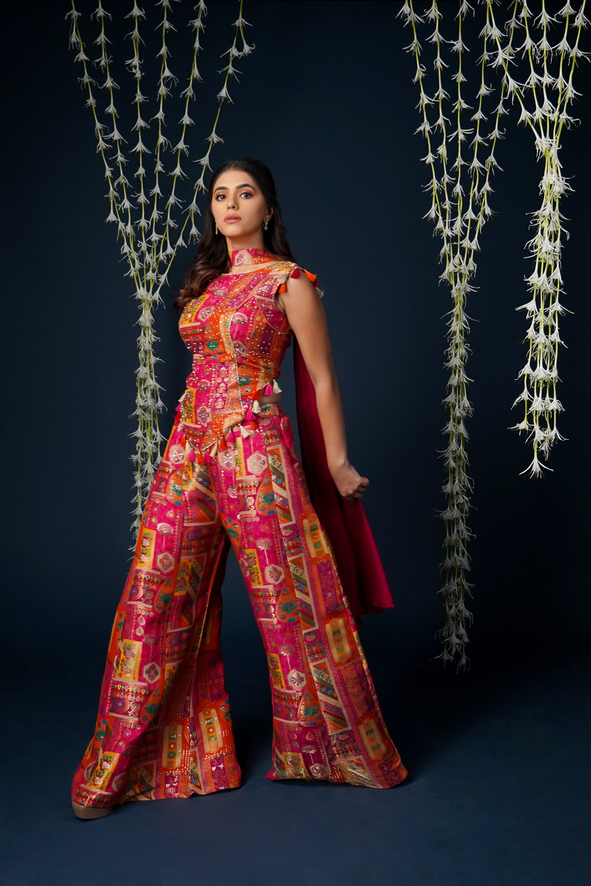 Presenting fresh and vibrant banarasi soft silk indo-western set from Indrani store. It is crafted with banarasi brocades all over. It comes with corset blouse and a georgette pink dupatta.