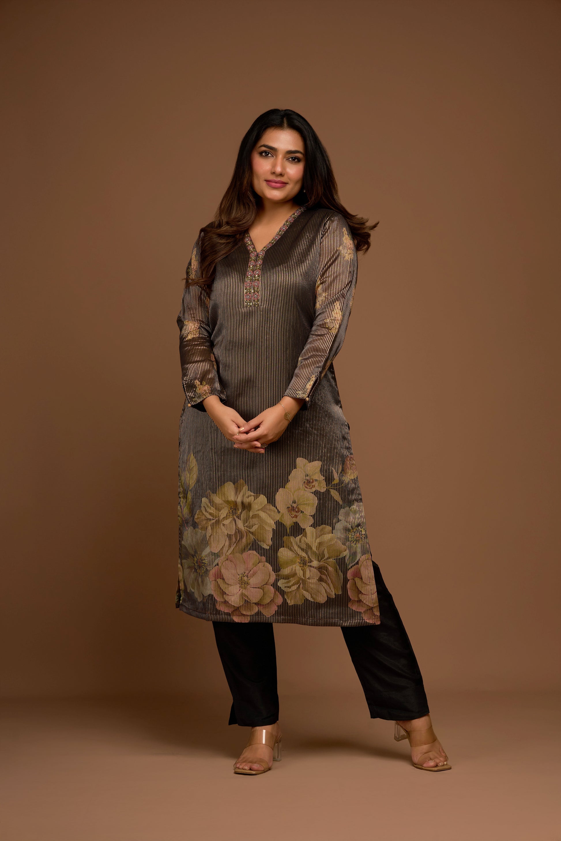 This black tissue kurta set is perfect combination of modern silhoutte from Indrani store. This ensemble has intricate sequins and cutdana work with floral motifs and golden weaving on the kurta paired with matching pants. It comes with a tissue dupatta with floral motifs and gold weaving overall giving it subtle, elegant touch.
