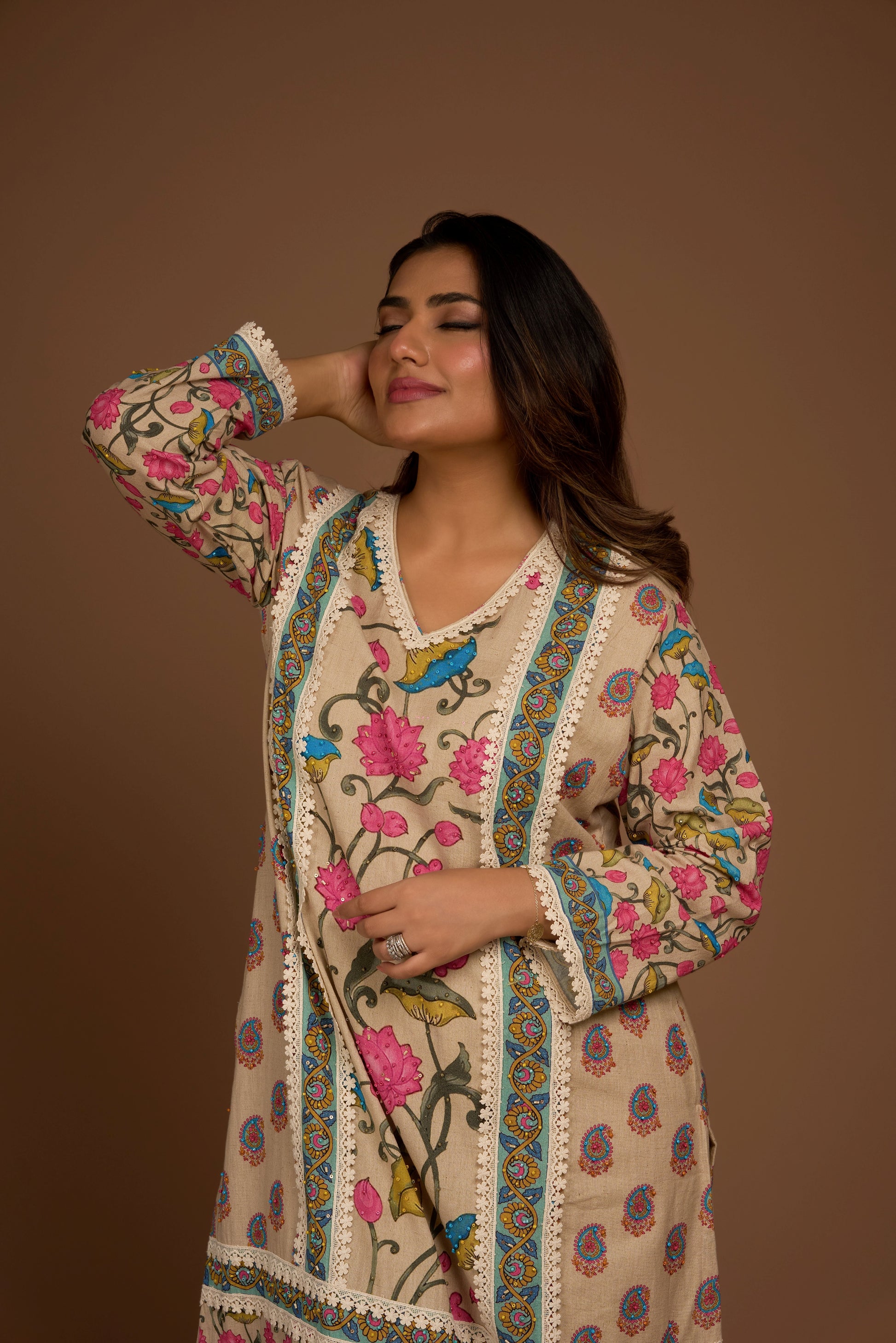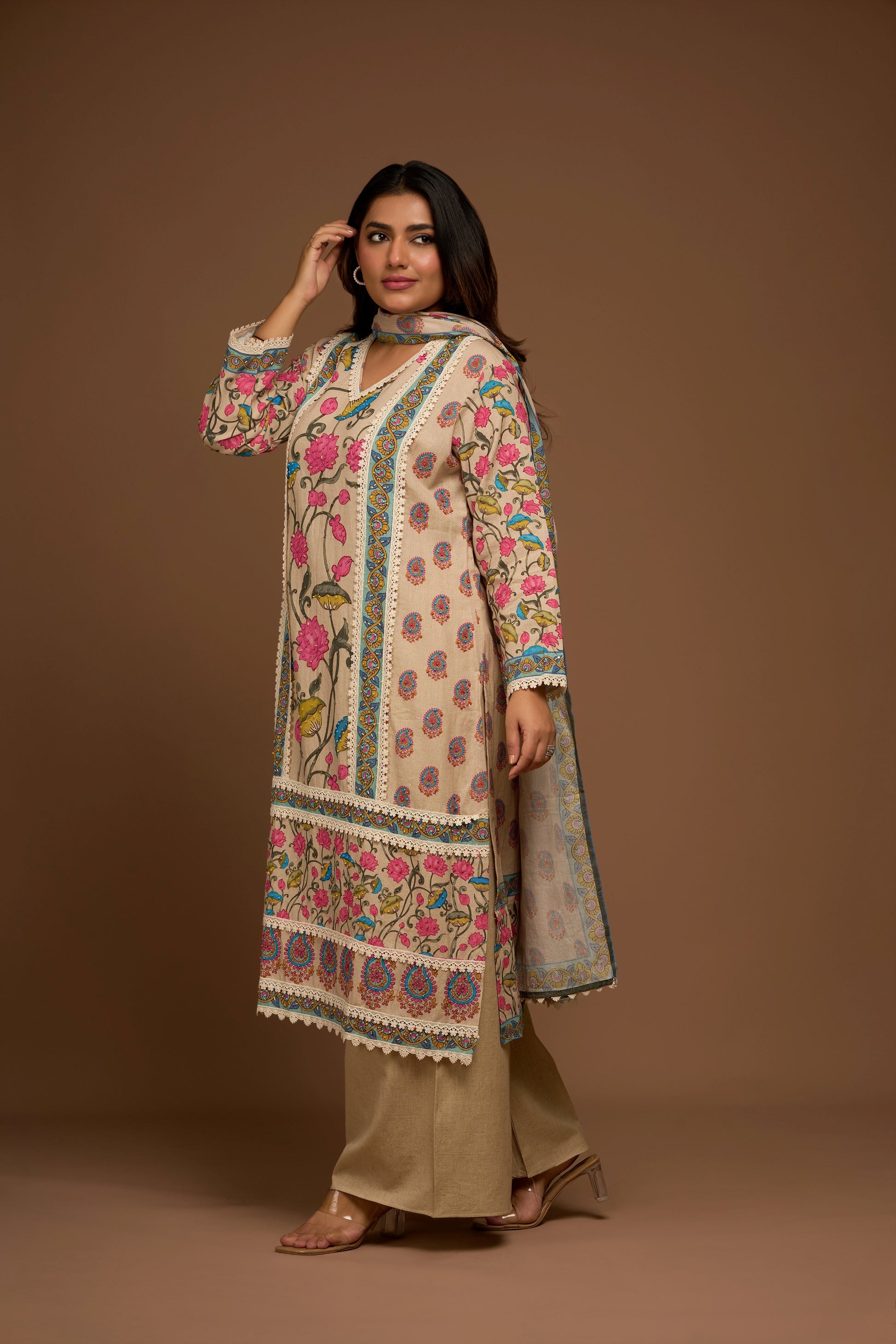 Featuring a vibrant oat color linen kurta palazzo set with dupatta from Indrani store. This ensemble features intricate floral motifs on the kurta with beads and lace work. It comes with matching palazzo and intricate motifs on the dupatta along with lace detailing for a subtle yet elegant touch.