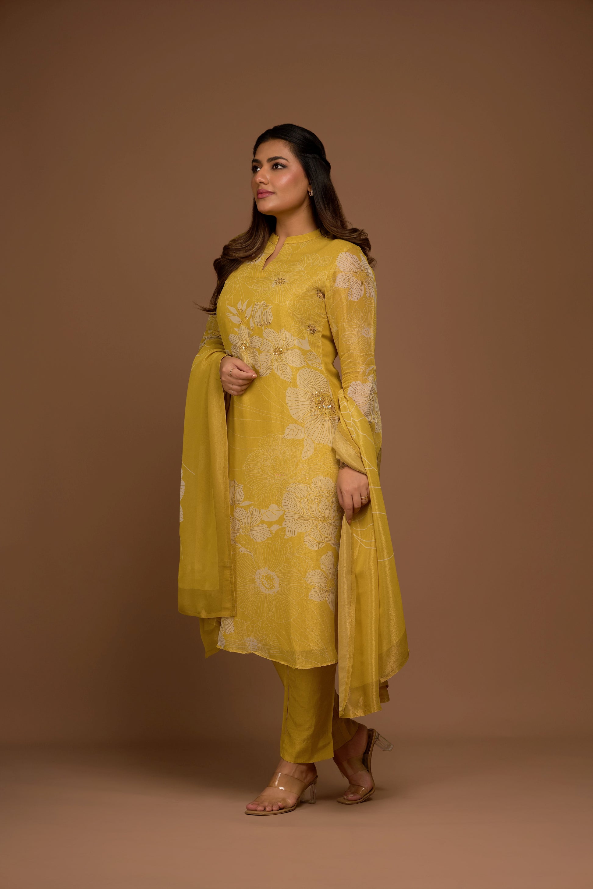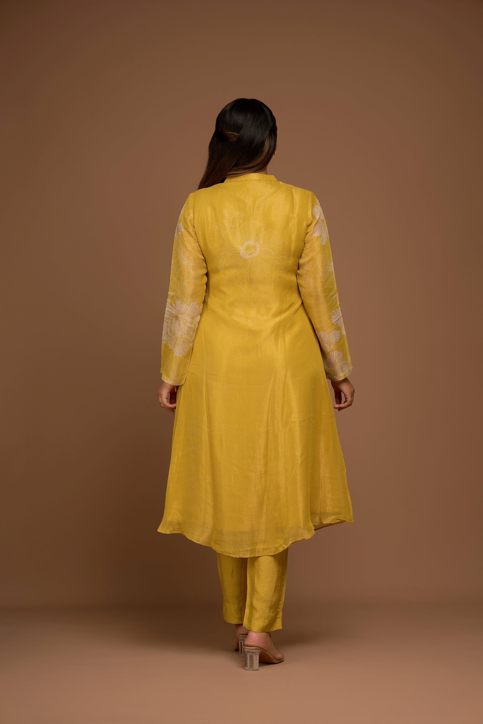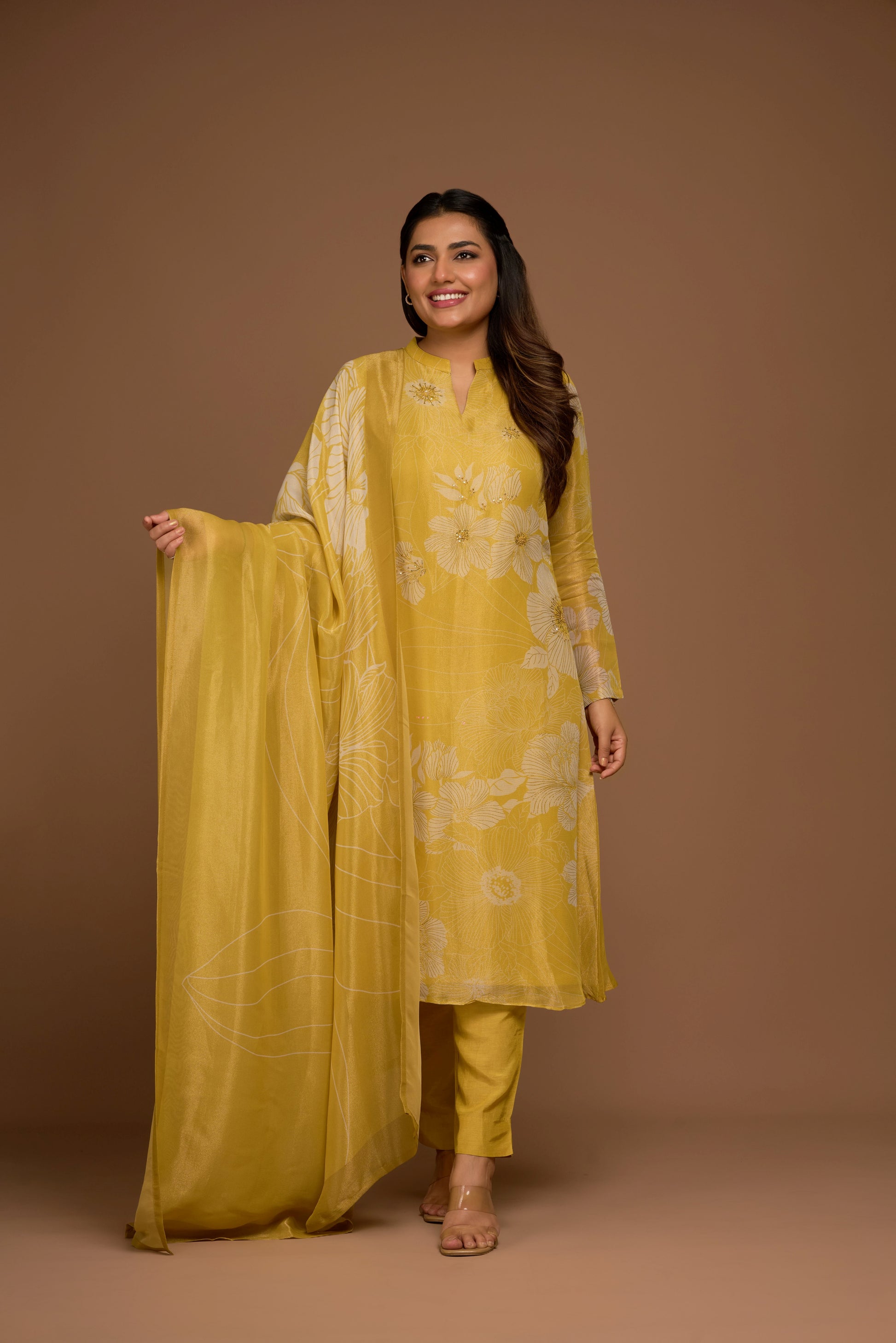 This canary yellow tissue kurta pants set with dupatta is a perfect blend of modern yet sophistication from Indrani store. The kurta set has resham and sequins work with floral motifs on it. The dupatta also has floral motifs on it making it perfect for every ocassion.
