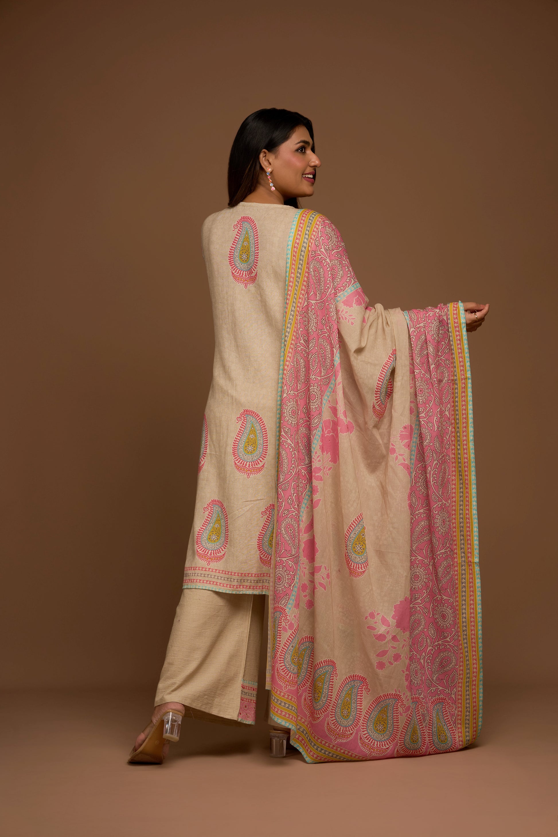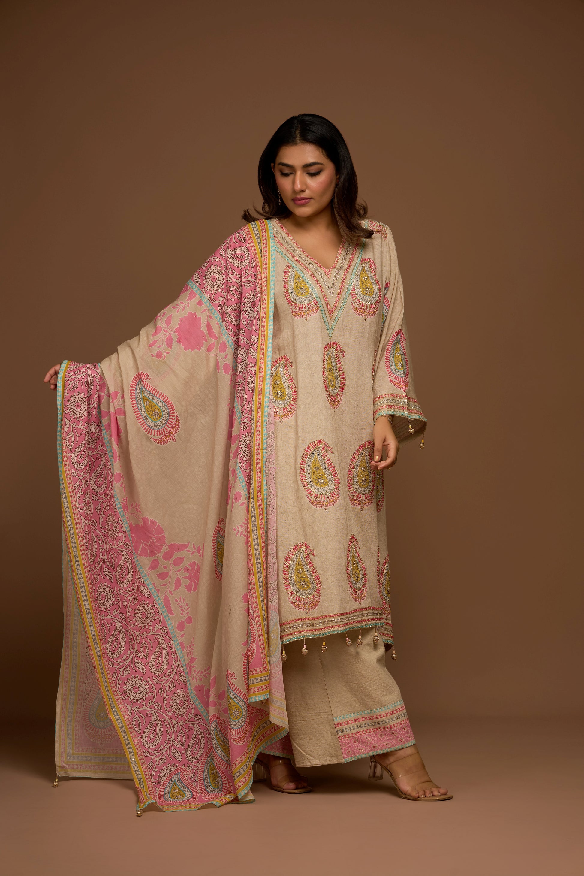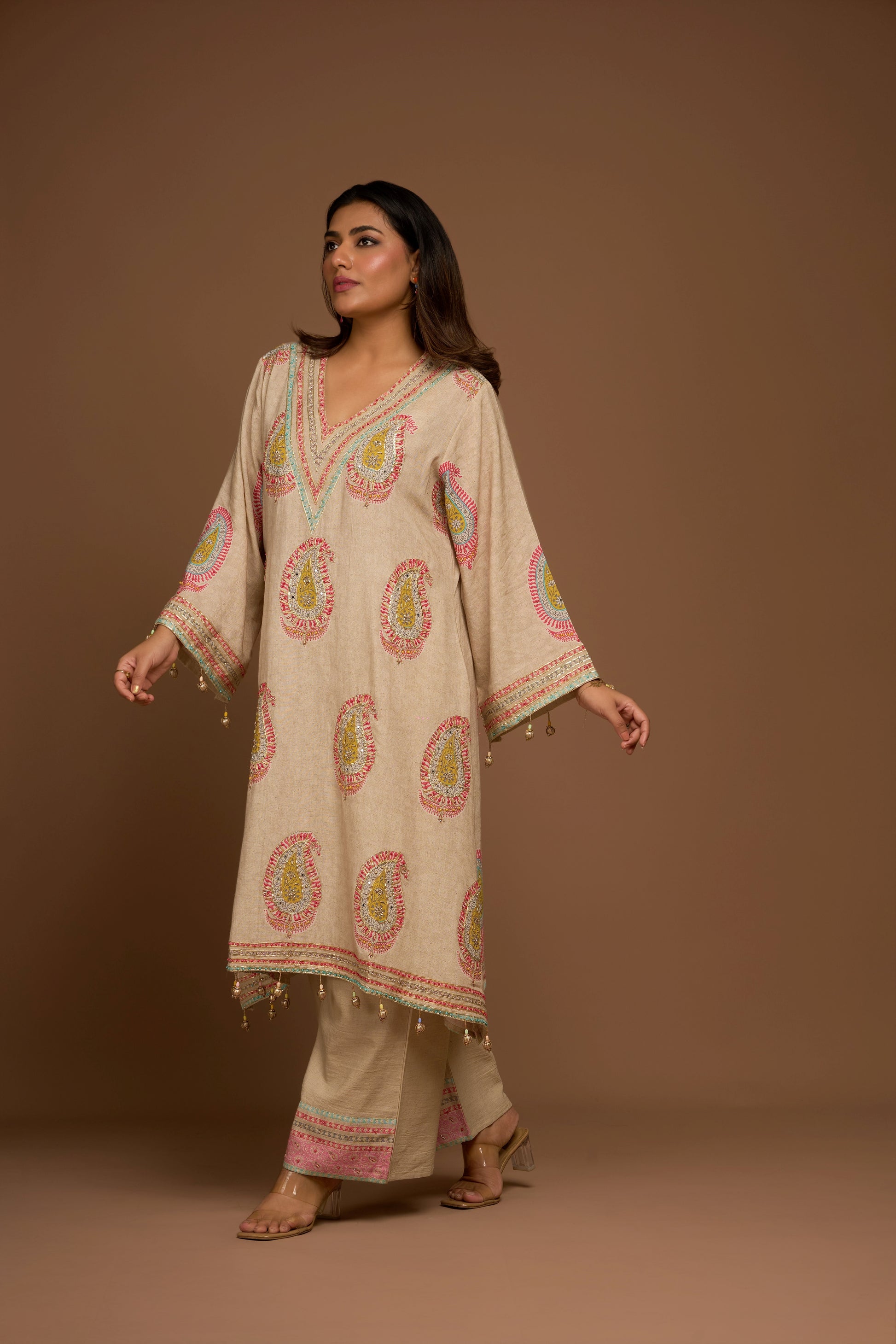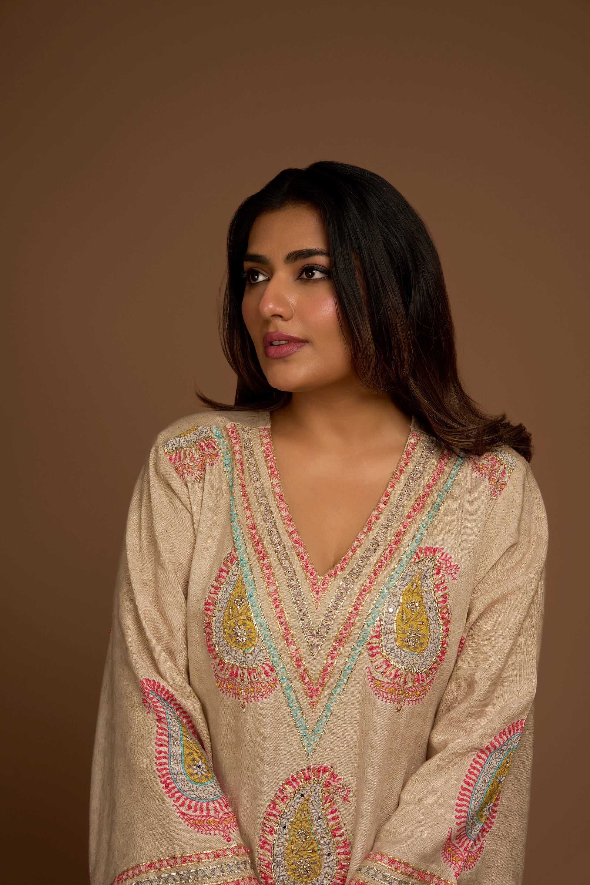 This creamish two piece set is a perfect combination of modern yet elegant silhouette from Indrani store. This ensemble has toi and beads work on the neckline as well as on the overall dress along with tassels on the sleeves and gher making it perfect for any occasion.