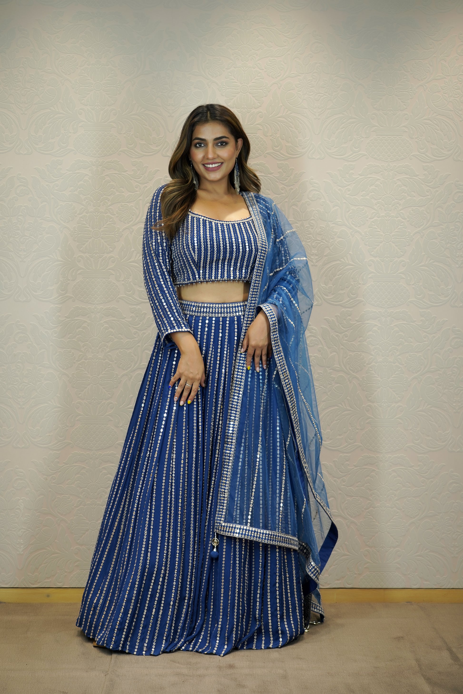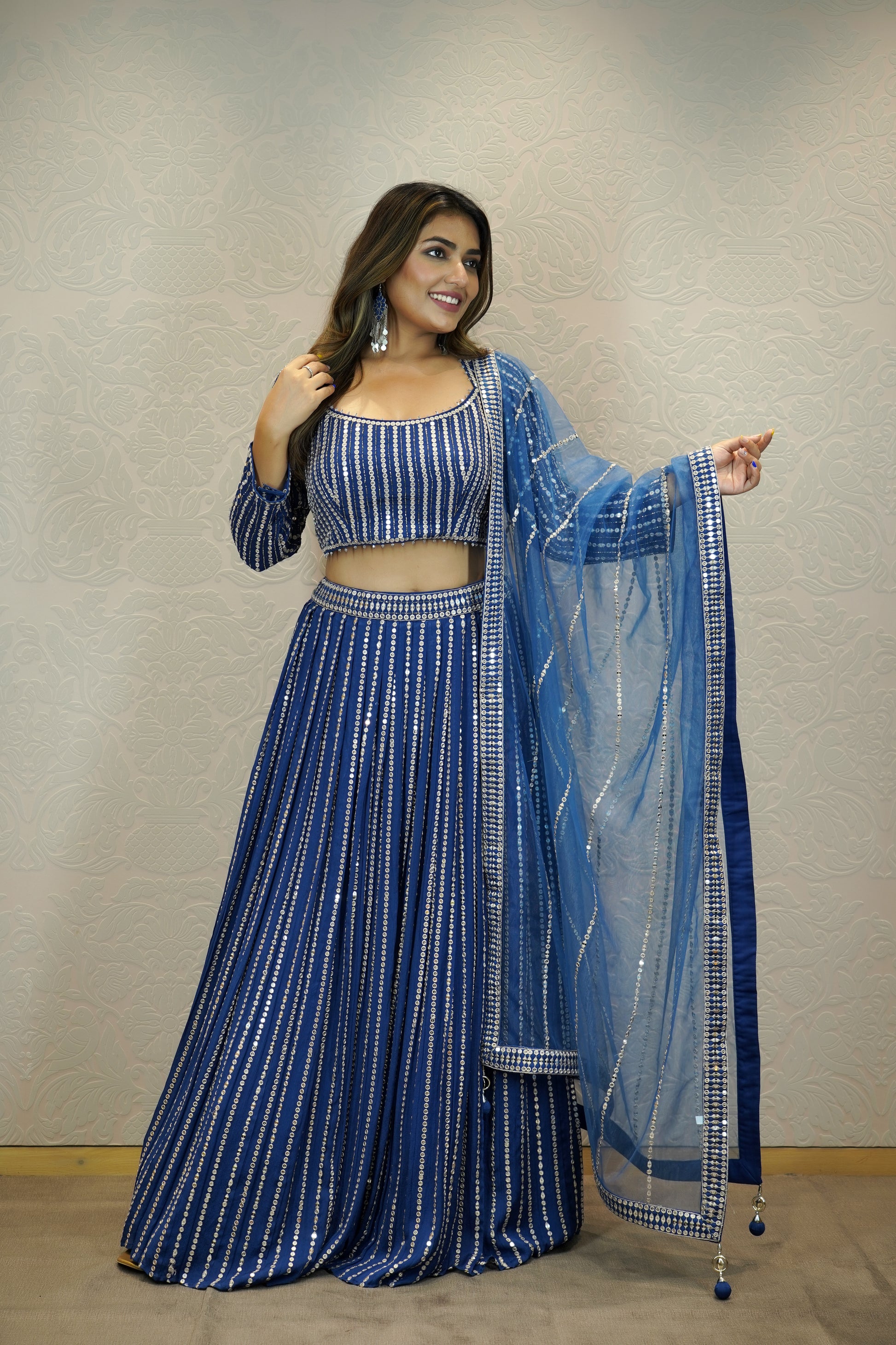 Presenting Egyptian blue heavy embroidered lehenga in chinon silk base from Indrani store. It is paired with sequined matching blouse and a net dupatta.