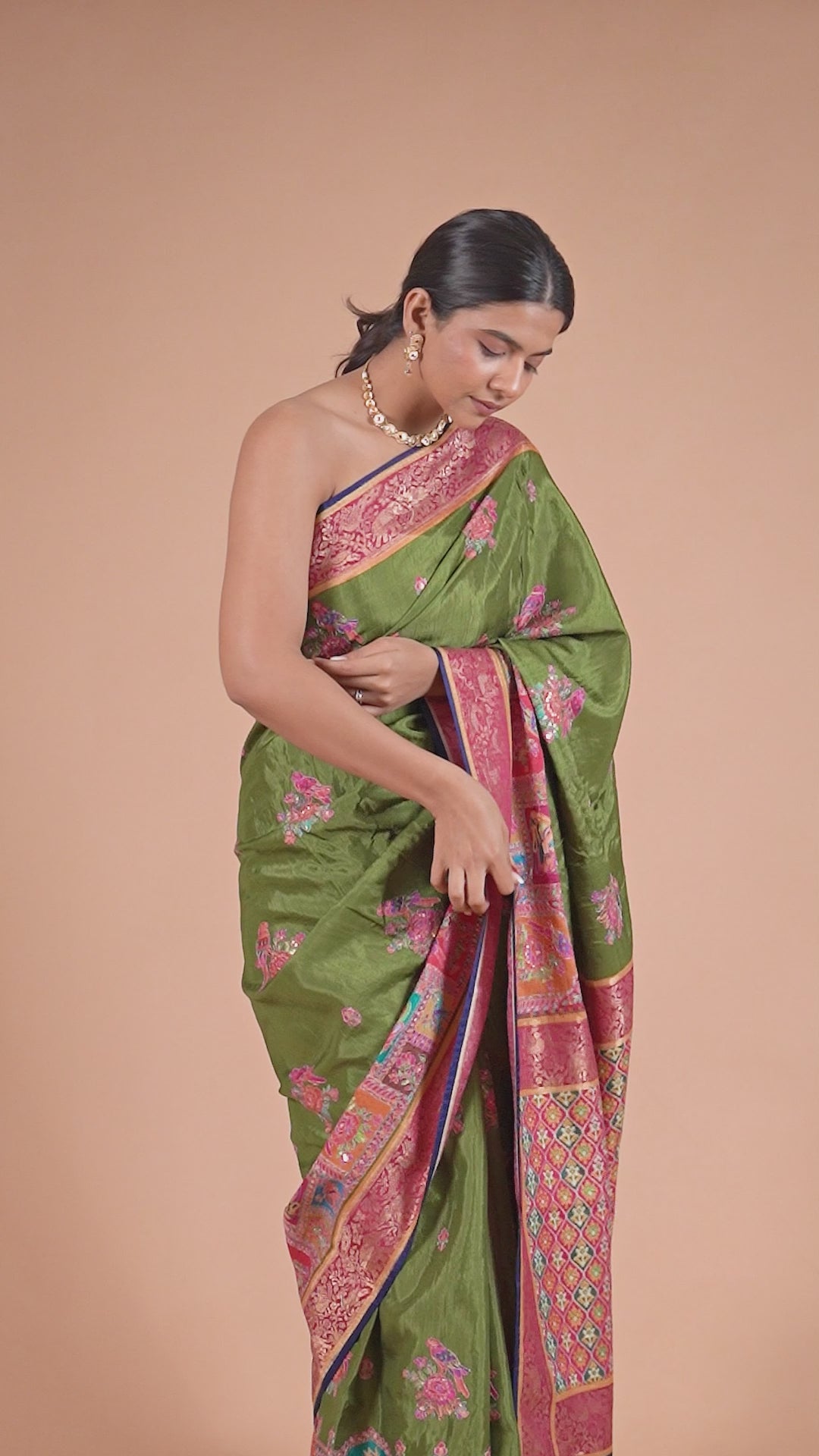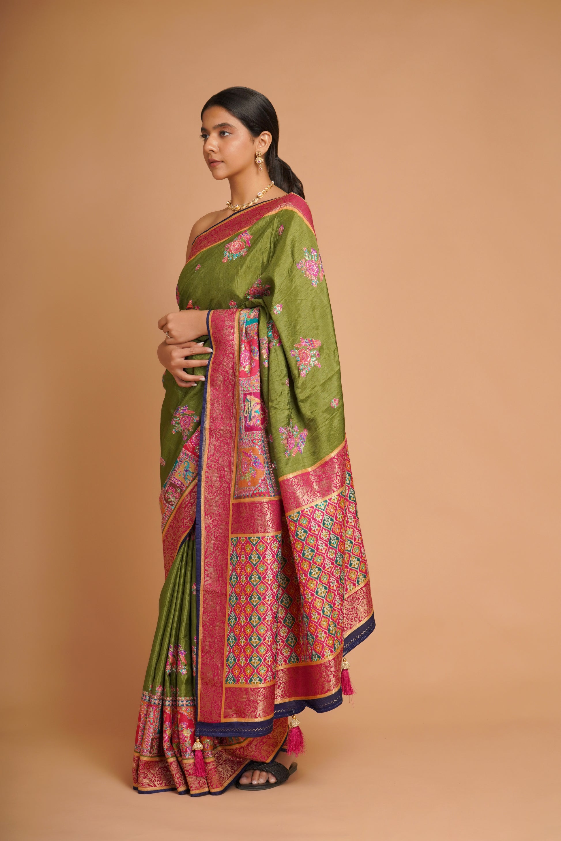 Featuring this exquisite emerald green pichwai work style saree in dola silk fabric from Indrani store. The saree has a beautiful colorful motifs all over with embroidery on it. This saree comes with a patola print blouse material, making it any ideal choice for your upcoming festivities.