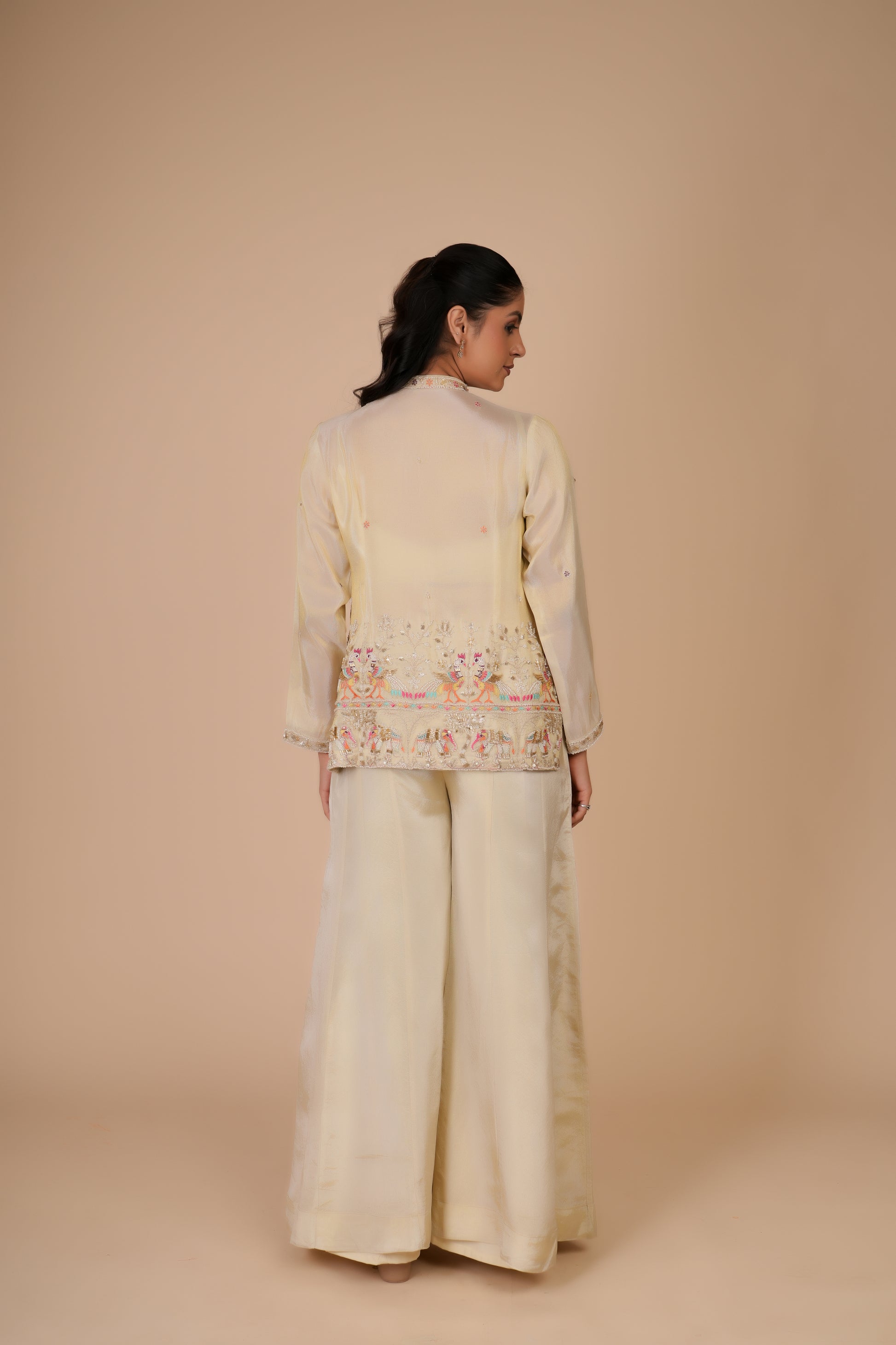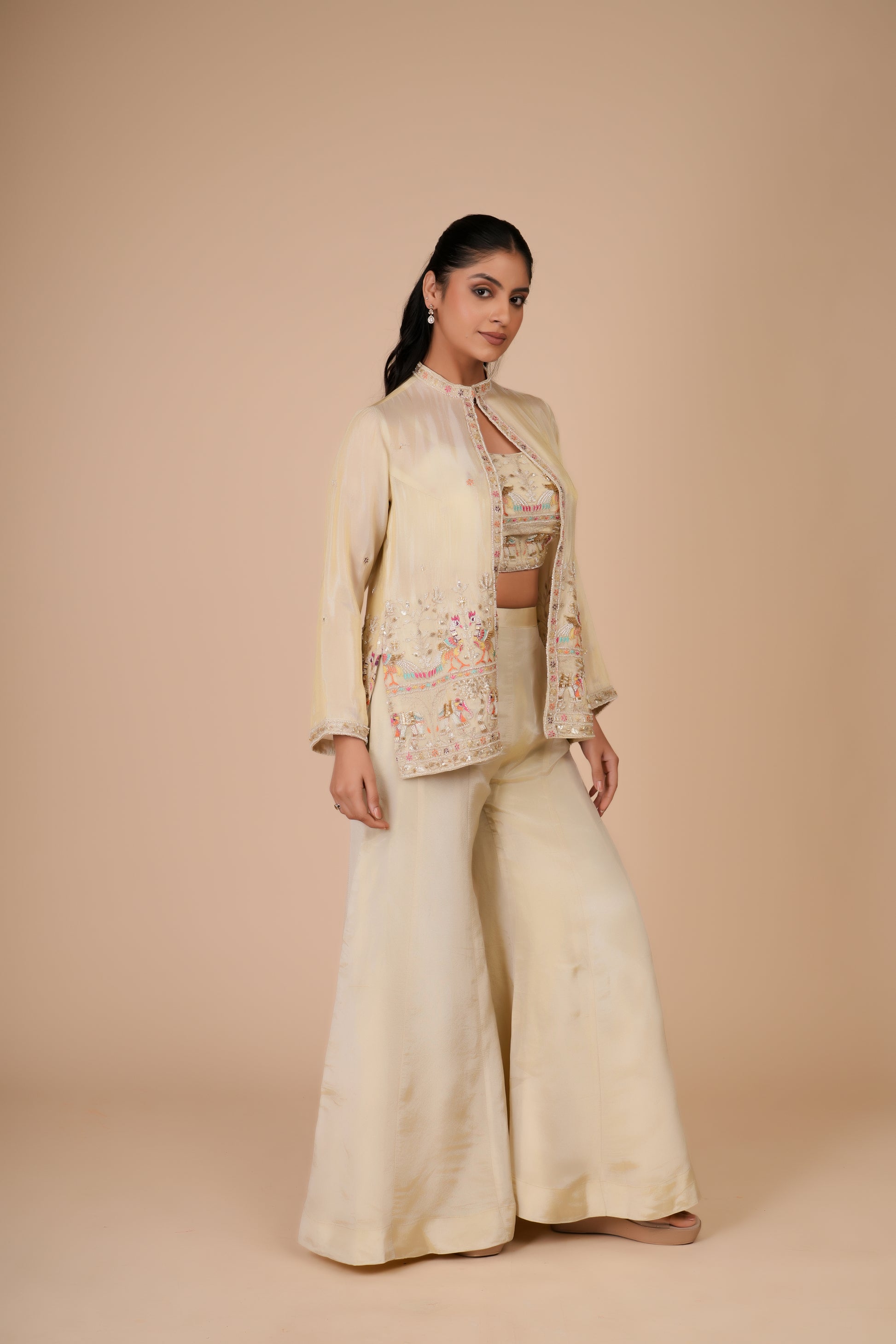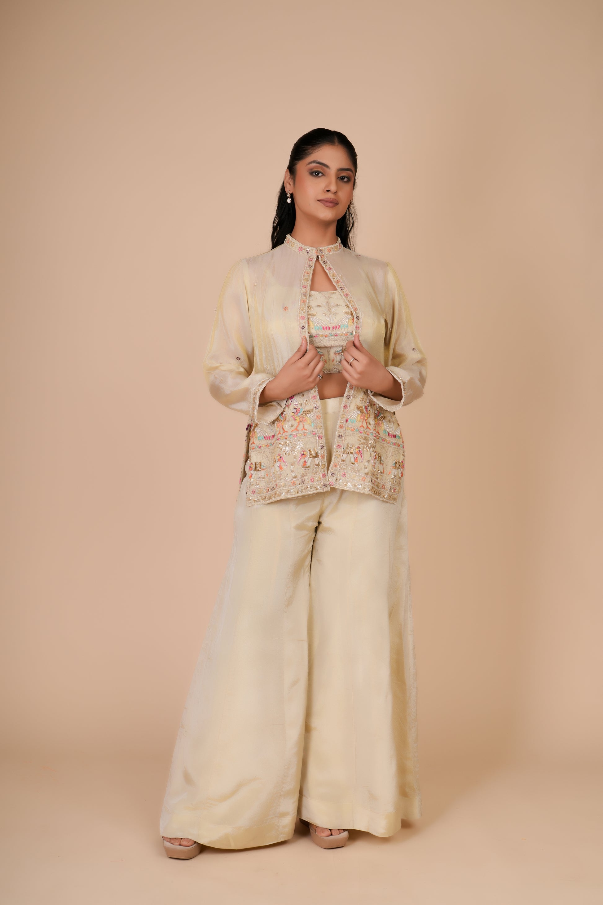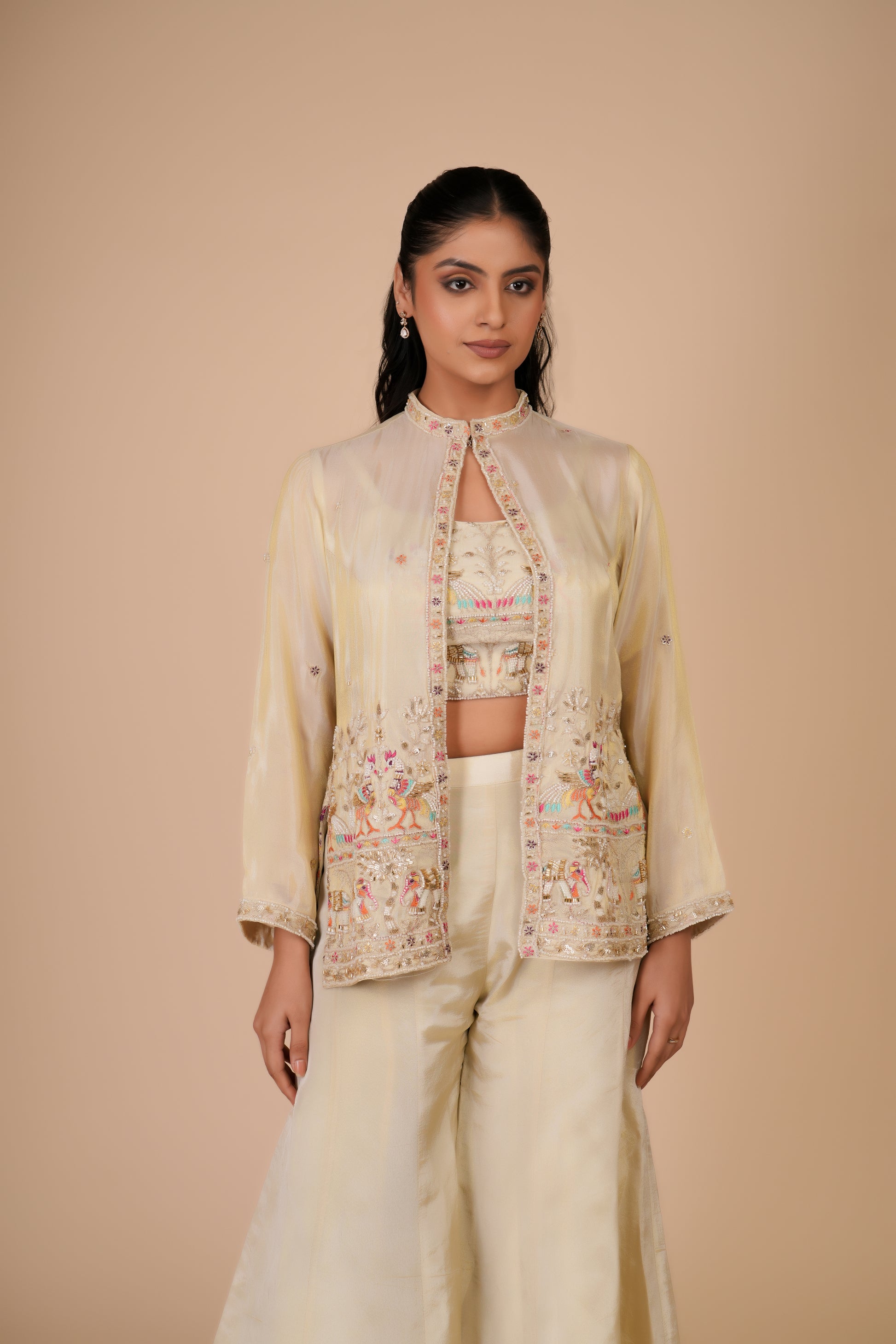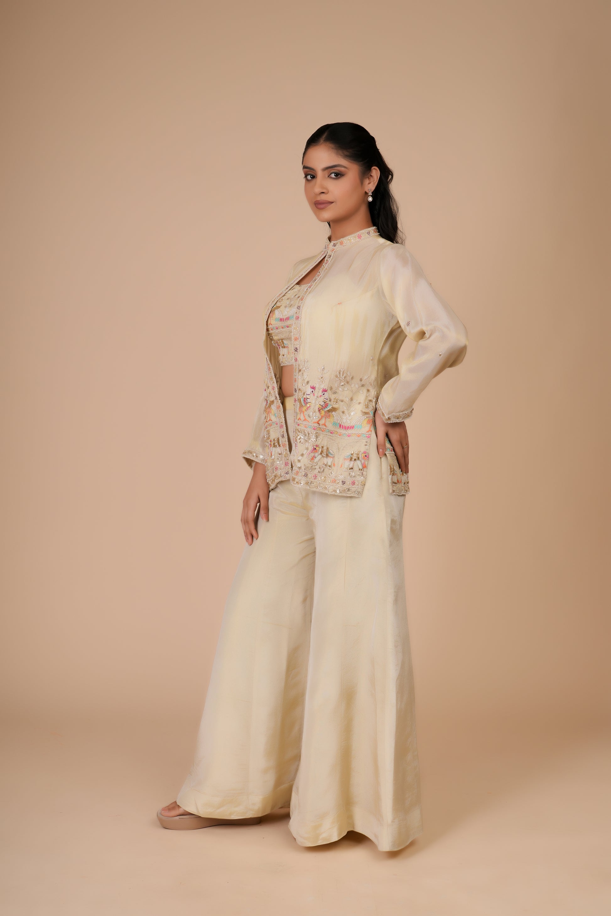Elevate your fashion quotient with this captivating cream tissue co-ord set from Indrani store. This ensemble is adorned with sequins, cut dana & pearl embroidery. The set includes a coordinating jacket with matching bustier and pants. Stand out from the crowd with this stylish & contemporary three piece co-ord set.