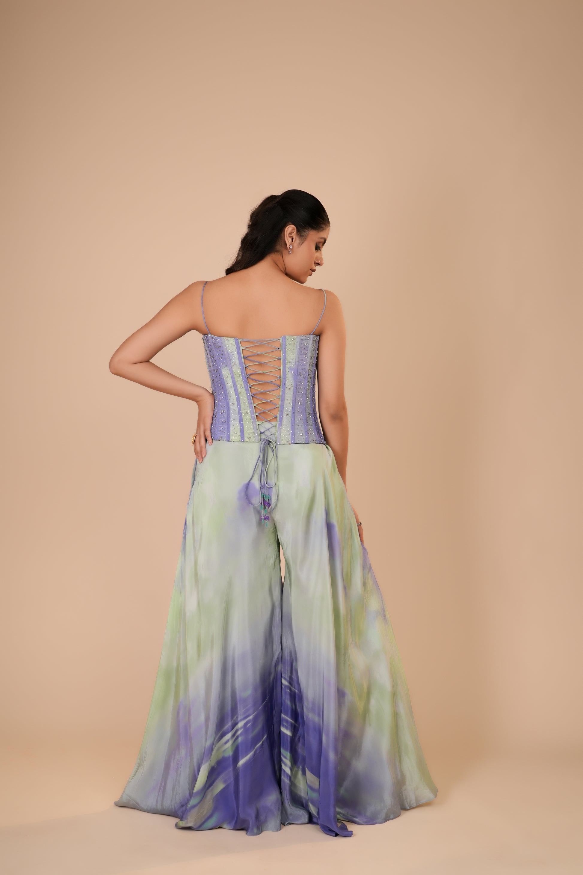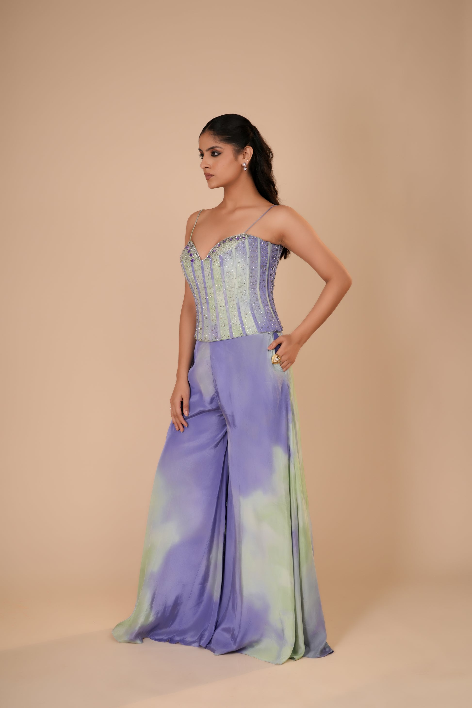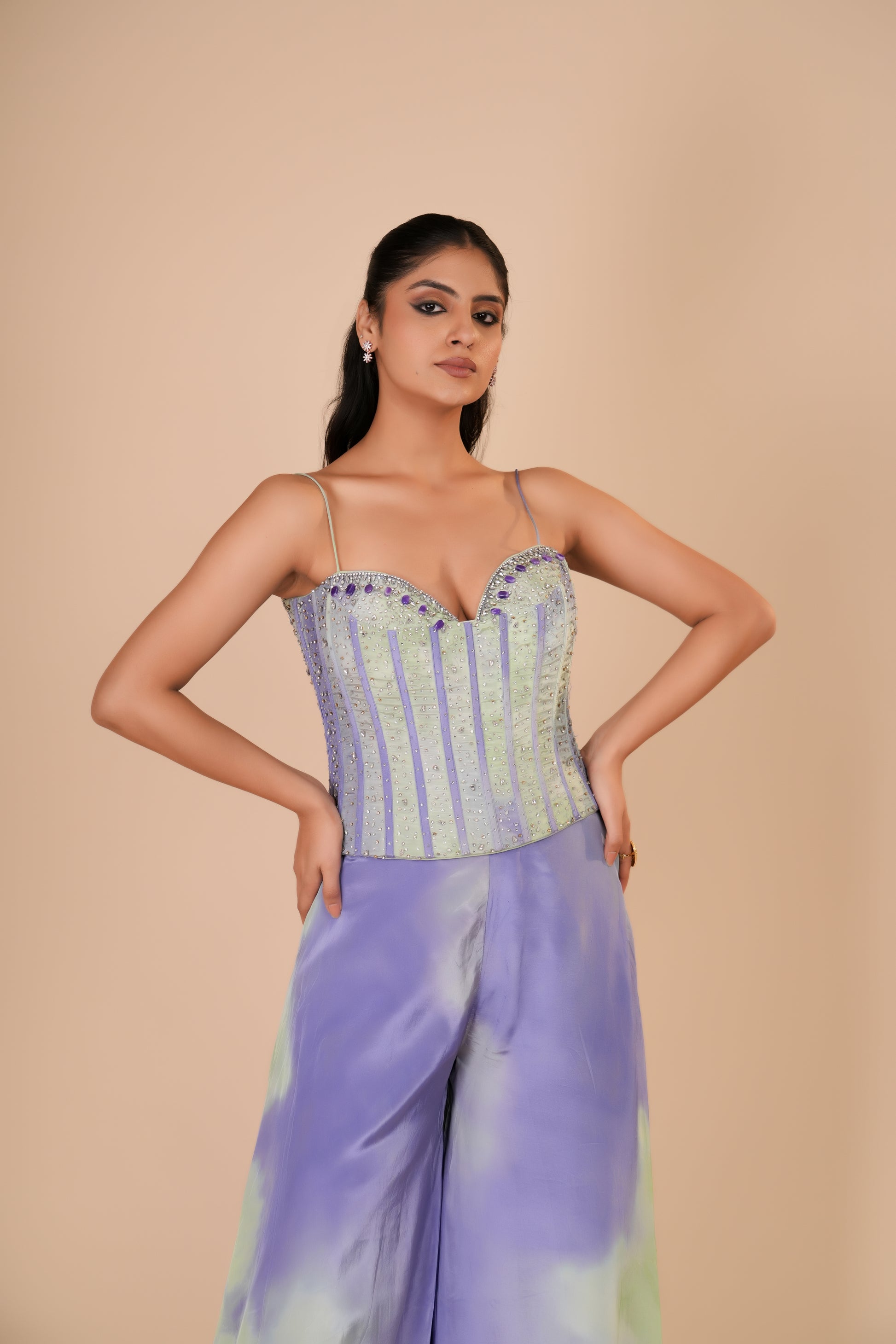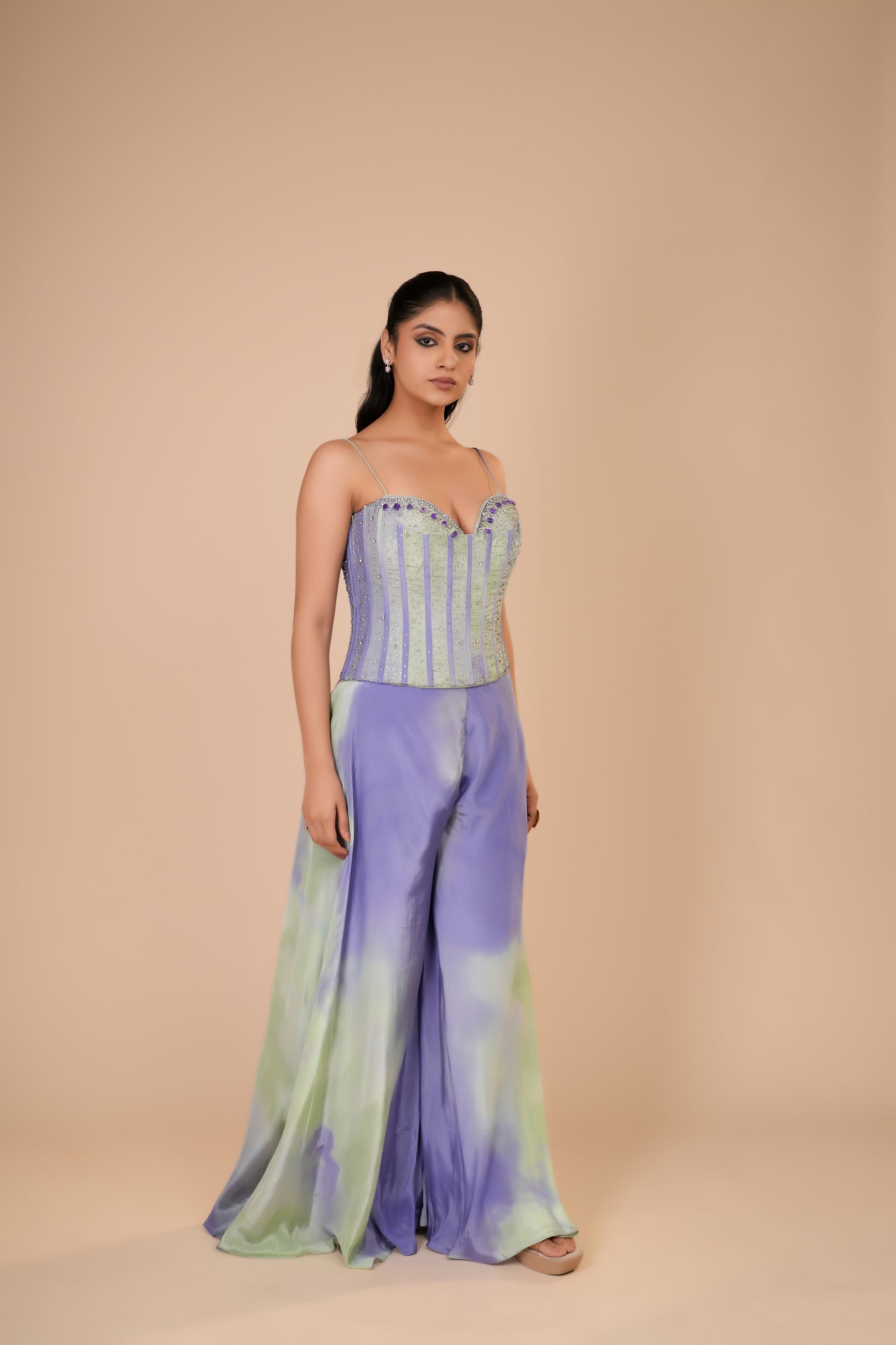 Elevate your fashion quotient with this captivating lilac corset and pallazo pants from Indrani store. This corset in crepe base has swarovski, stones, beads and crystal embroidery on it paired with tie and dye sharara pants. Accentuate it with statement earrings for a festive occasion or cocktail ceremony.