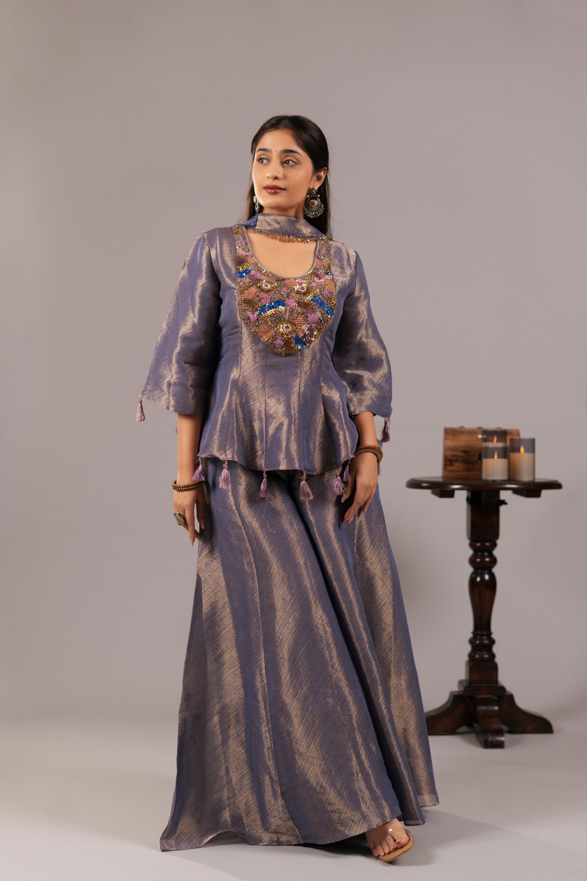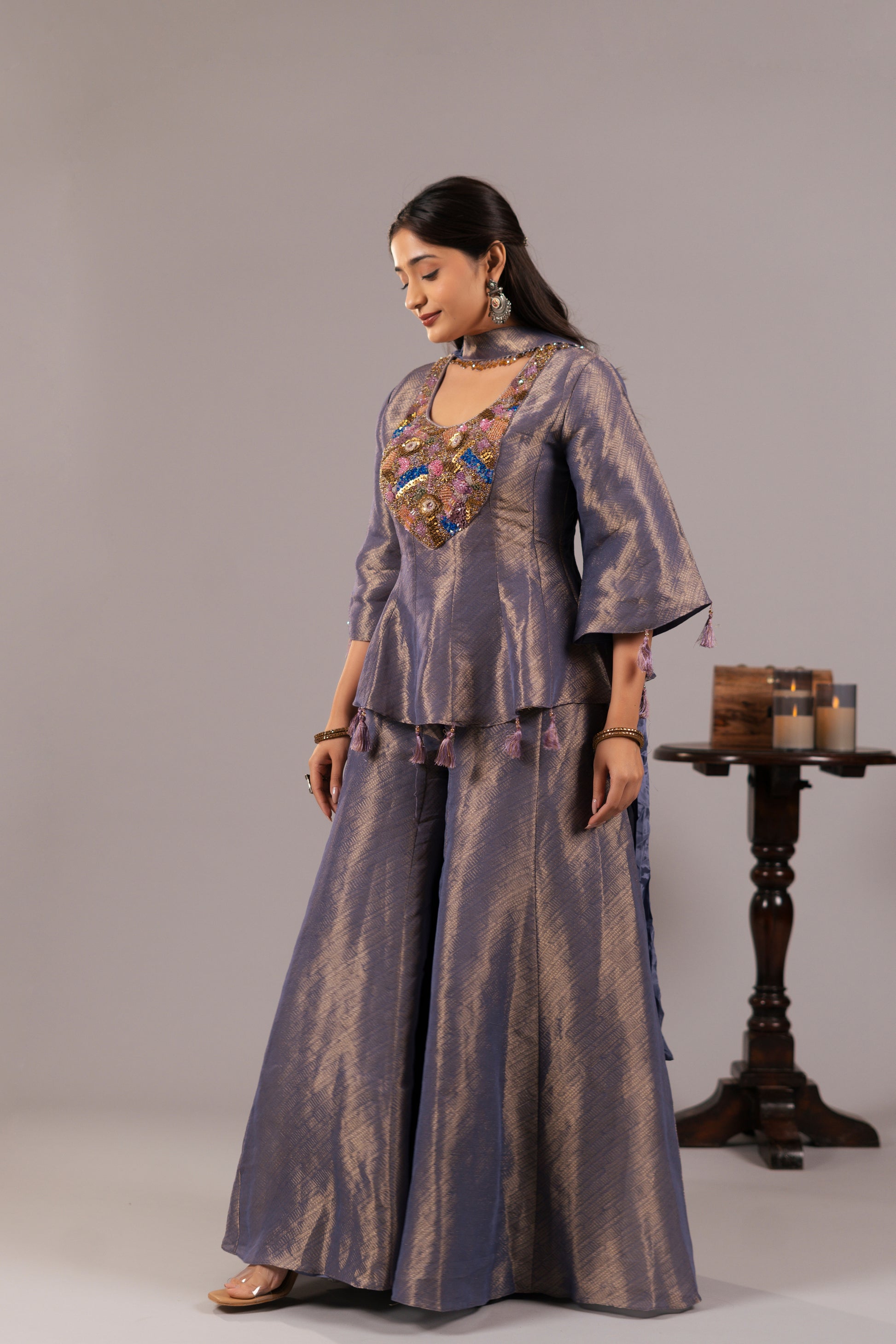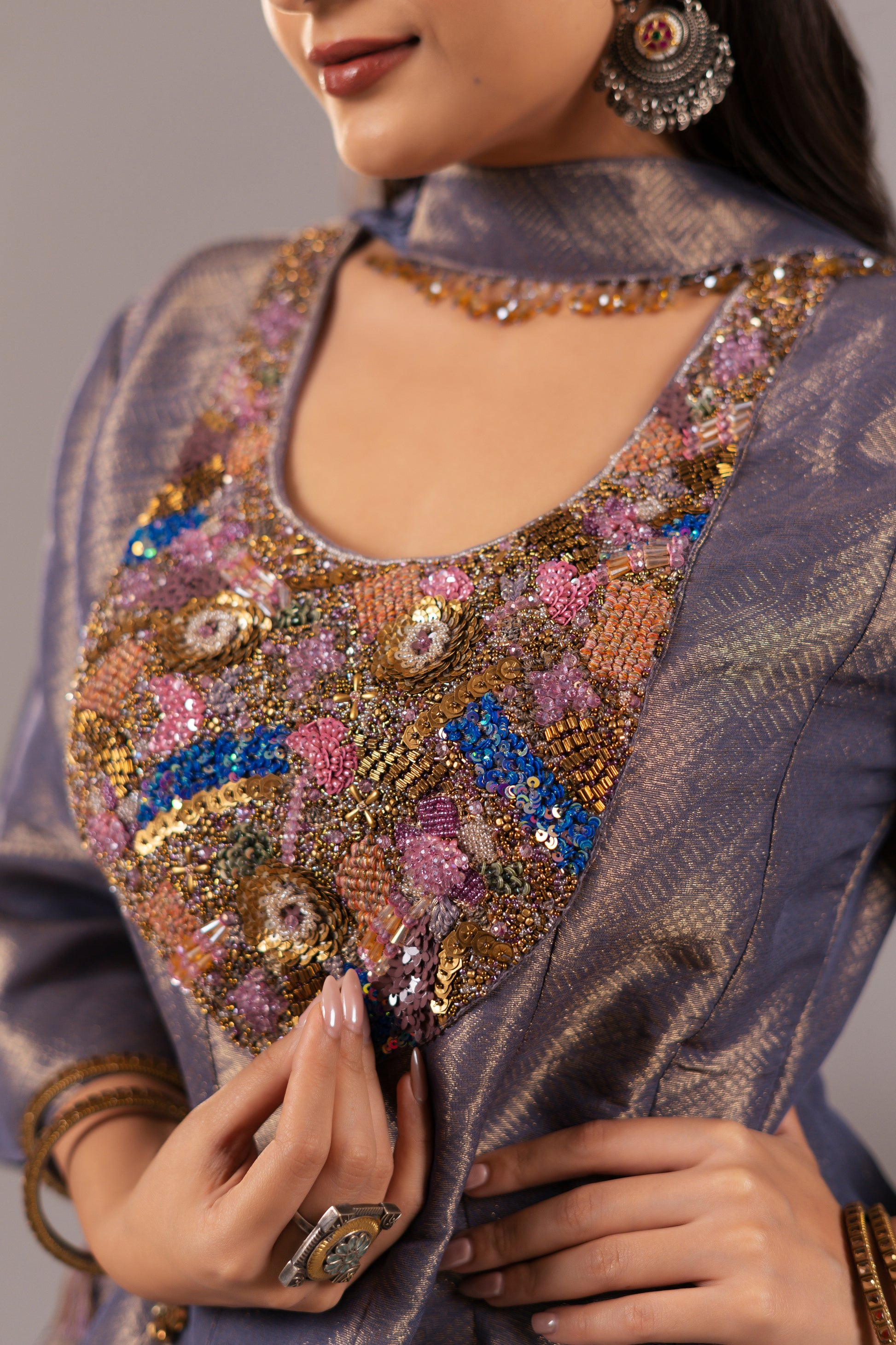 An exquisite African violet palazzo set in luxurious tissue fabric from Indrani store. Accentuated with intricate multi-colored embroidery along the neckline, the ensemble radiates refined craftsmanship, while the fabric’s subtle sheen adds an air of understated opulence.