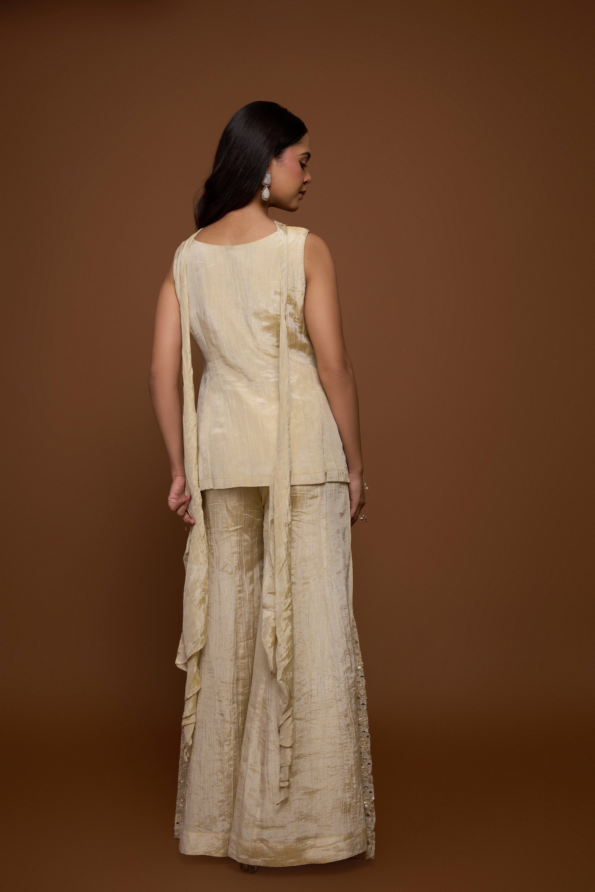 Elevate your fashion quotient with this captivating creme kurta and sharara pants set from Indrani store. This creme kurta has mirror work, beads, cut dana and sequin embroidery with crushed sharara pants. This set comes with a matching tissue dupatta with similar work on it. This set is a perfect blend of modern yet traditional.