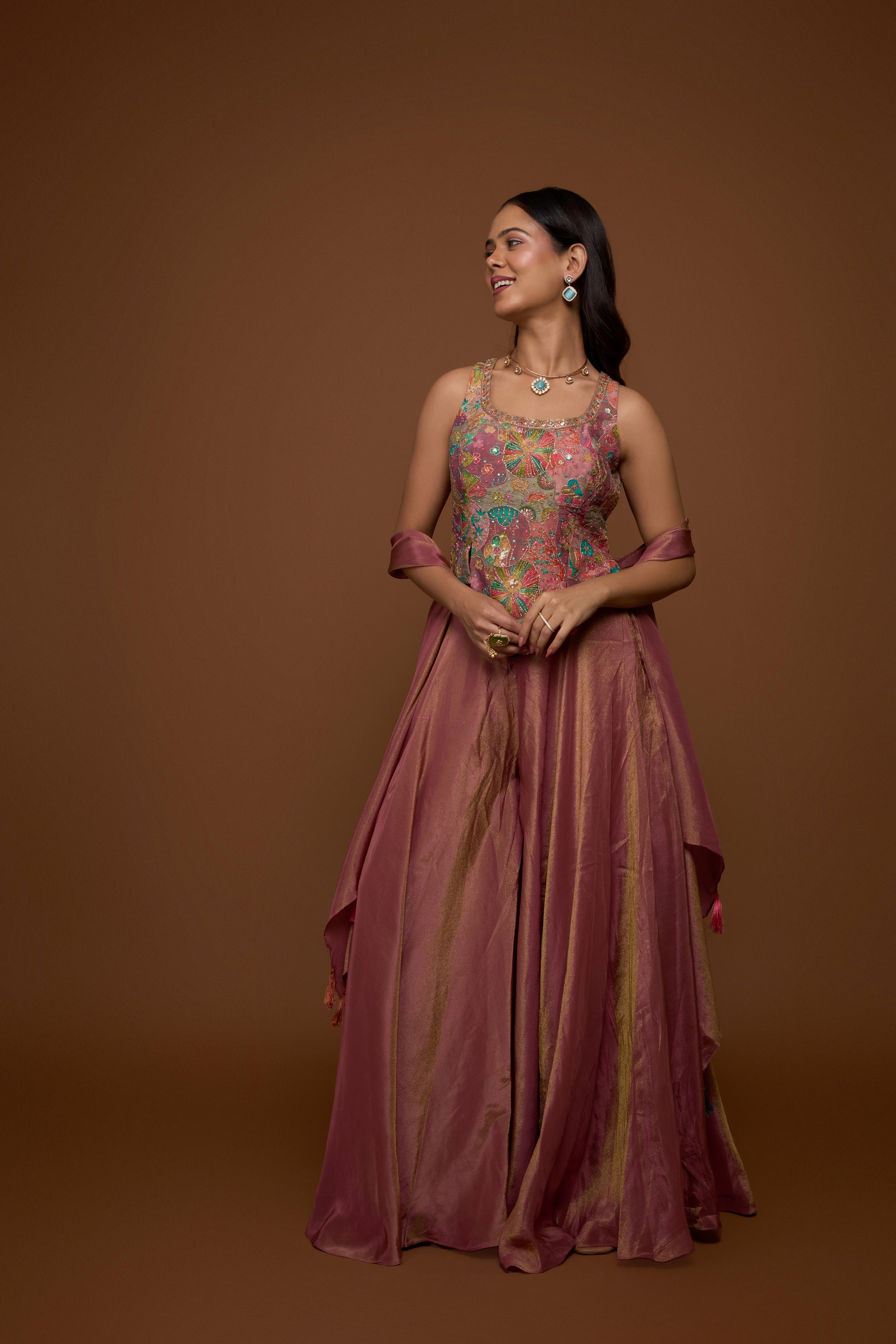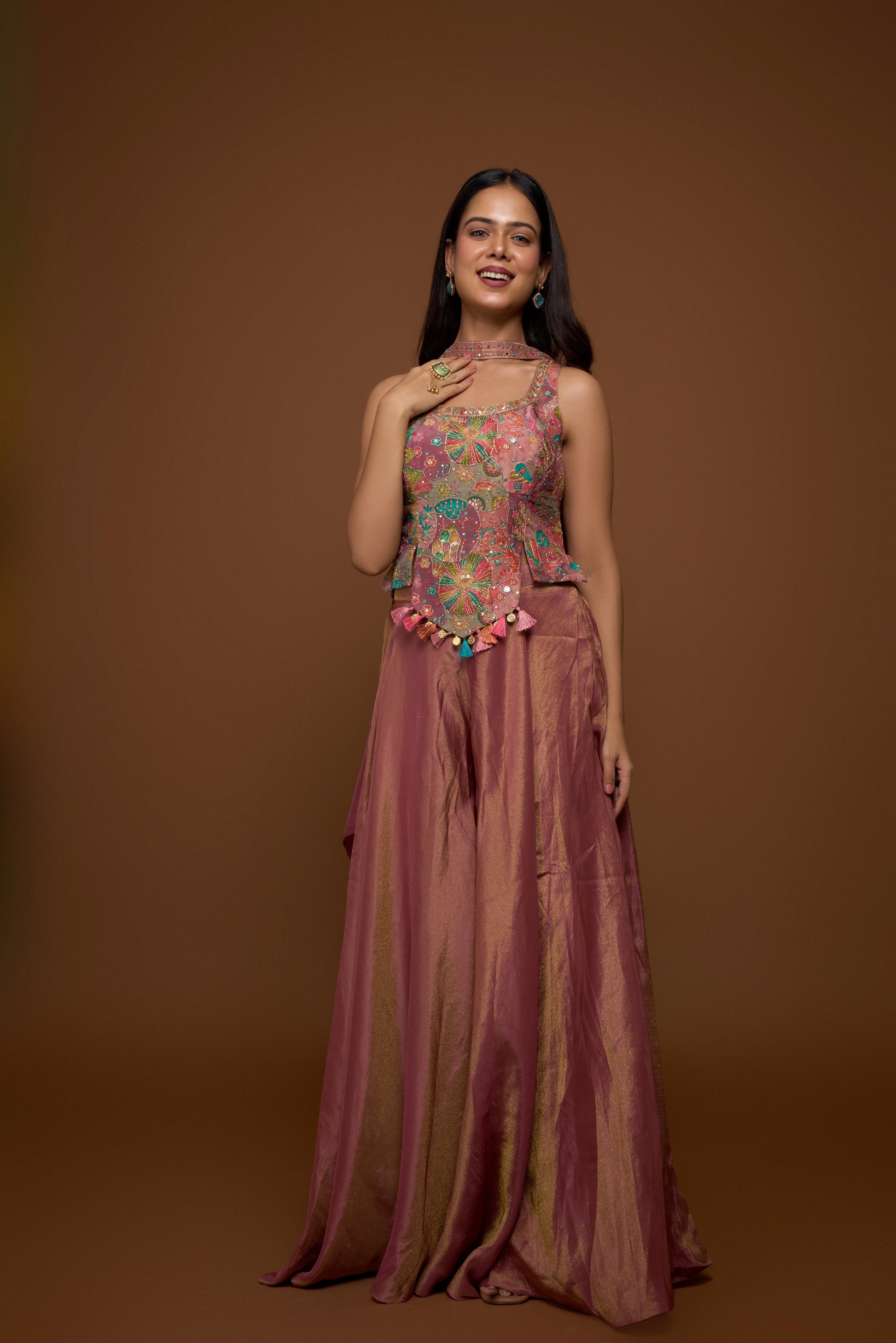Elevate your fashion quotient with this captivating gold pink iridescent halter blouse and palazzo pants from Indrani store. This halter blouse in silk base has intricate floral embroidery with sequins, zardosi and mirror work on it paired with matching palazzo pants and dupatta. Accentuate it with statement earrings for a festive occasion or cocktail ceremony.
