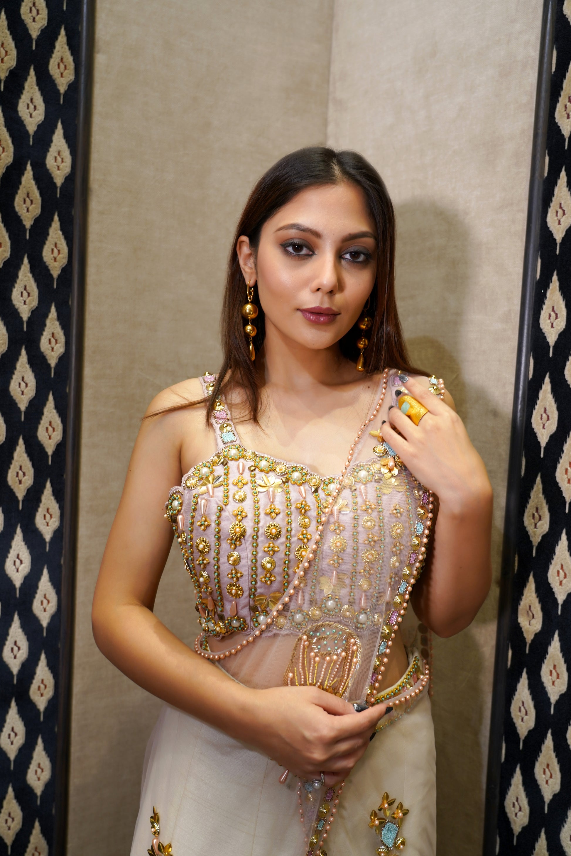 Drape yourself in this lilac and beige pre-stitched saree and shine just as gracefully as the celebration itself from Indrani store. This ensemble is a perfect blend of shimmering pearls, flowing drape and stunning 3D embroidery capturing the essence of blooming beauty.