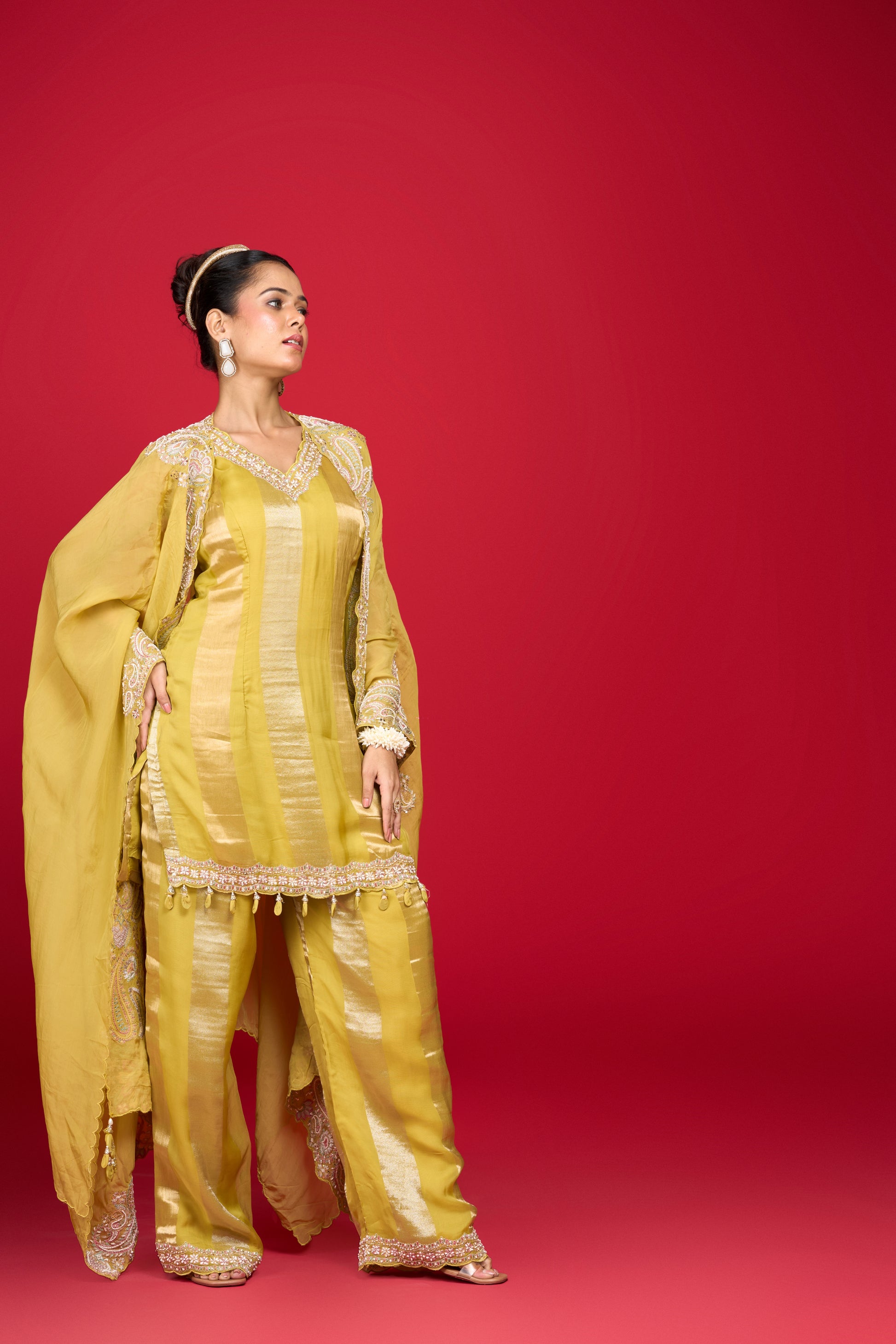 Elevate your fashion quotient with this captivating pear green kurta with cape and pants from Indrani store. This organza tissue set has beads, sequins and resham embroidery with tassels detailing on it. Accentuate it with statement earrings for a festive occasion or cocktail ceremony.