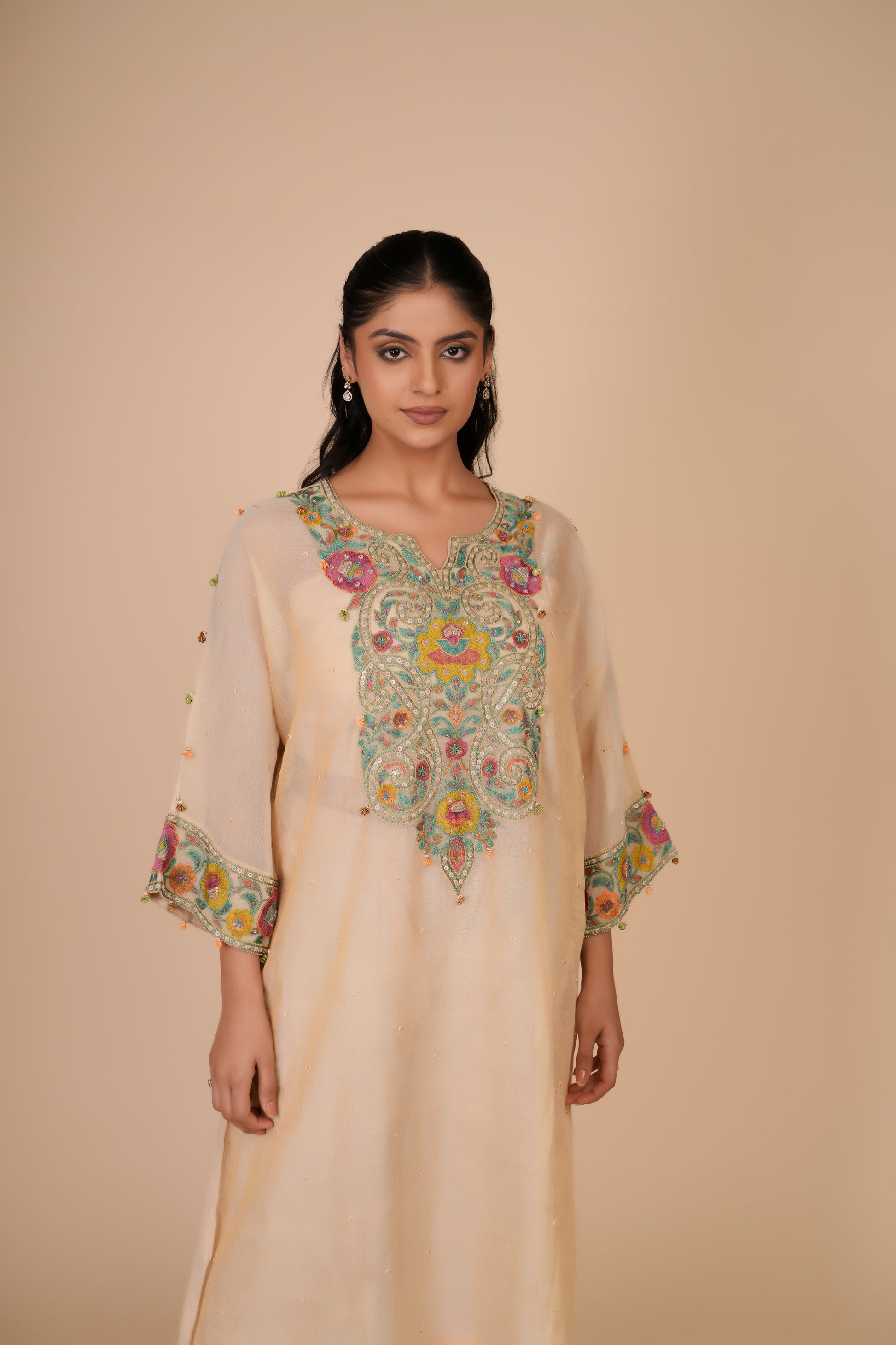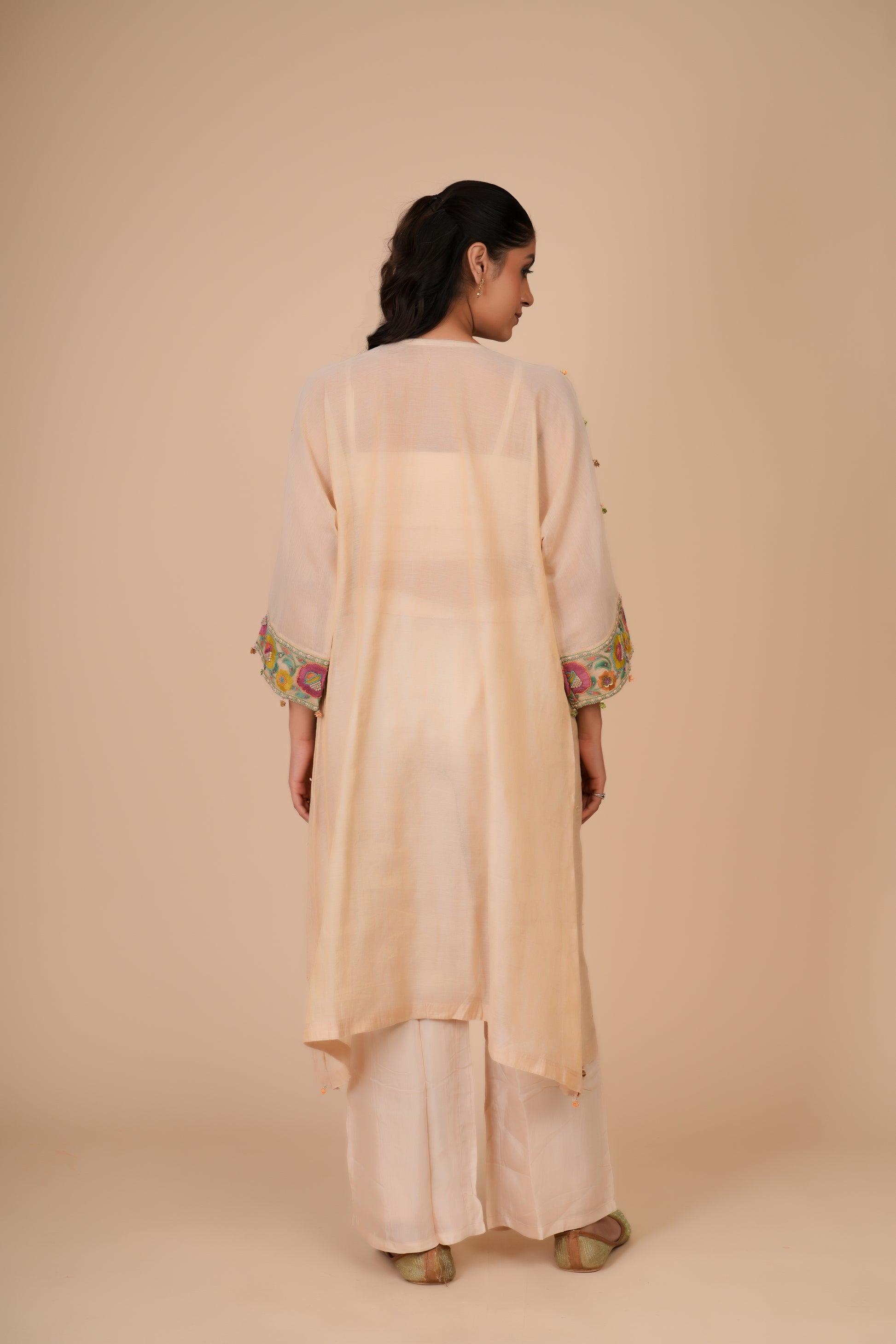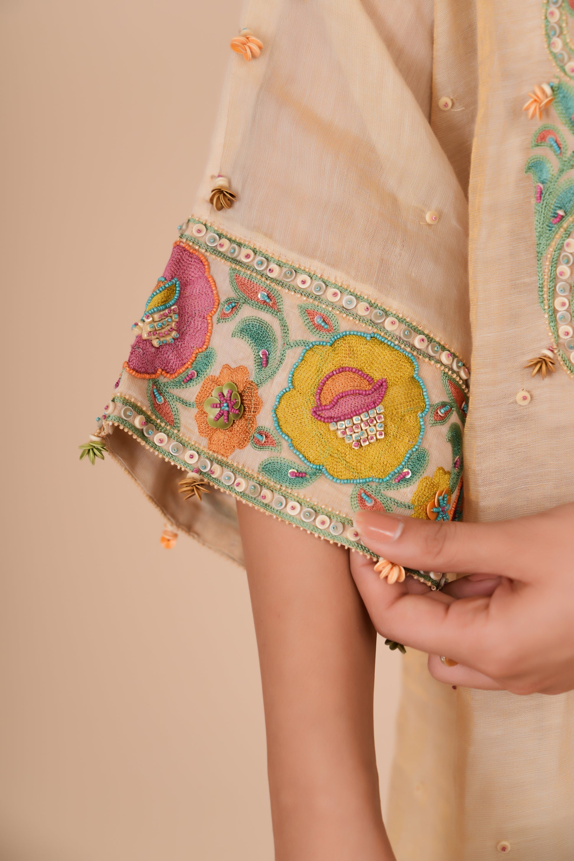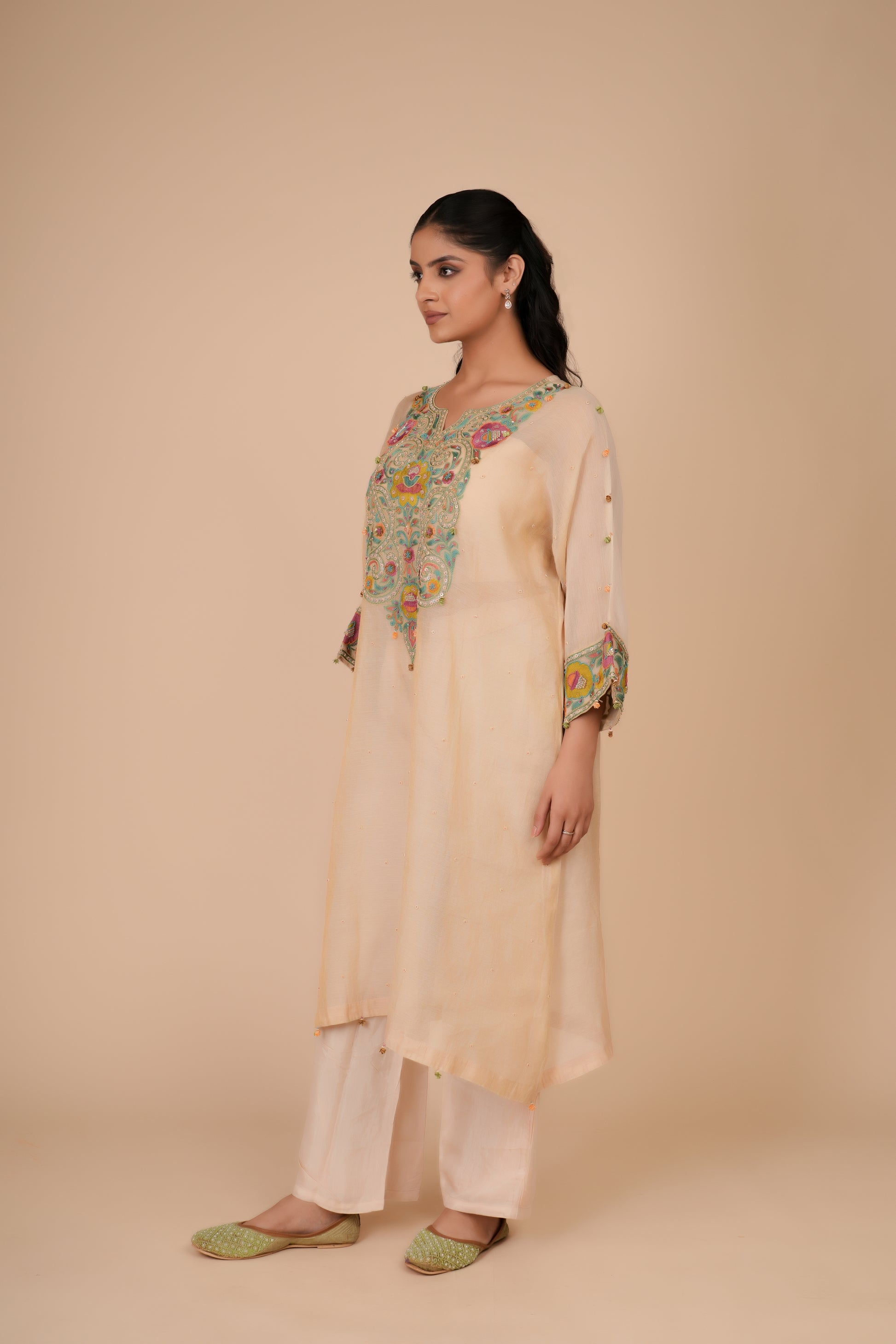 Elevate your look with this beige kurta pants set from Indrani store. This ensemble is adorned with sequins, beads and resham embroidery. This set has detailing on the neck as well as sleeves and comes with a bustier, top and pants making it perfect for any festive occasion.