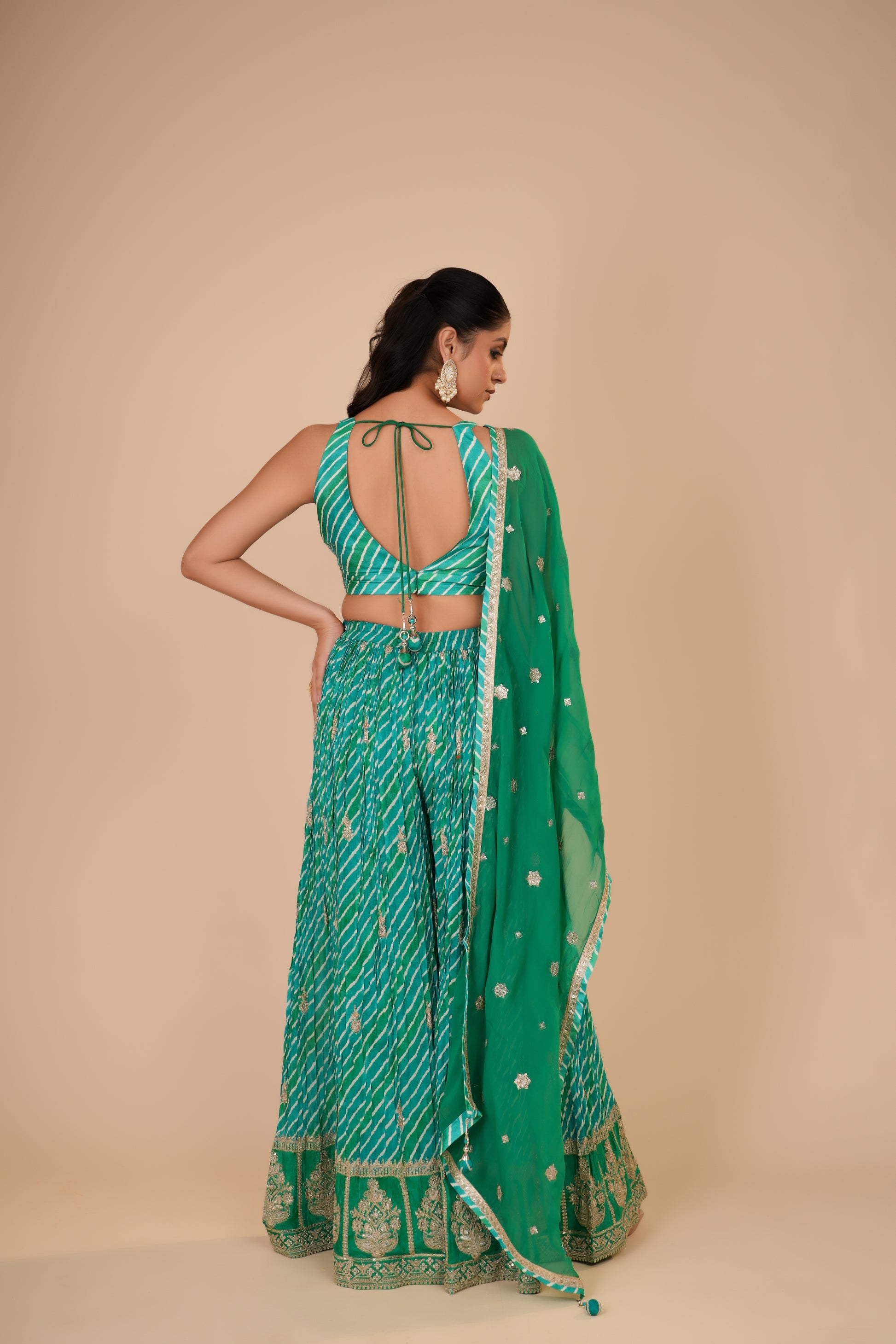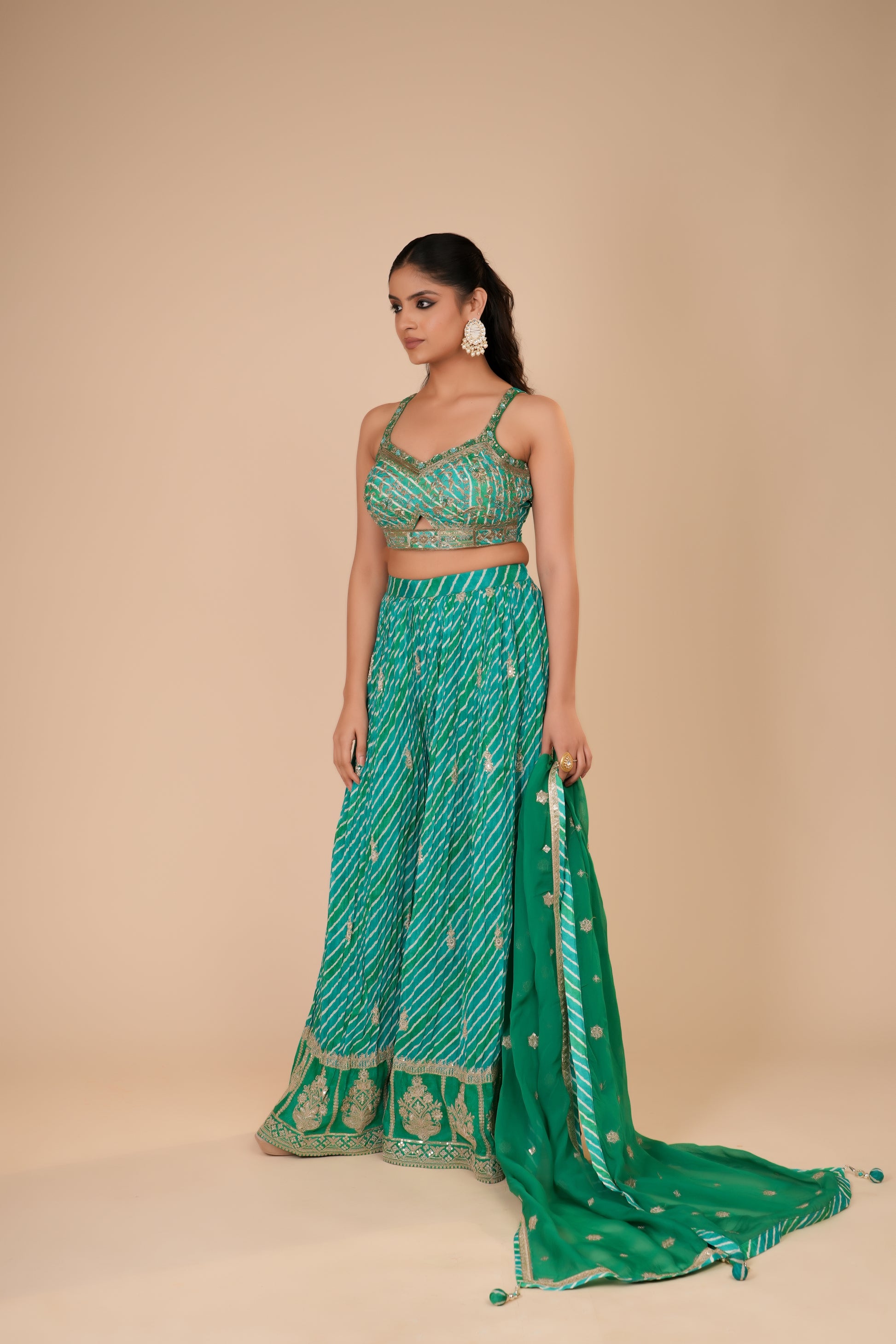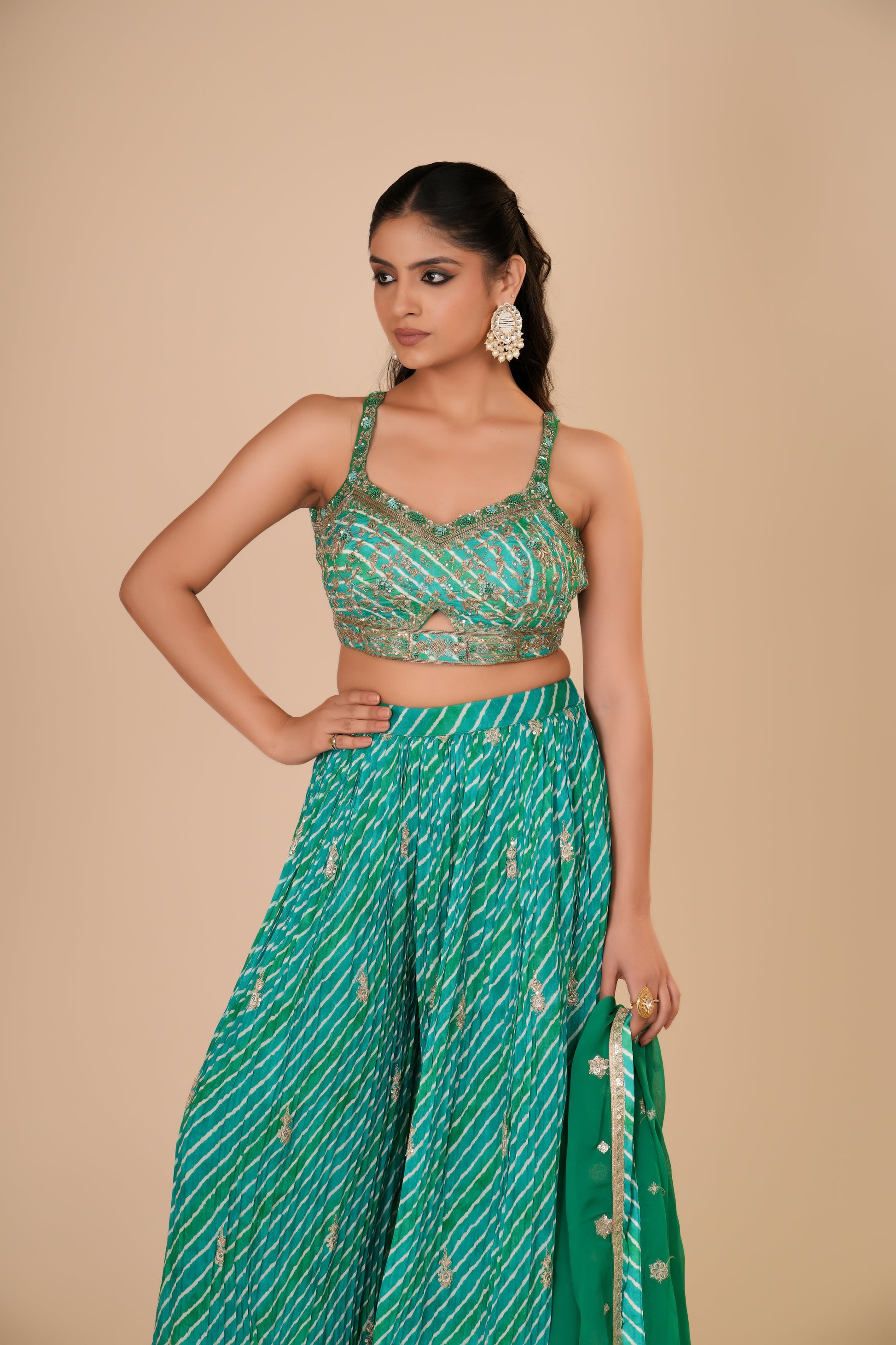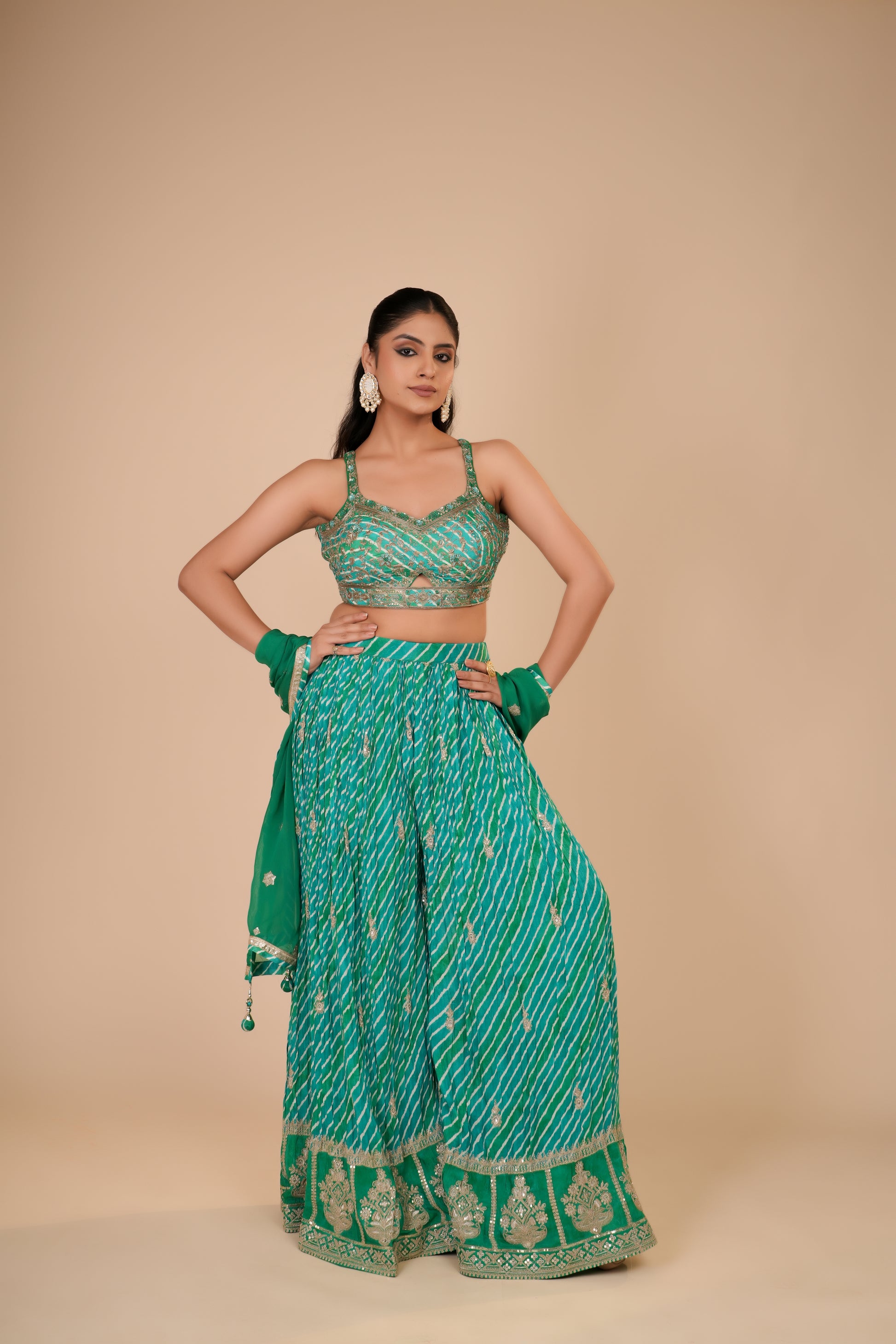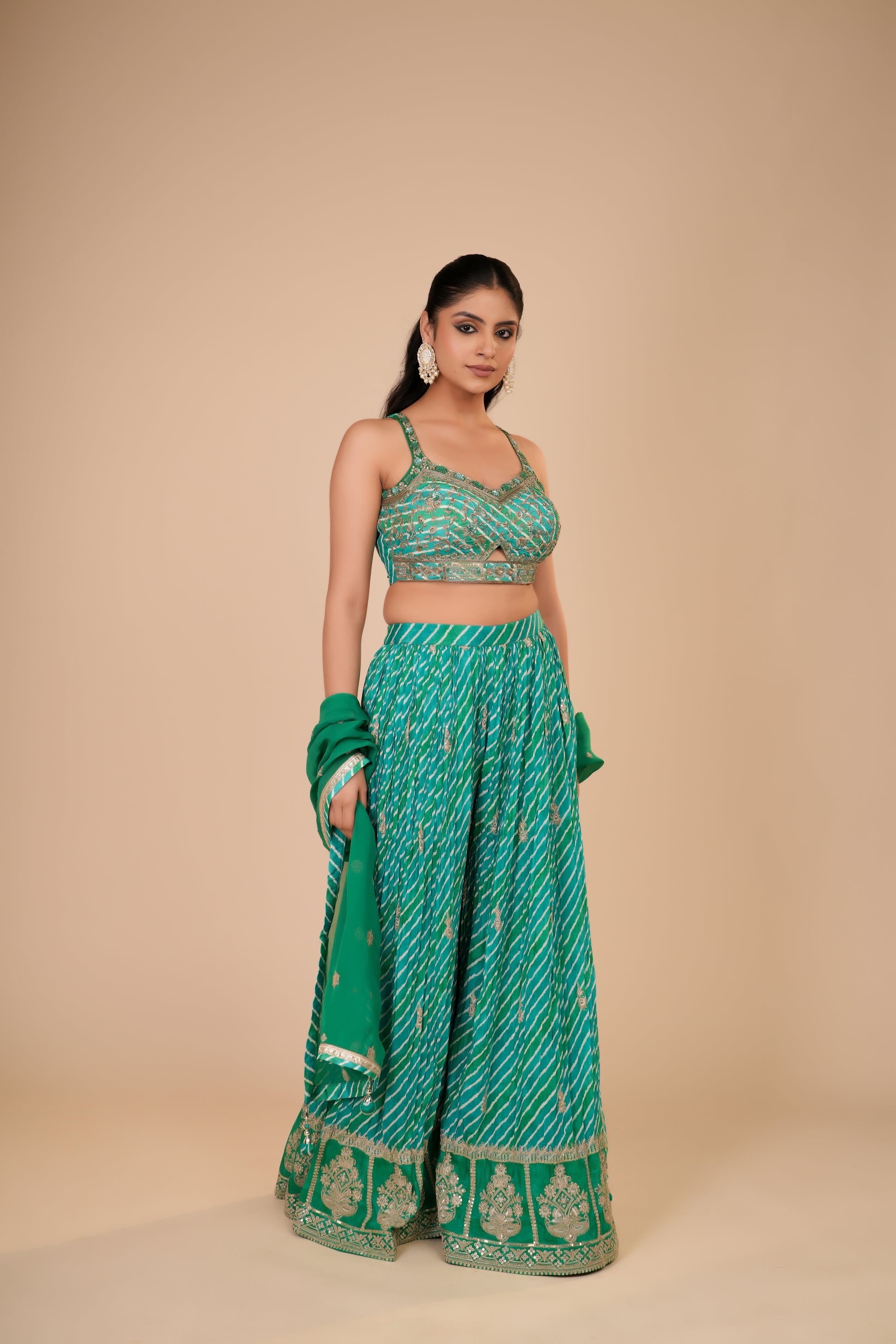 Elevate your fashion quotient with this captivating green leheriya palazzo set from Indrani store. This ensemble is adorned with jardosi and aari embroidery on the blouse and palazzo. This palazzo set comes with a matching dupatta with lace detailing and all over embroidery that compliments the outfit.