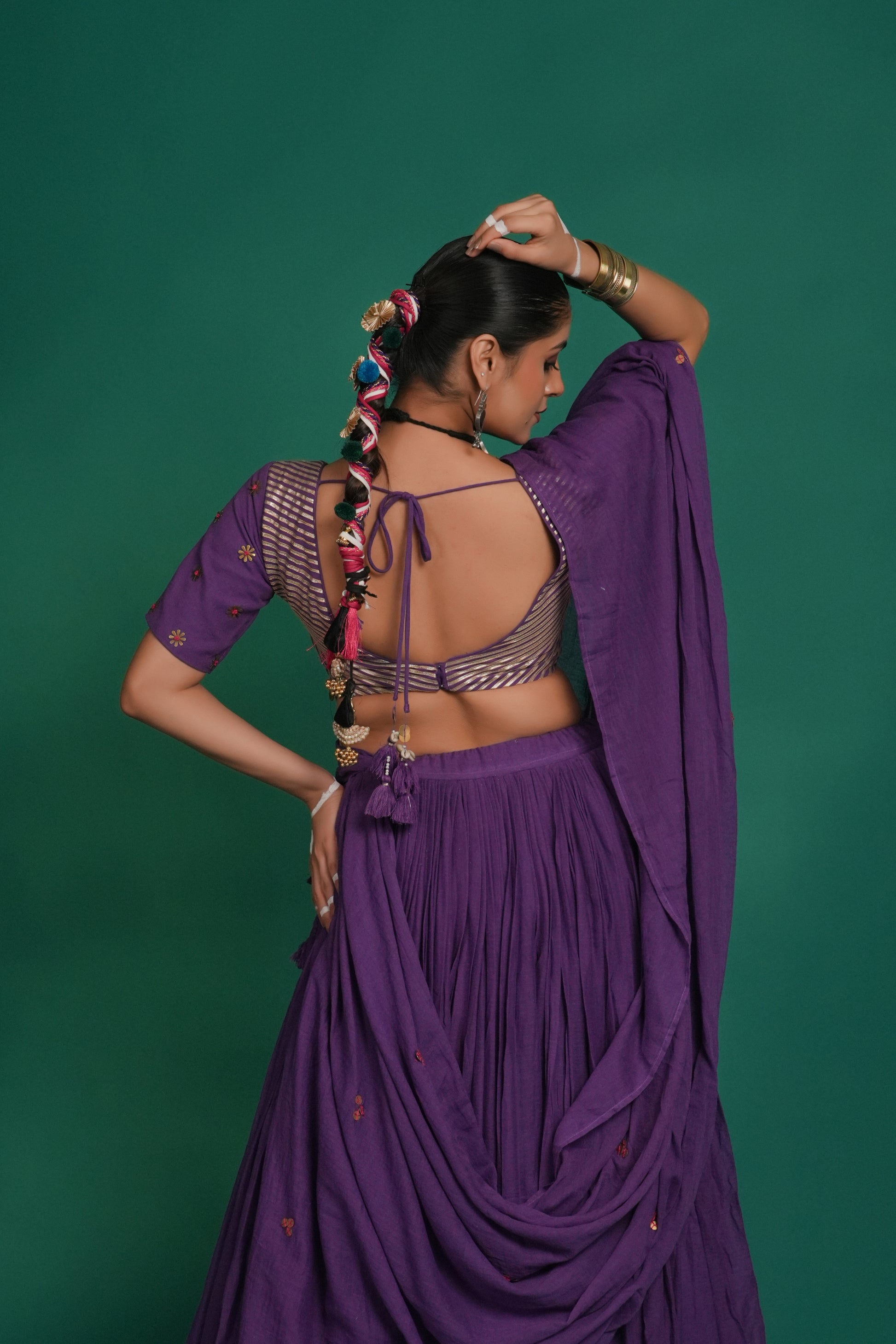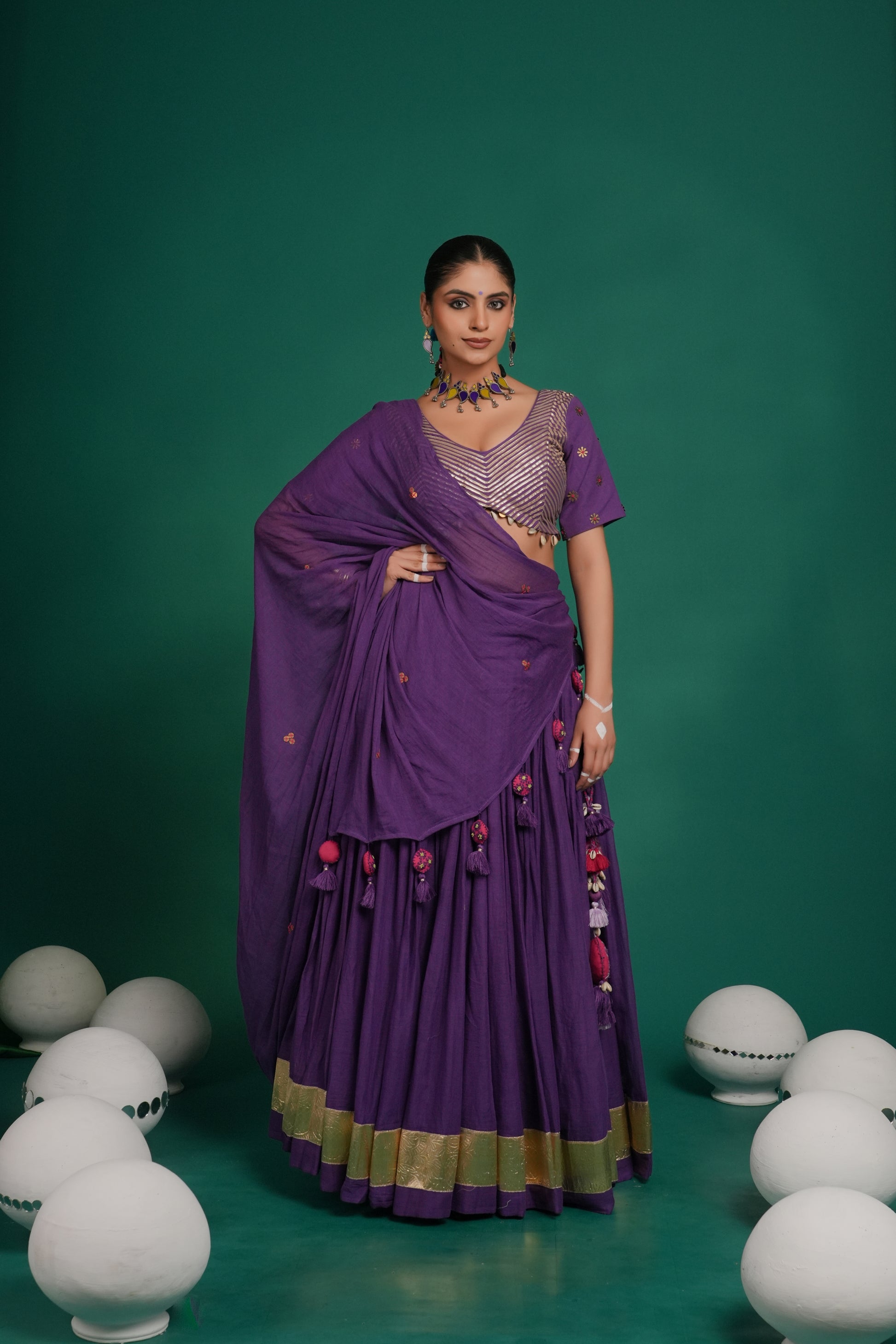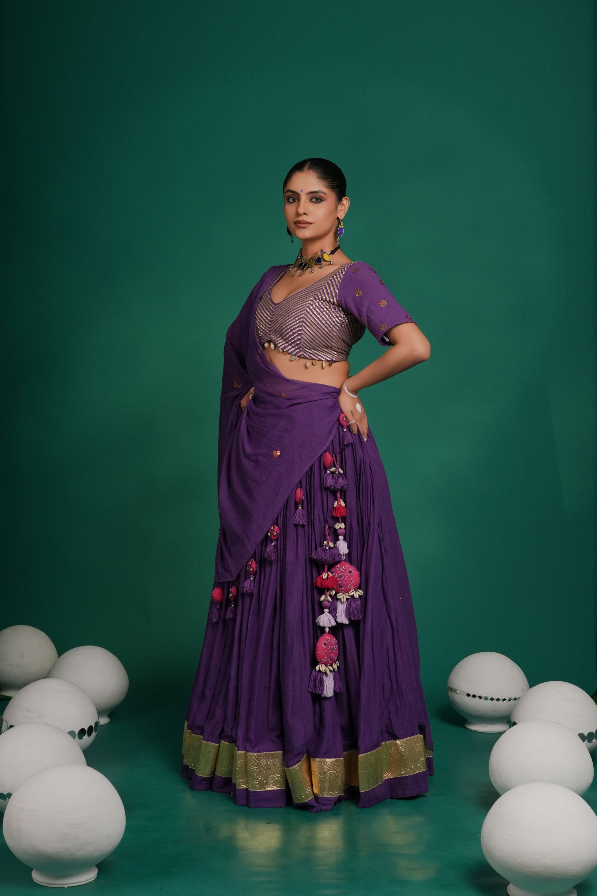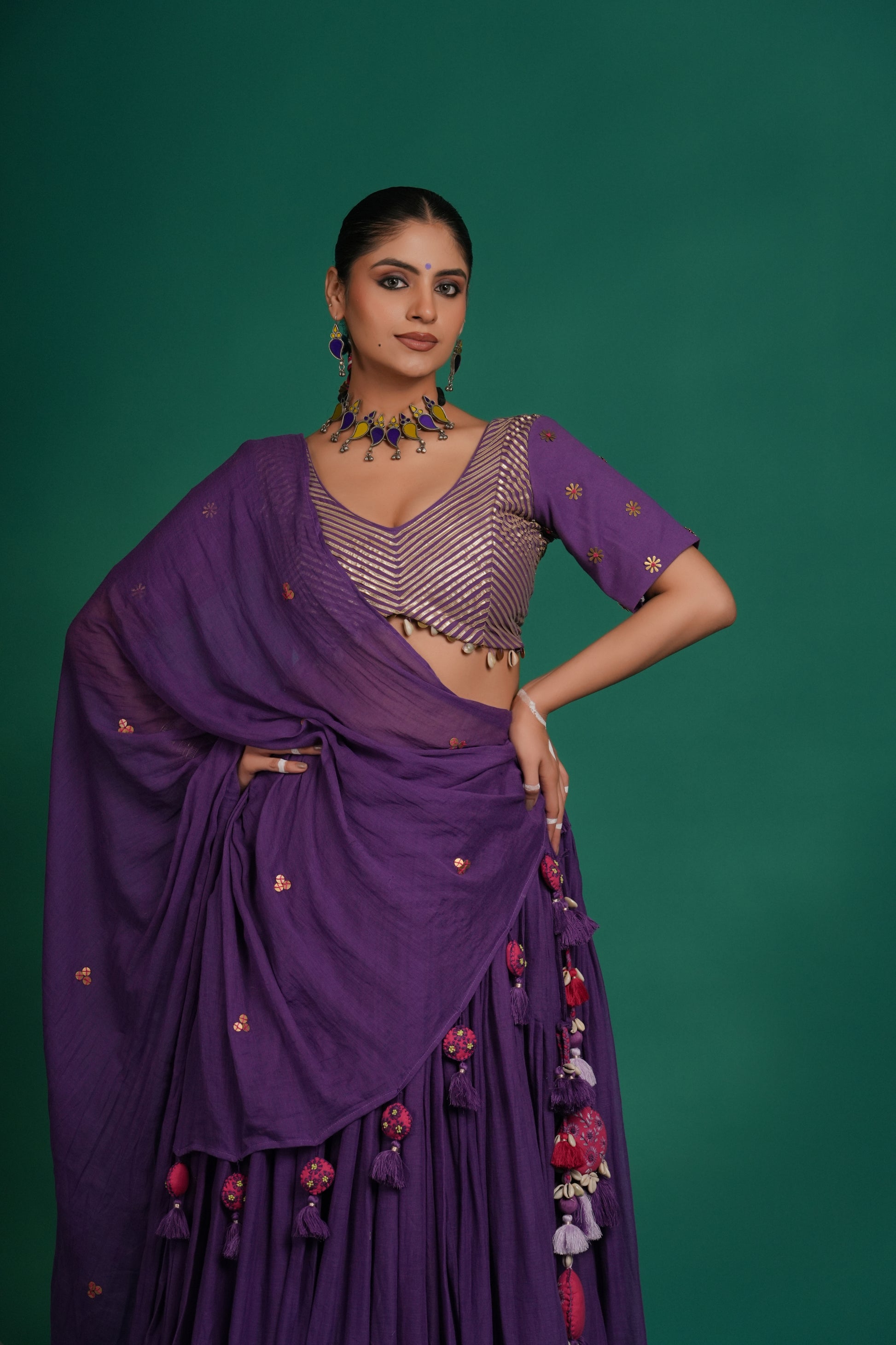 Indulge in the deep violet lehenga in mul fabric from Indrani store. The lehenga has beautiful lampi skirt border all over with pink tassel detailing. The lehenga is paired with matching blouse and embroidered dupatta. The lehenga’s 12-meter flare creates a breathtaking silhouette—elegant, graceful, and truly captivating, whether you're swirling to the beats of Garba or revelling in the festive fervour.