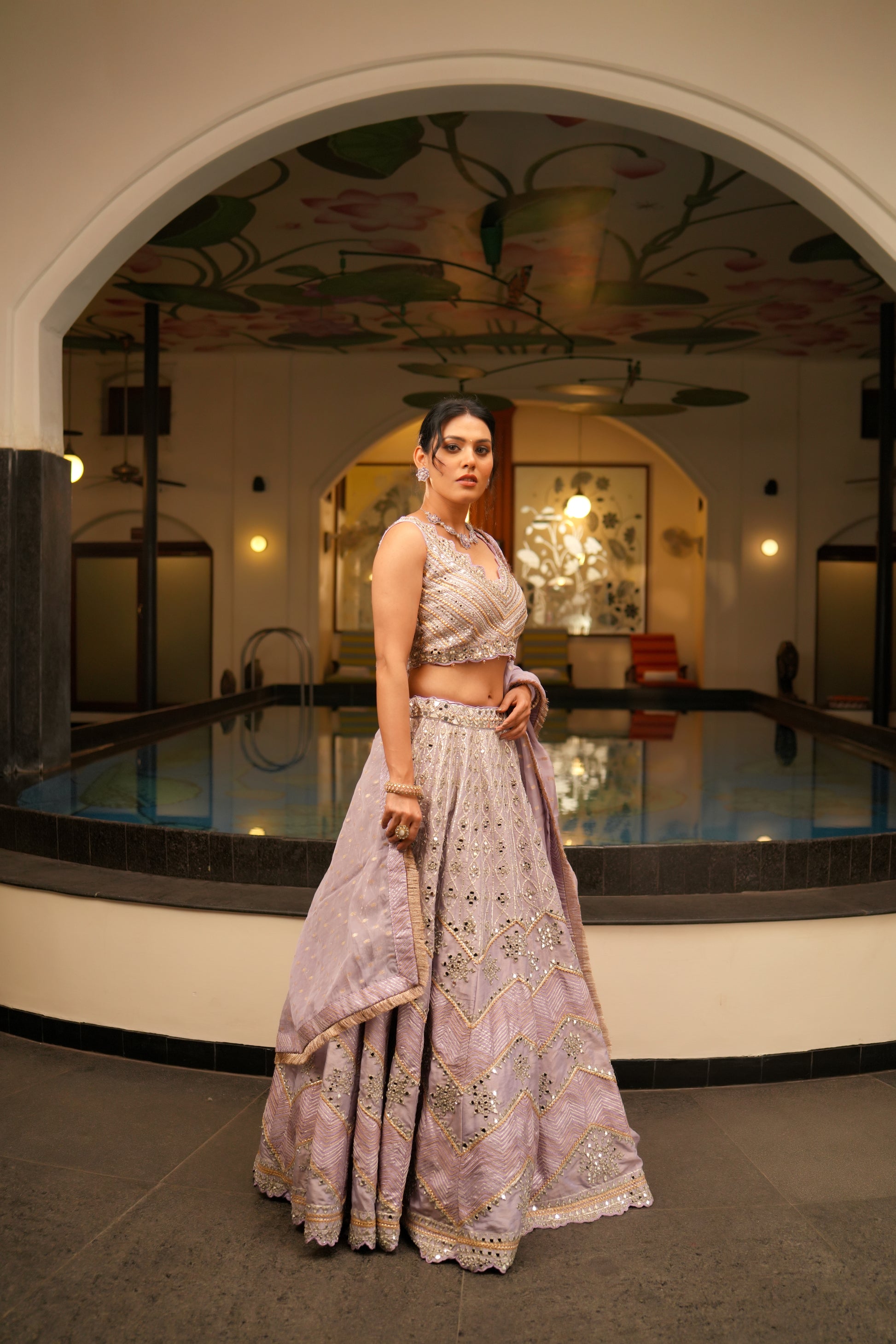 Grace this versatile lavender lehenga in tissue fabric from Indrani store. The lehenga is embroidered with intricate mirror and gota patti. It is comes with a matching embedded blouse and organza dupatta.