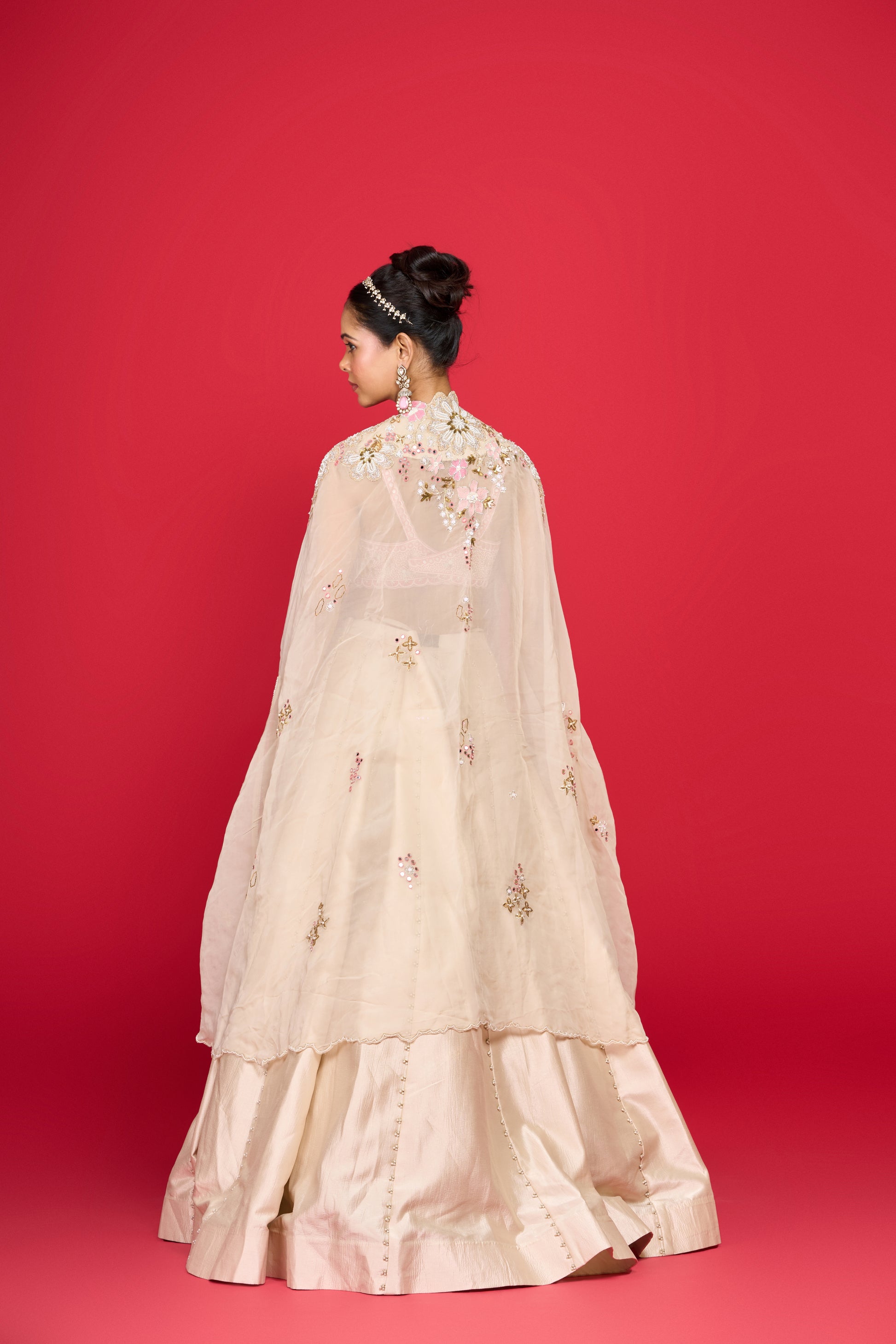 Introducing this elegant cream lehenga in raw silk fabric from Indrani store. This lehenga features a plain cream skirt paired with an intricately embroidered bustier and a matching cape, creating a perfect blend of simplicity and sophistication.