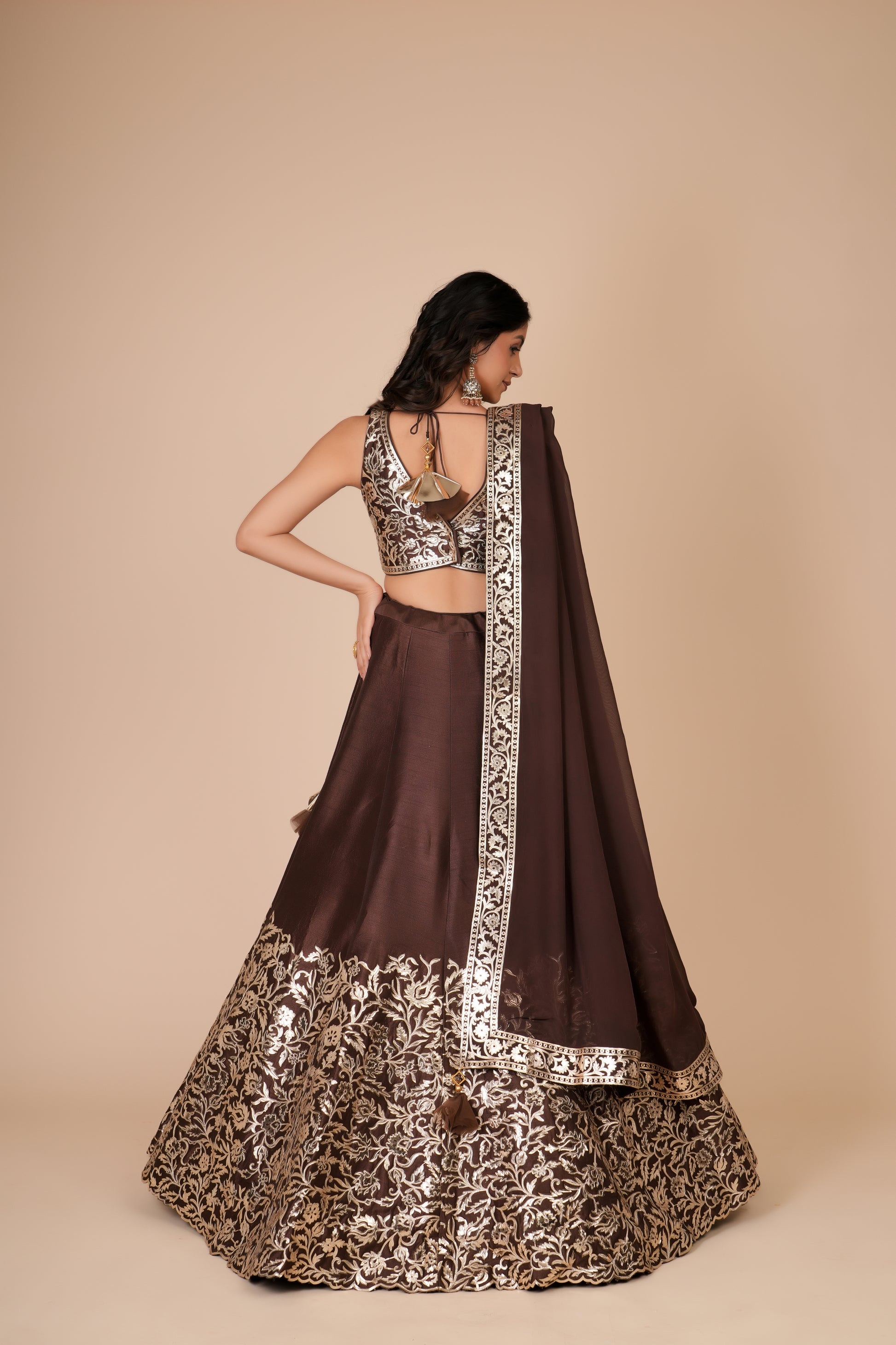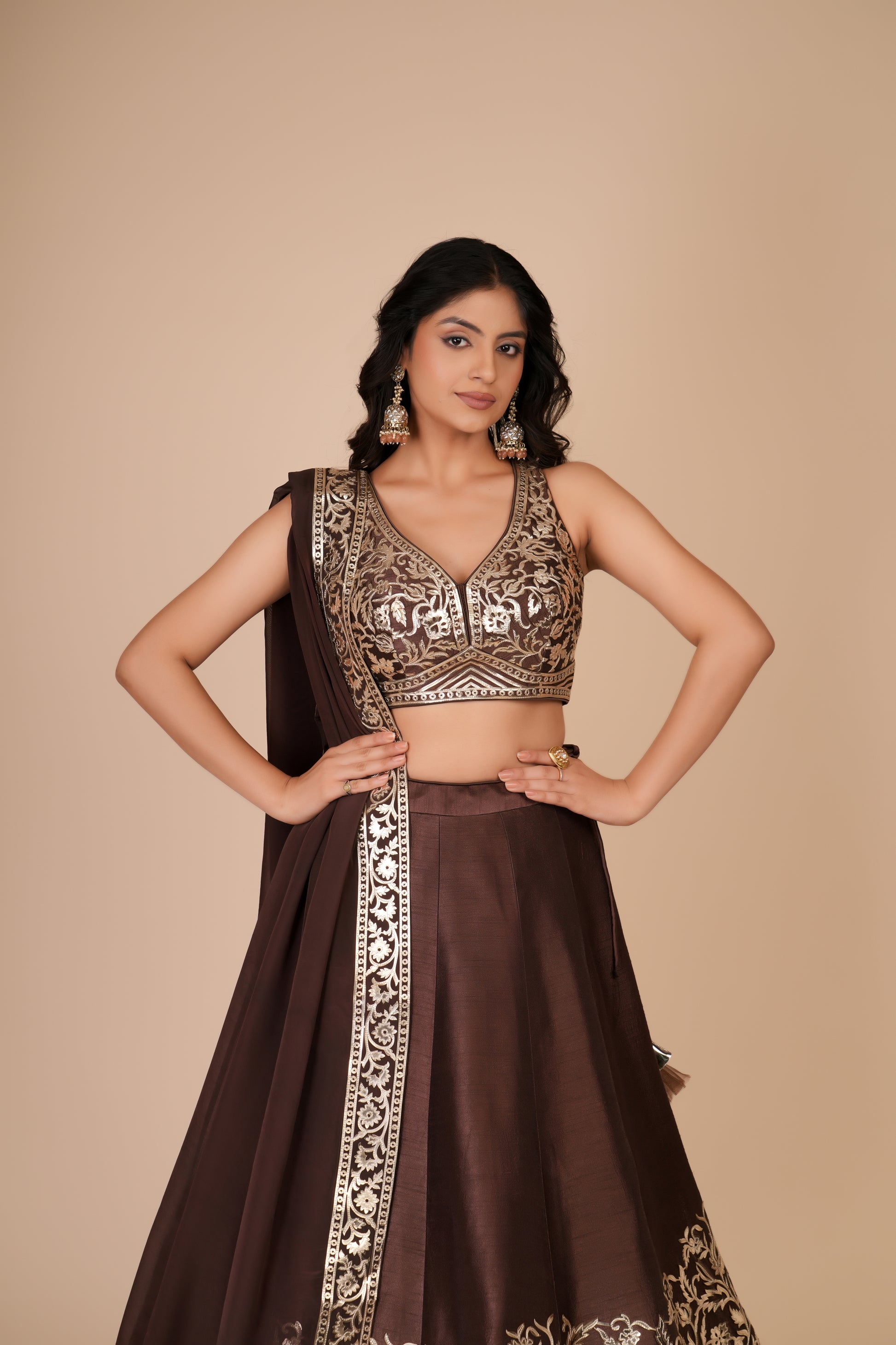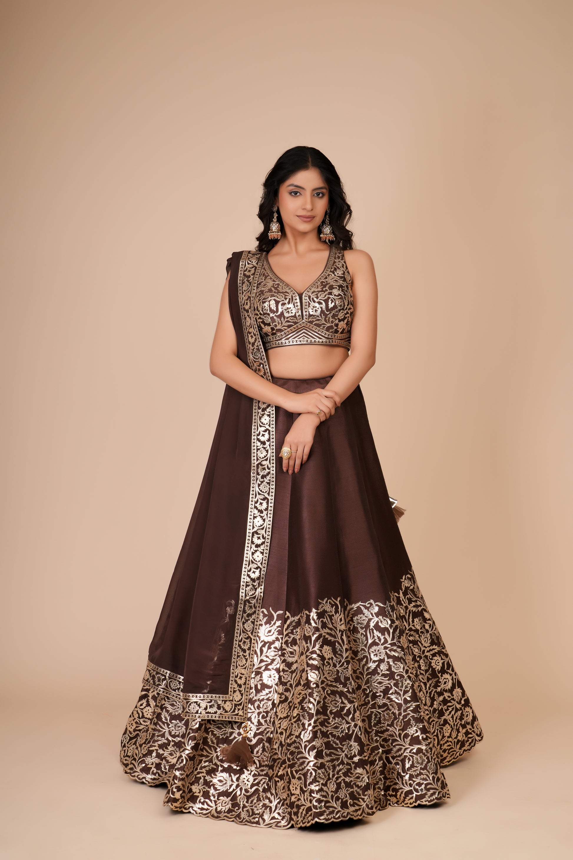 Introducing this classic brown lehenga in raw silk fabric from Indrani store. This lehenga has stylish leather work detail all over in floral pattern. The lehenga is paired with beautiful heavy embroidered blouse and a matching organza dupatta.