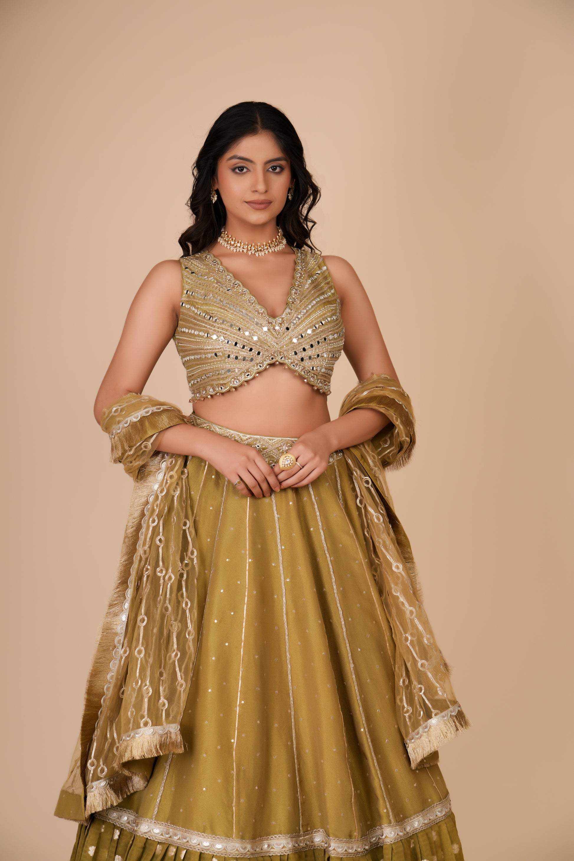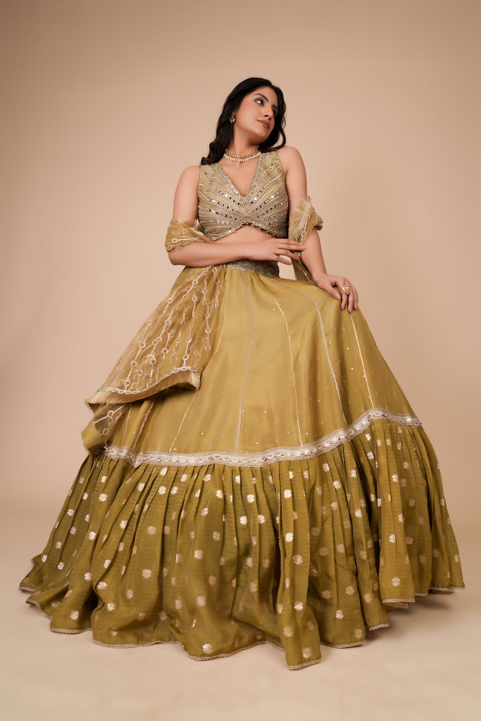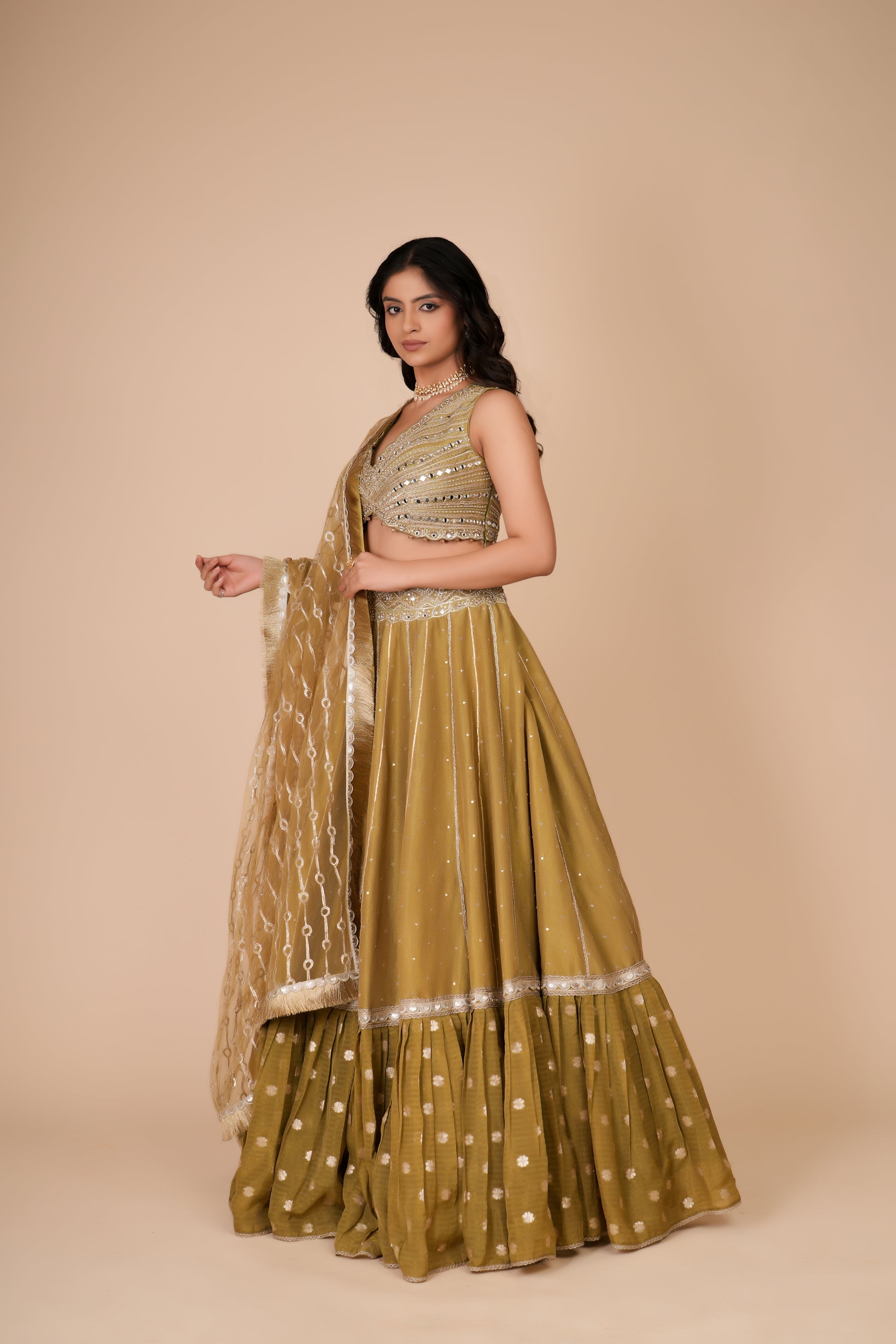Introducing this stunning olive green lehenga in tissue silk fabric from Indrani store. This lehenga has stylish ruffles skirt border in banarasi fabric. the lehenga is paired with matching heavy embroidered blouse and beautiful embedded dupatta making it a comfortable choice for special occasions.