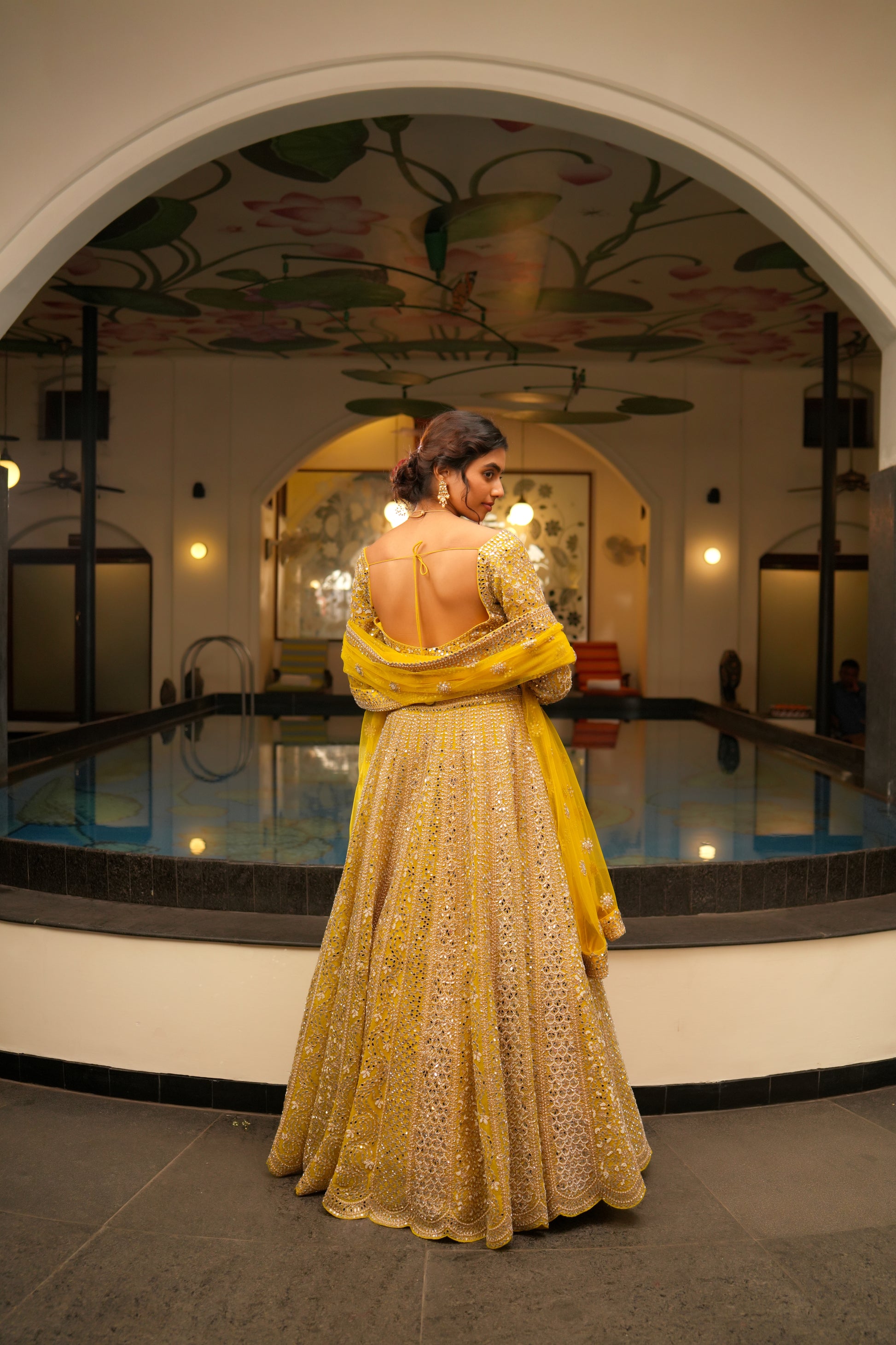 Dazzle in this pretty lemon yellow lehenga in net fabric from Indrani store. The lehenga is accentuated with exquisite embroidery like pearls and mirror. The set comes with matching full sleeves blouse and a net dupatta.