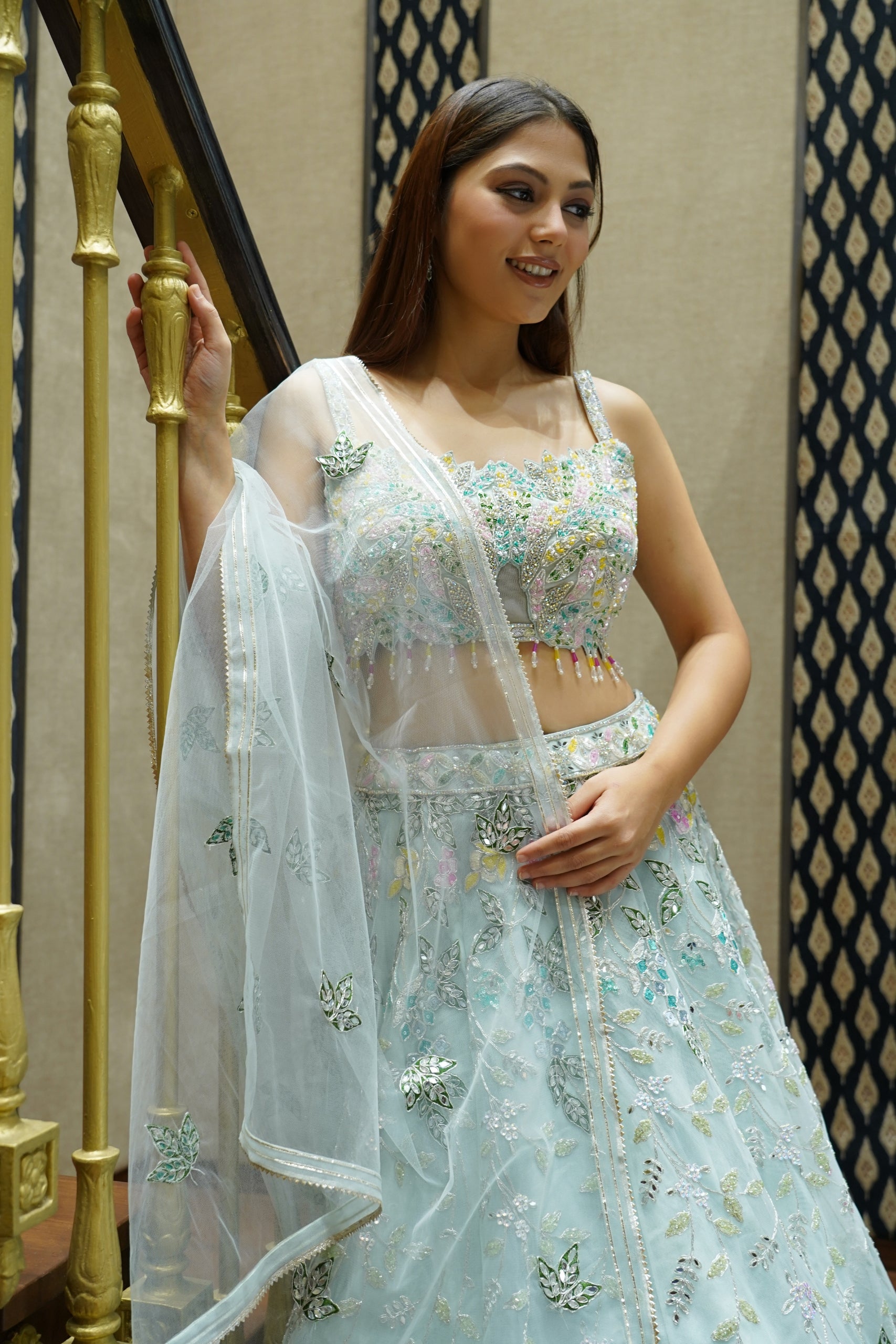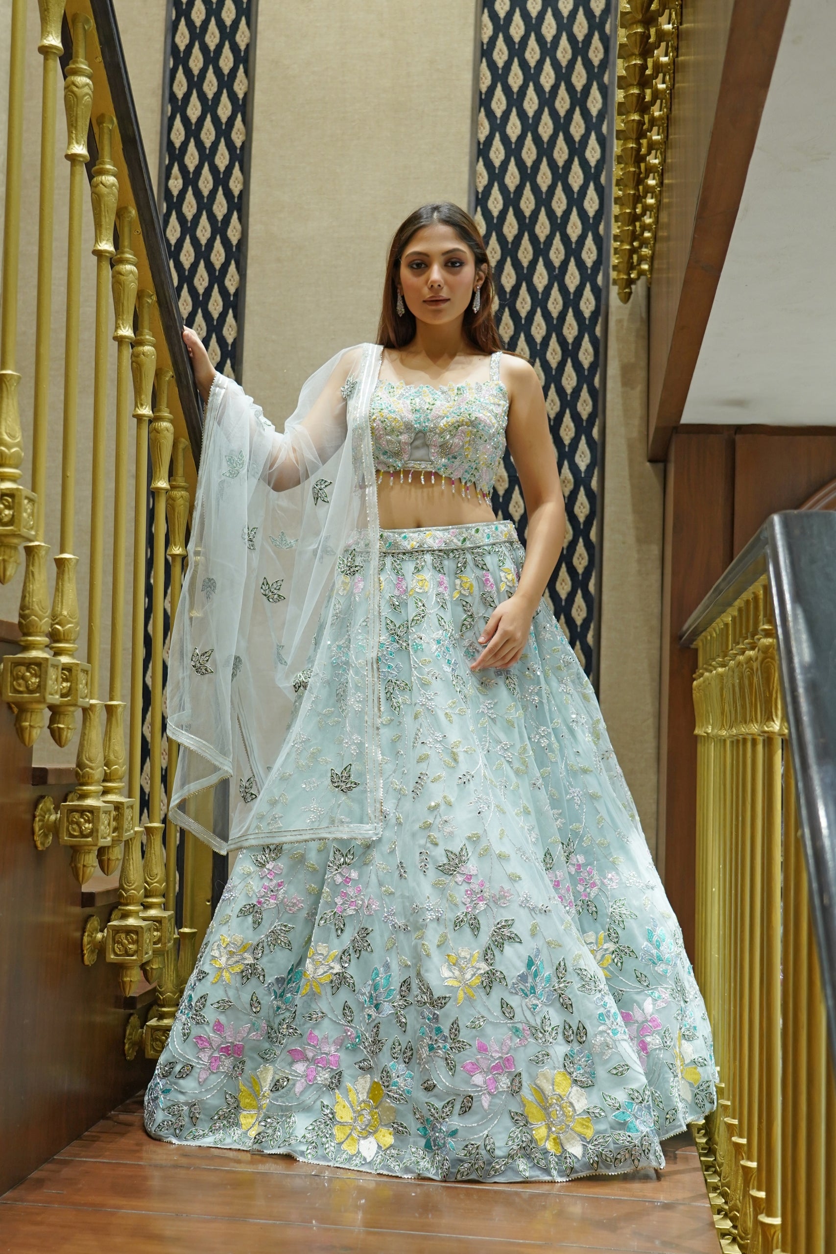 Introducing our vibrant ice blue lehenga in net fabric from Indrani store. It is accentuated with exquisite embroidery like sequins, cut dana, applique and mirror. It comes with a matching embroidered blouse and a net dupatta.