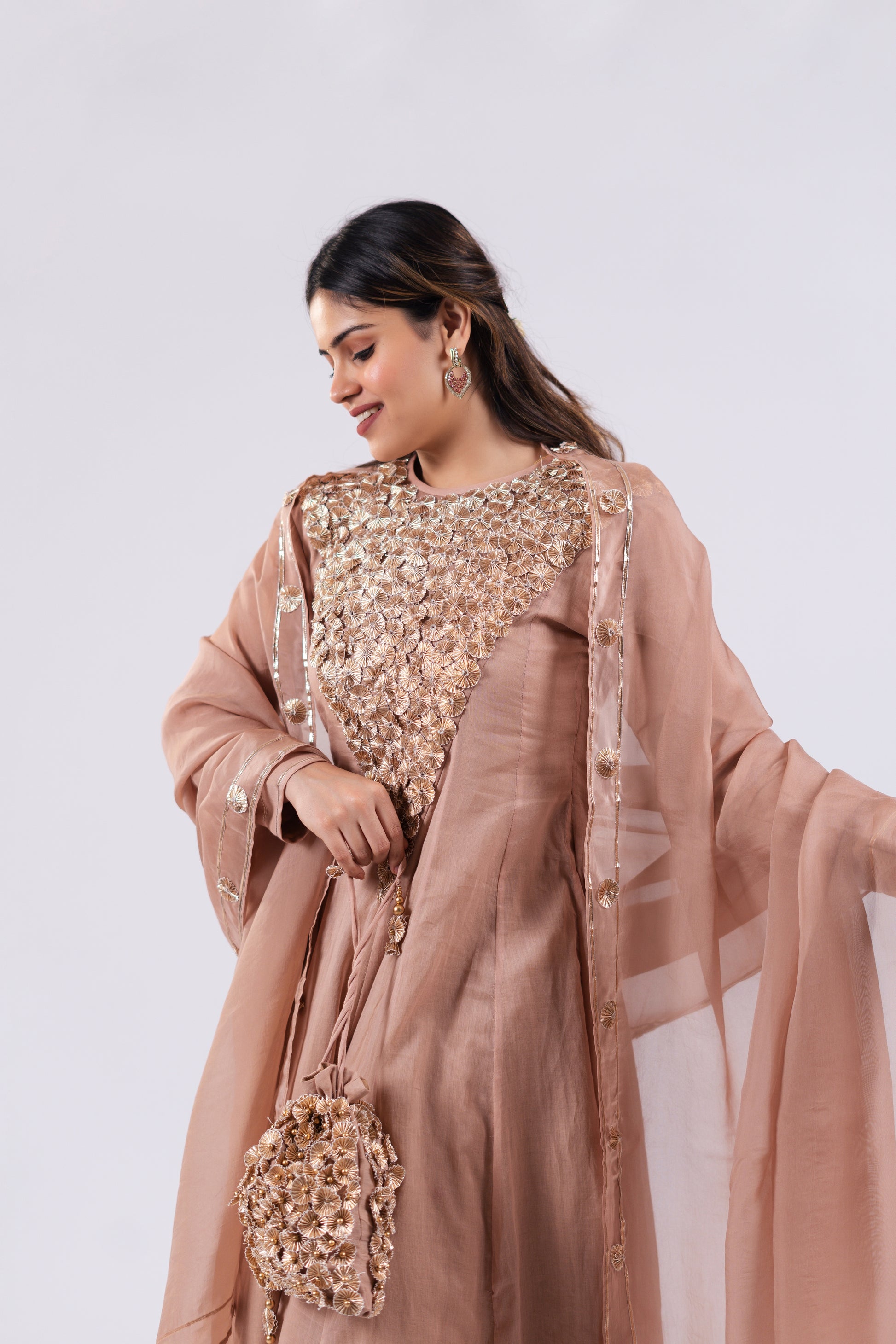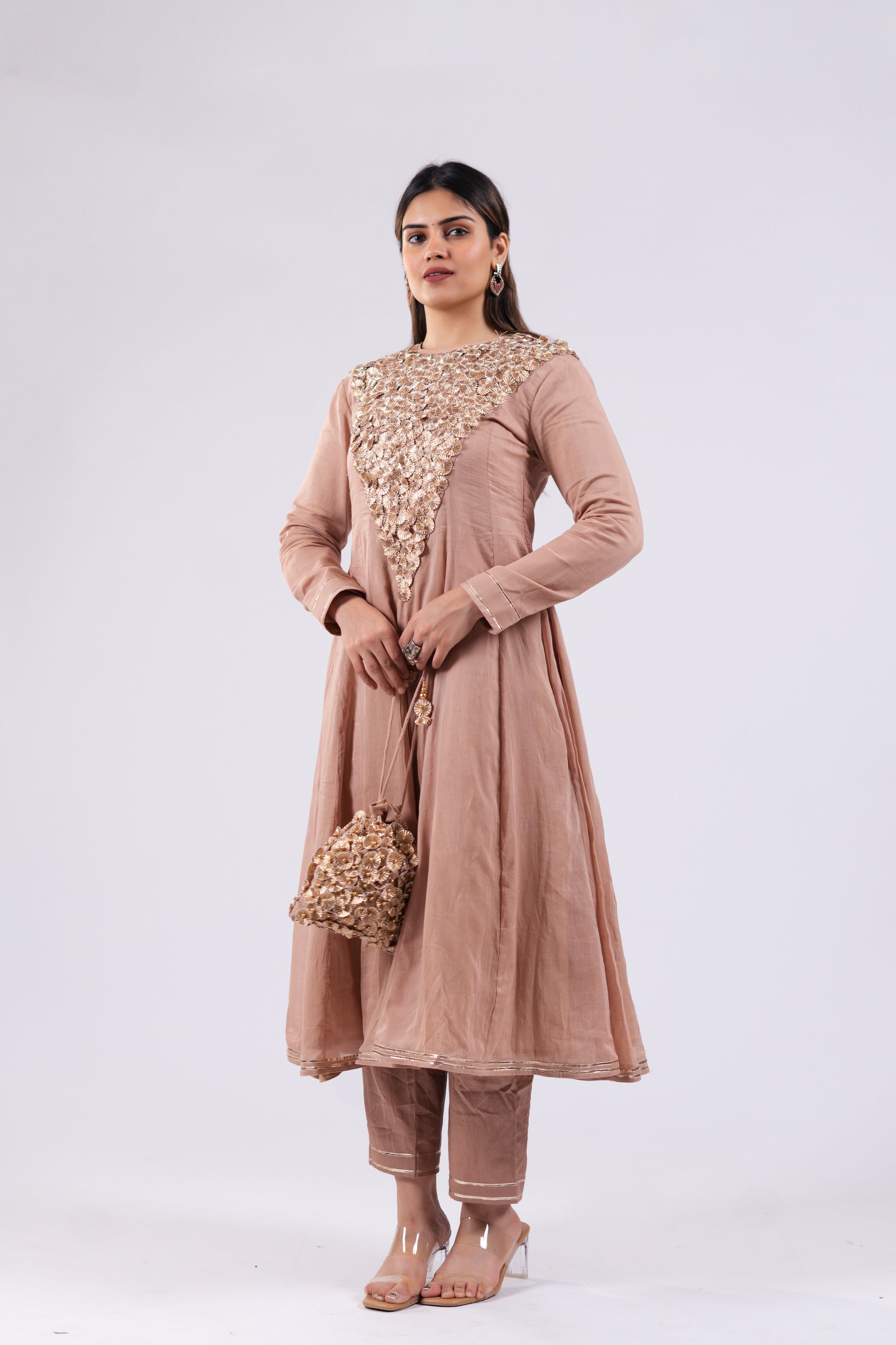 Embrace subtle elegance with this light brown kurti in soft mul fabric from Indrani store. Designed with a graceful A-line flare, it features beautiful gota flower detailing along the neckline, adding a touch of festive charm to its understated silhouette. Paired with a matching dupatta and coordinating potli, this set blends comfort with refined craftsmanship — perfect for intimate gatherings and daytime celebrations