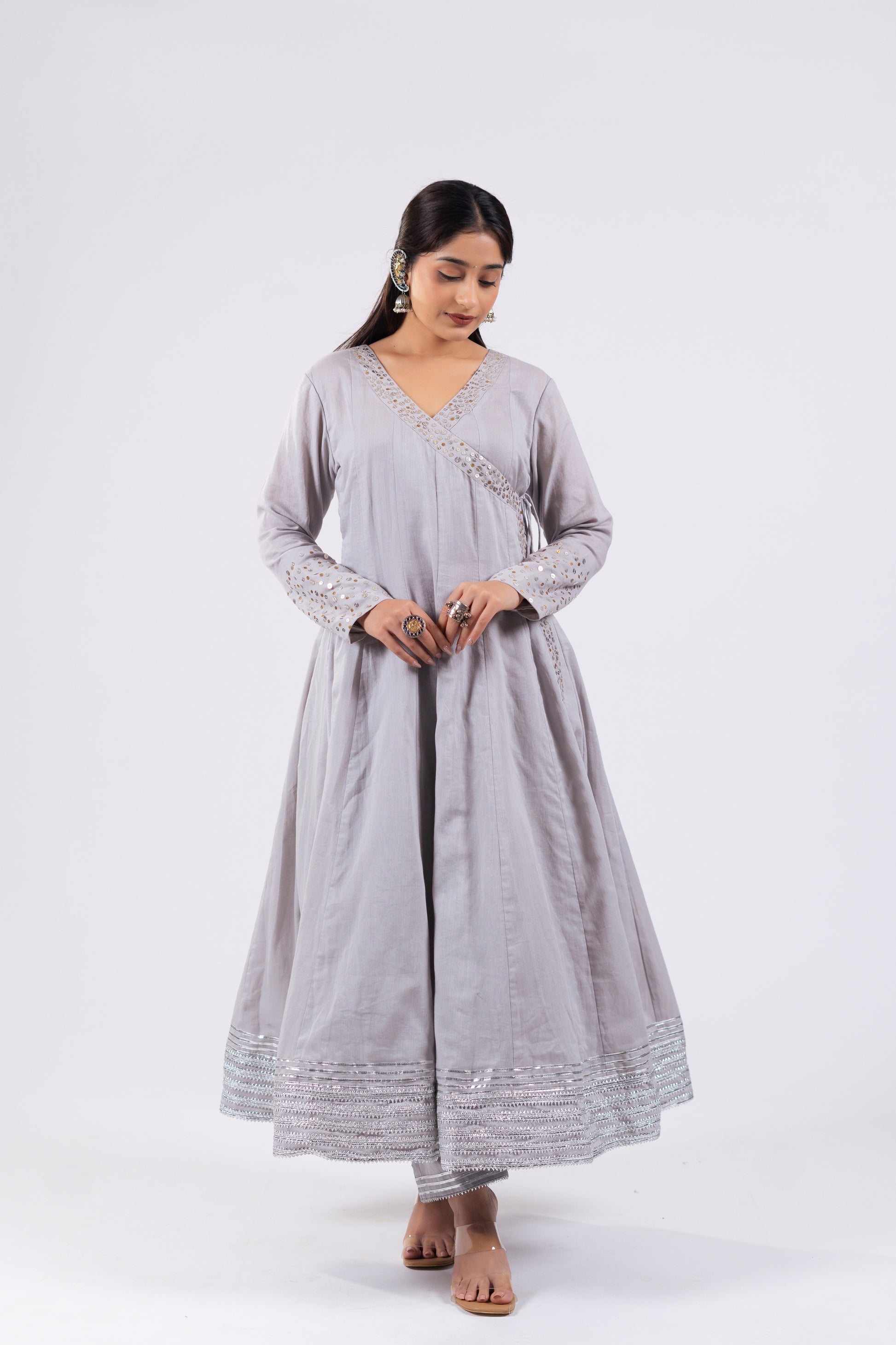 Discover timeless elegance with this grey anarkali set in soft mul fabric from Indrani Store. Designed in a graceful Angrakha style, the silhouette is enhanced with delicate sequin detailing that adds a subtle shimmer. The beautifully flared hem is adorned with intricate tui embroidery, creating a statement finish. Paired with a matching dupatta, this ensemble is perfect for festive gatherings and elegant celebrations.