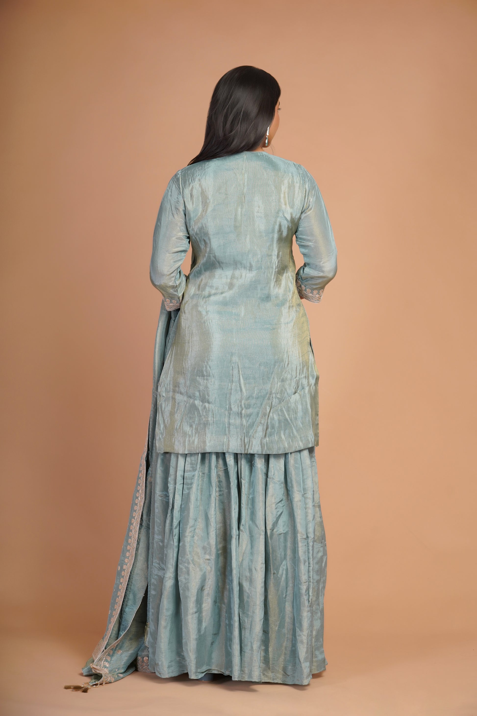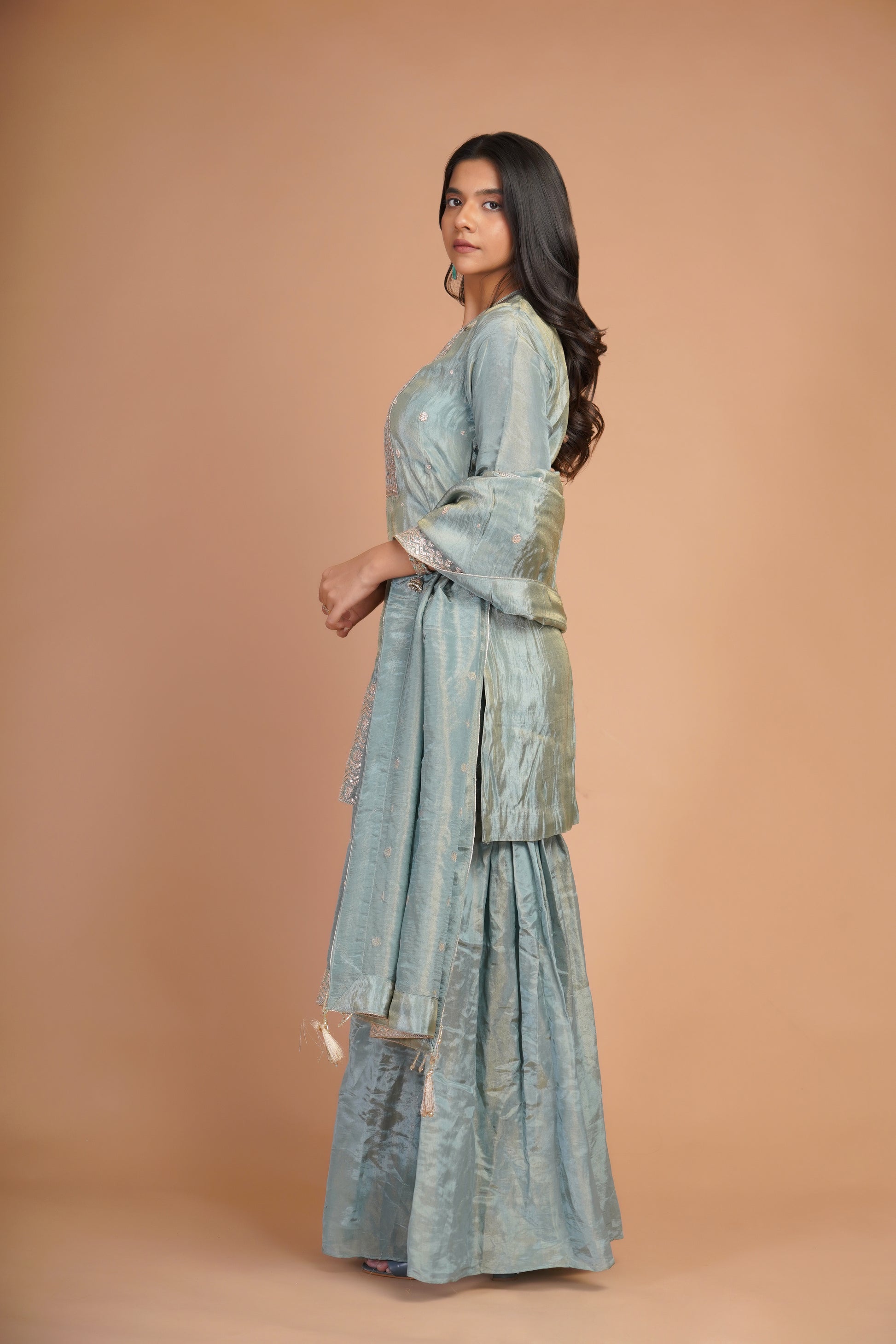 Add this festive light turquoise palazzo set in tissue fabric from Indrani store. The ensemble has intricate detailed embroidery in the neck and dupatta. The set comes with a flowy sharara, making it a comfortable choice for your festivities.