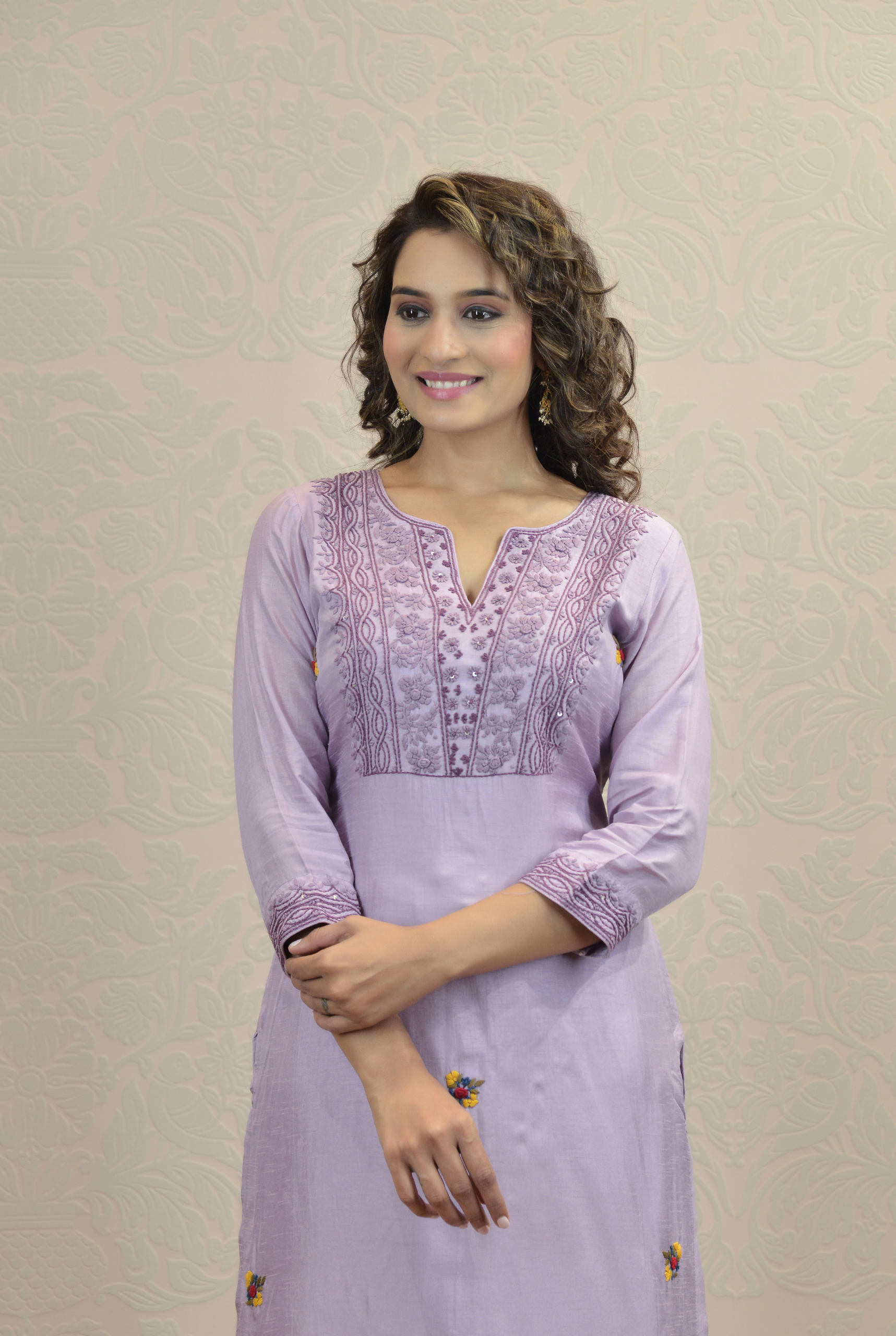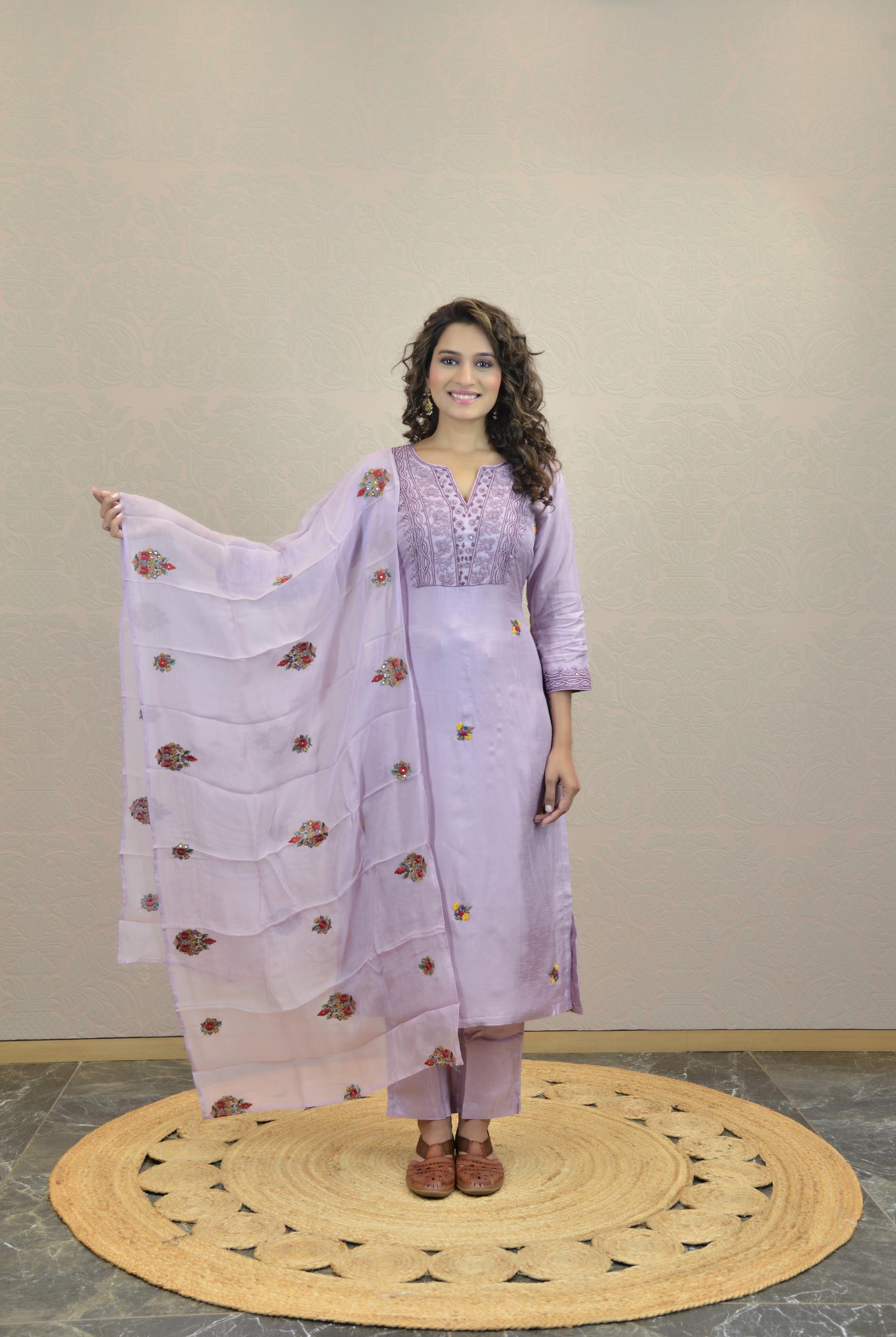 Featuring a lilackurta set in soft silk base from Indrani store. It is paired with matching pants and a thread work embroidered organza dupatta.