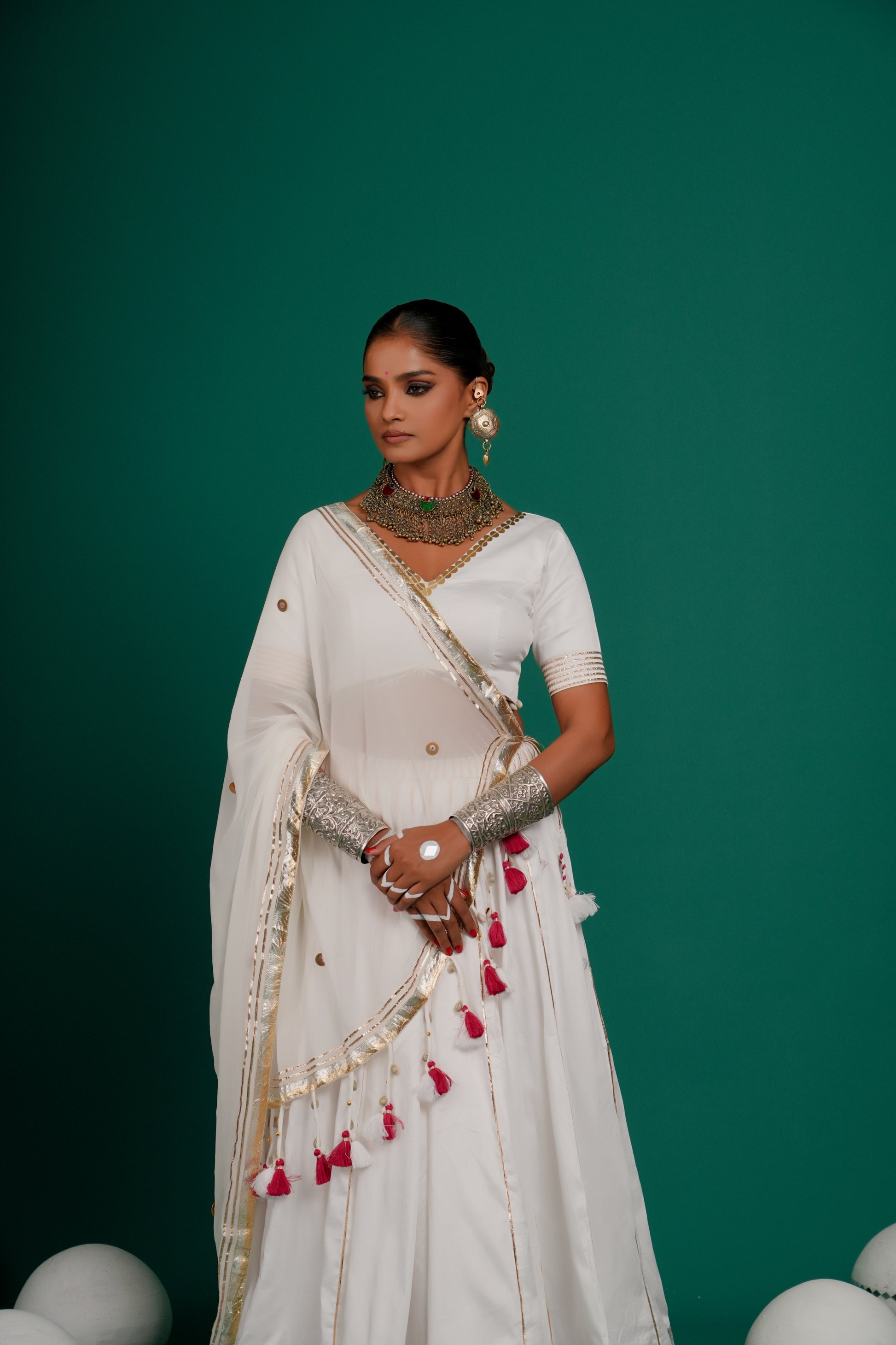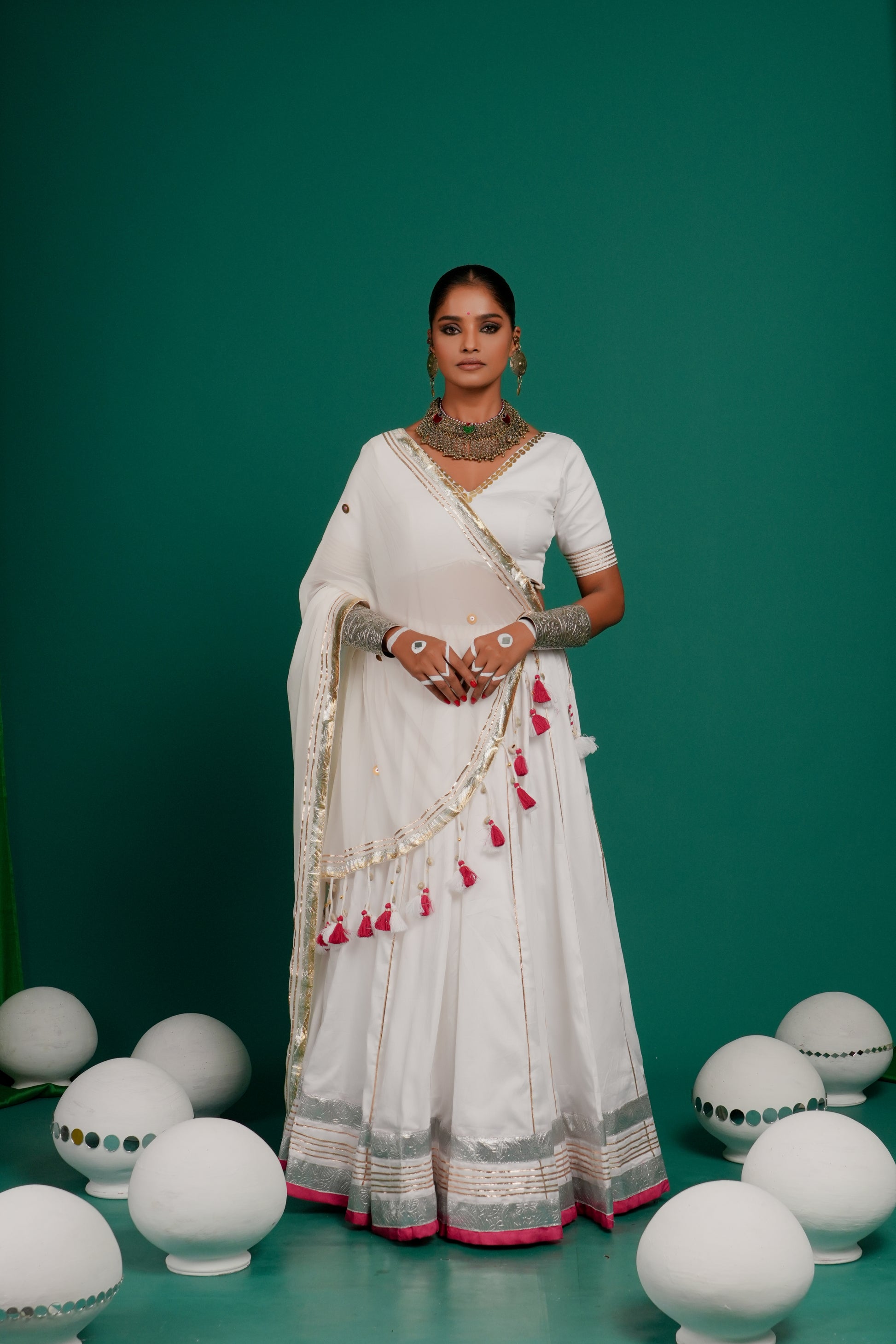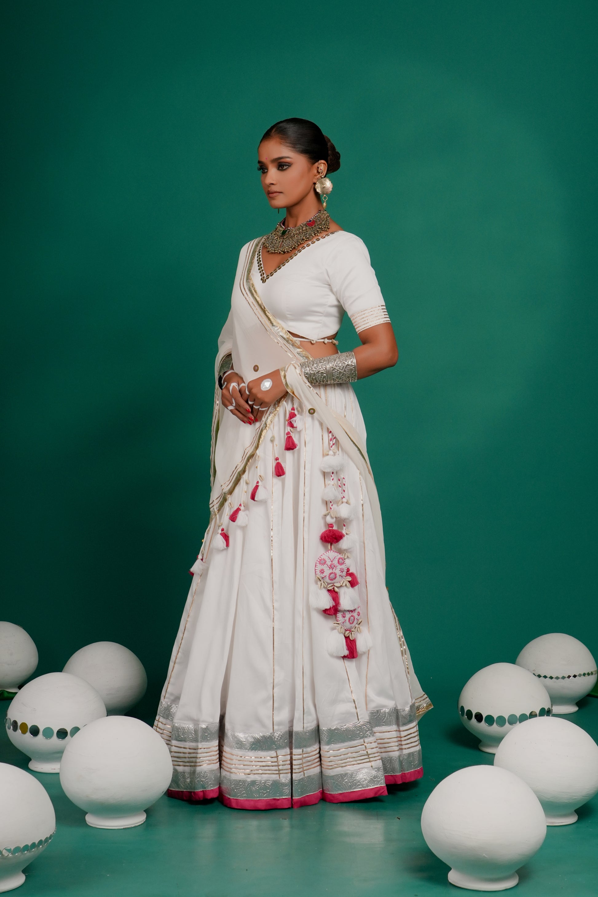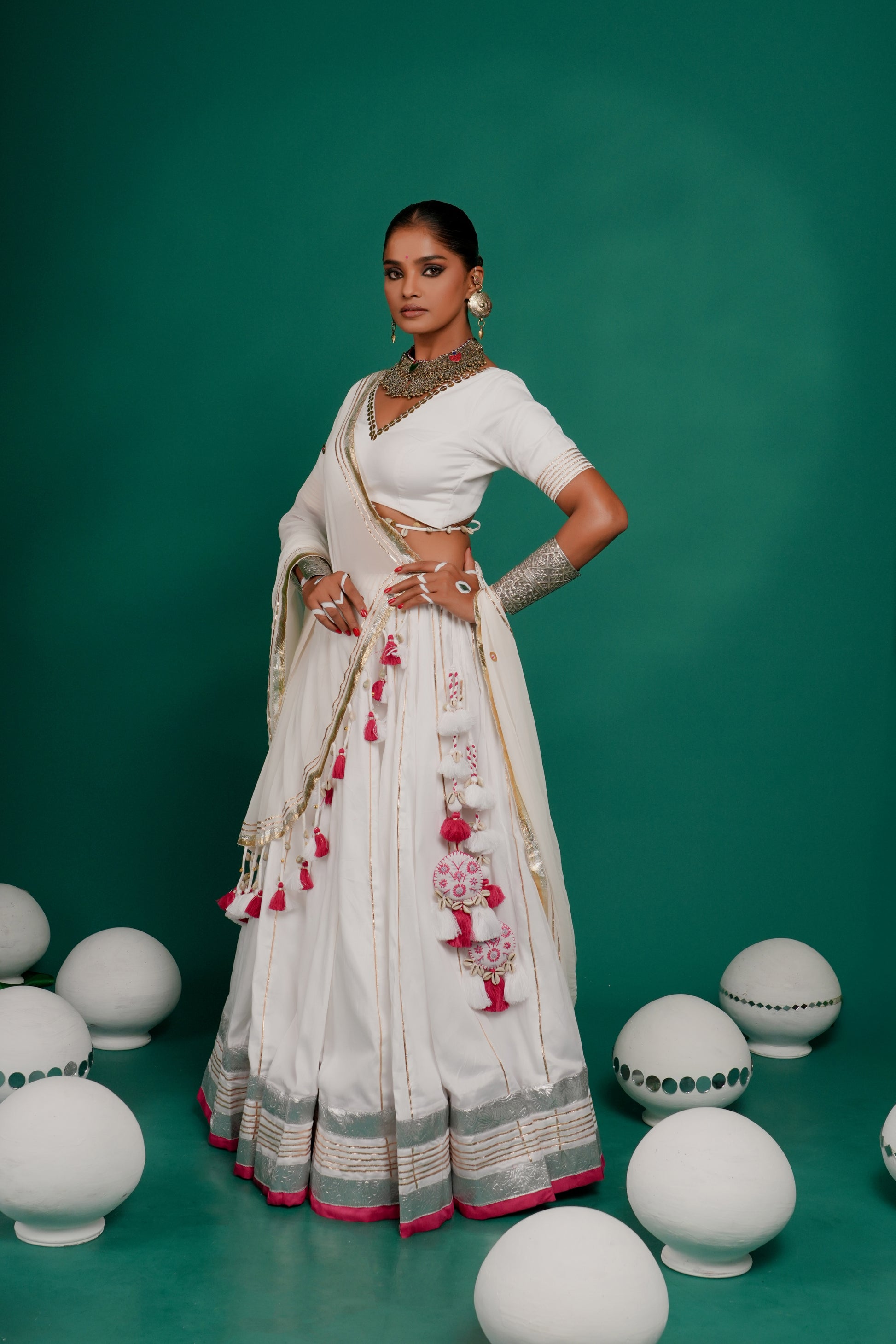 Indulge in this classic white color lehenga in Russian silk fabric from Indrani store. The lehenga has beautiful lampi skirt border all over with tassel detailing. The lehenga is paired with matching blouse and embroidered dupatta. The lehenga’s 12-meter flare creates a breathtaking silhouette—elegant, graceful, and truly captivating, whether you're swirling to the beats of Garba or revelling in the festive fervour.