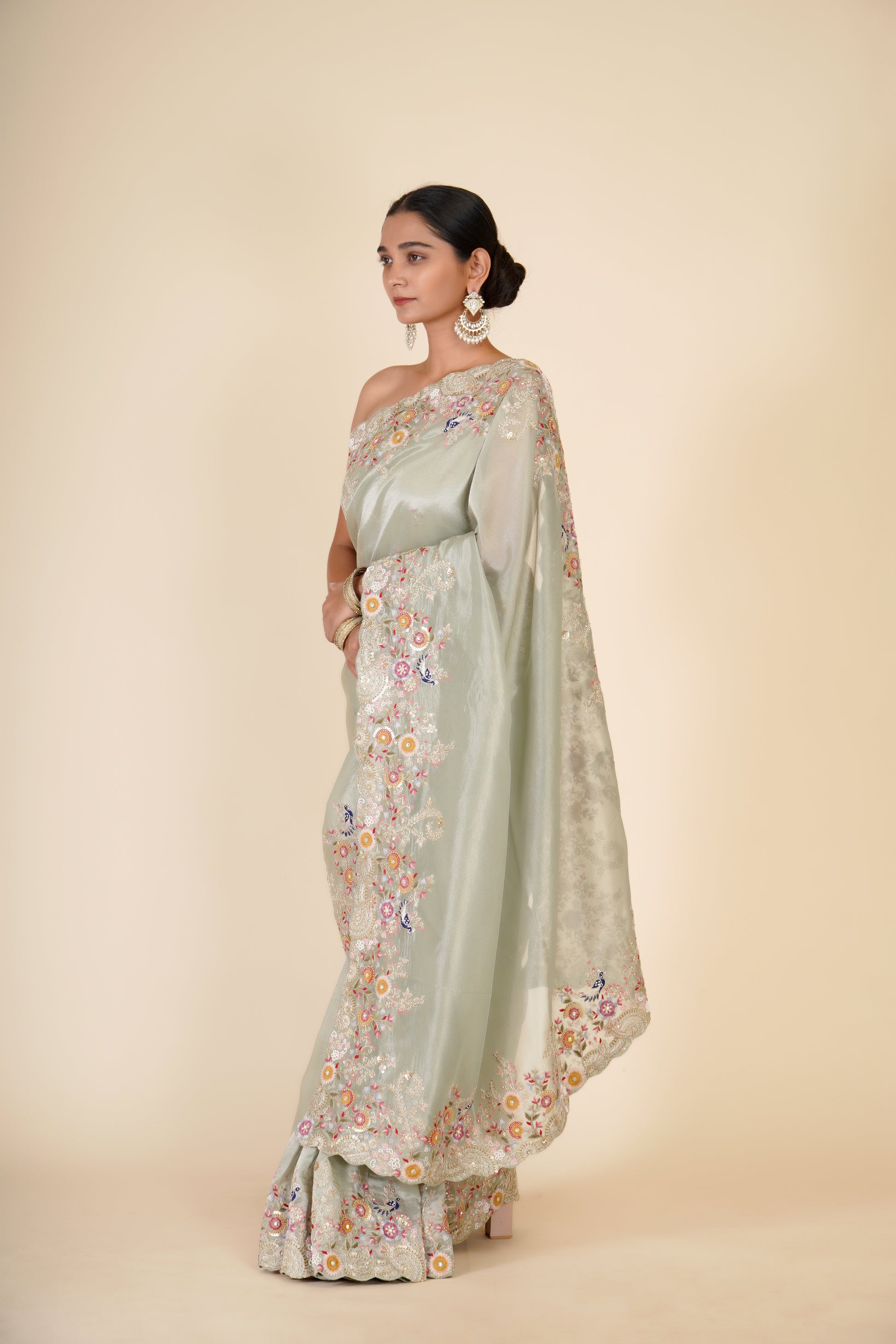 Grace this beautiful mint green saree in tissue fabric from Indrani store. The saree is adorned with multi embroidery on the ends of the border with scallops cut. The saree comes with a matching embedded blouse.