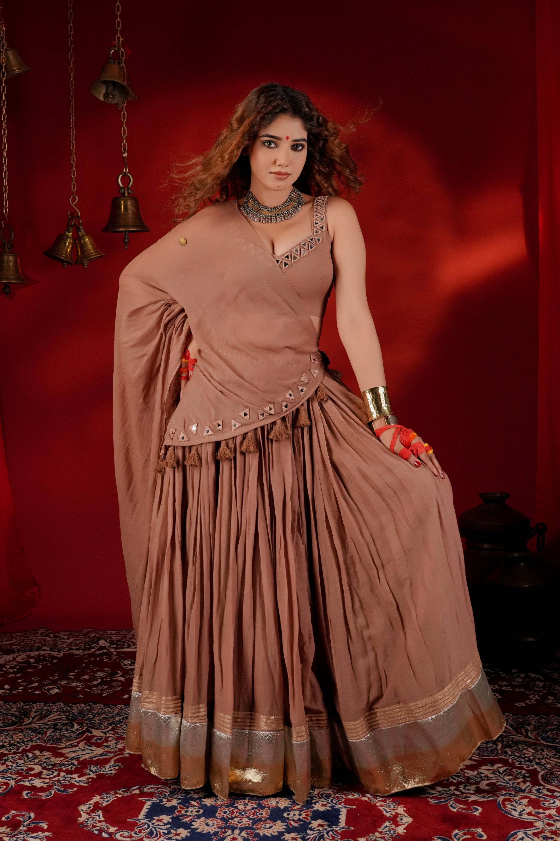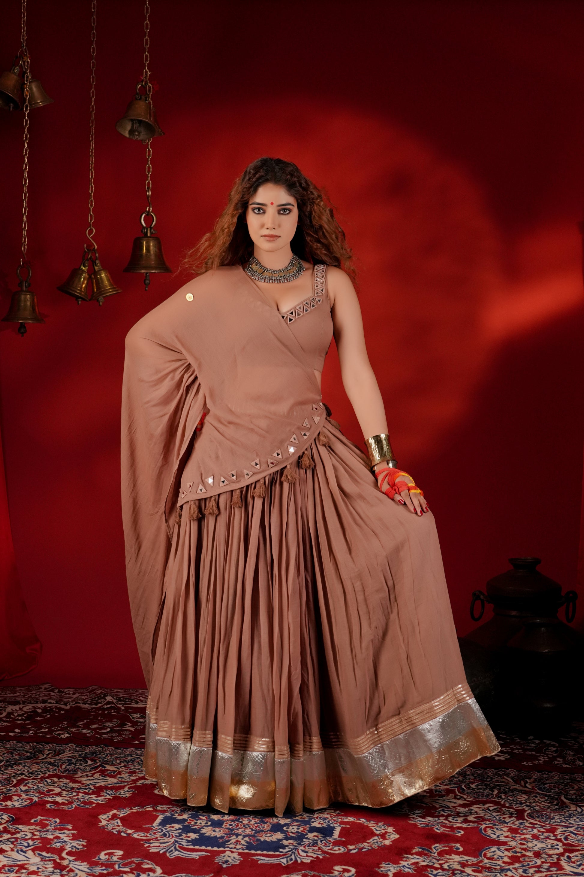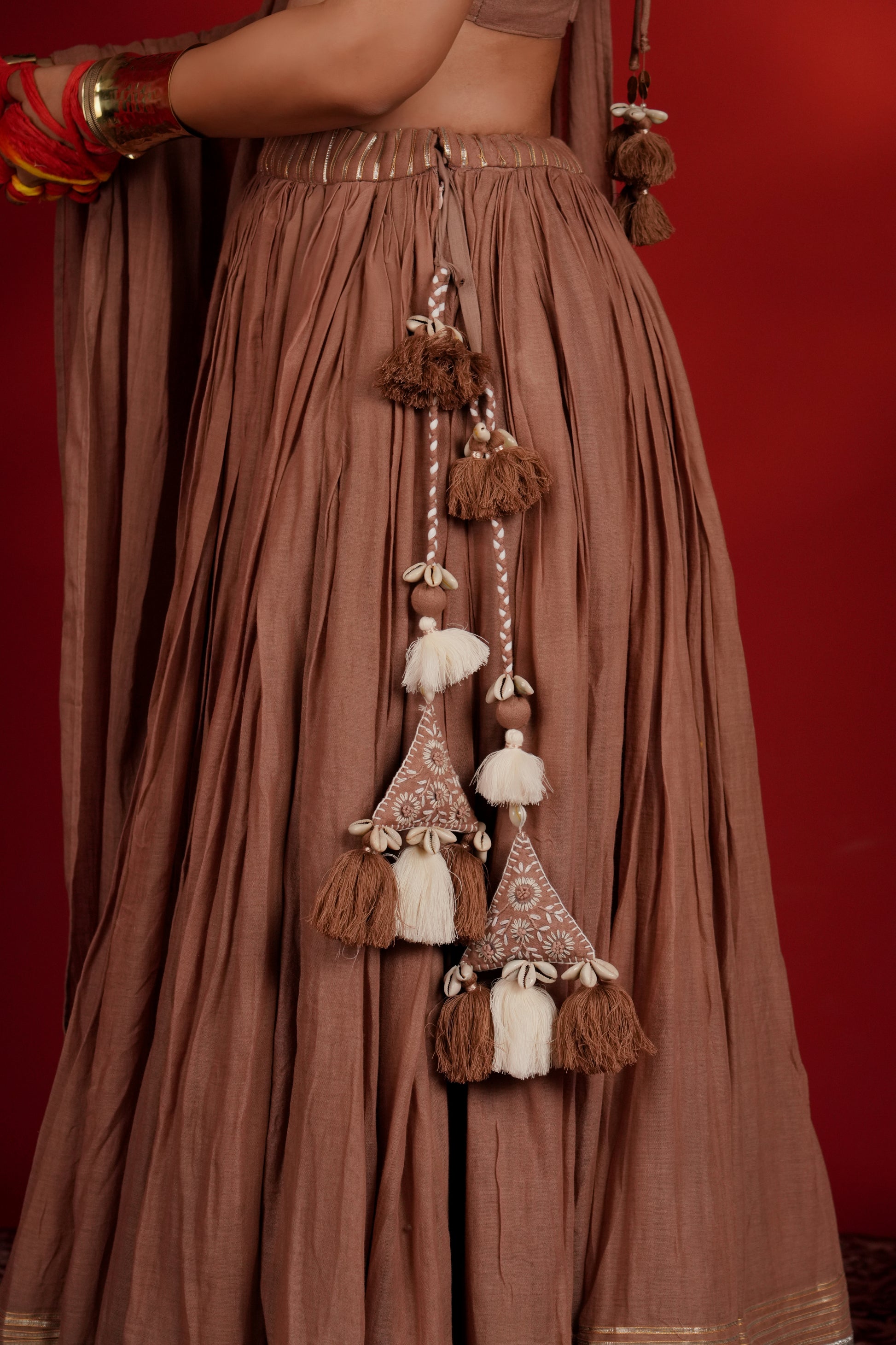 Indulge in the warm mocha brown lehenga in mul fabric from Indrani store. The lehenga has beautiful lampi skirt border all over with tassel detailing. The lehenga is paired with matching blouse and embroidered dupatta. The lehenga’s 12-meter flare creates a breathtaking silhouette—elegant, graceful, and truly captivating, whether you're swirling to the beats of Garba or revelling in the festive fervour.