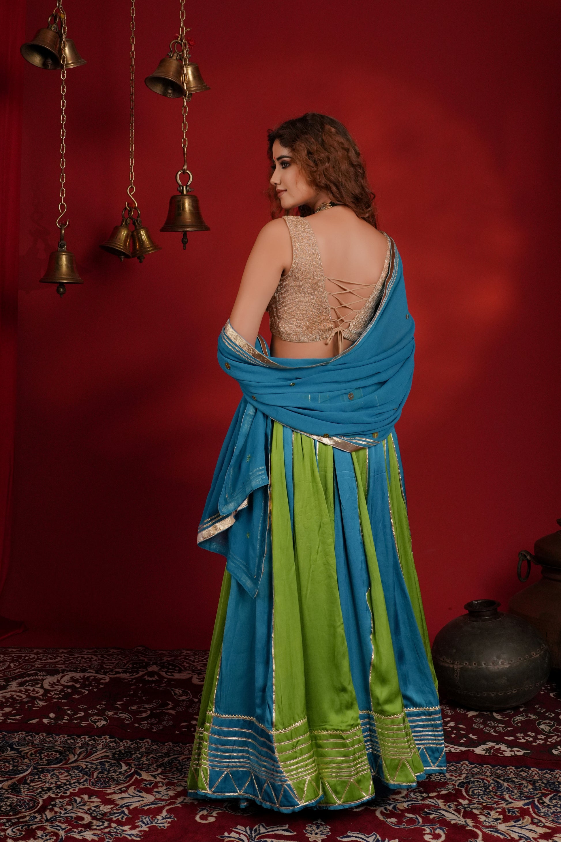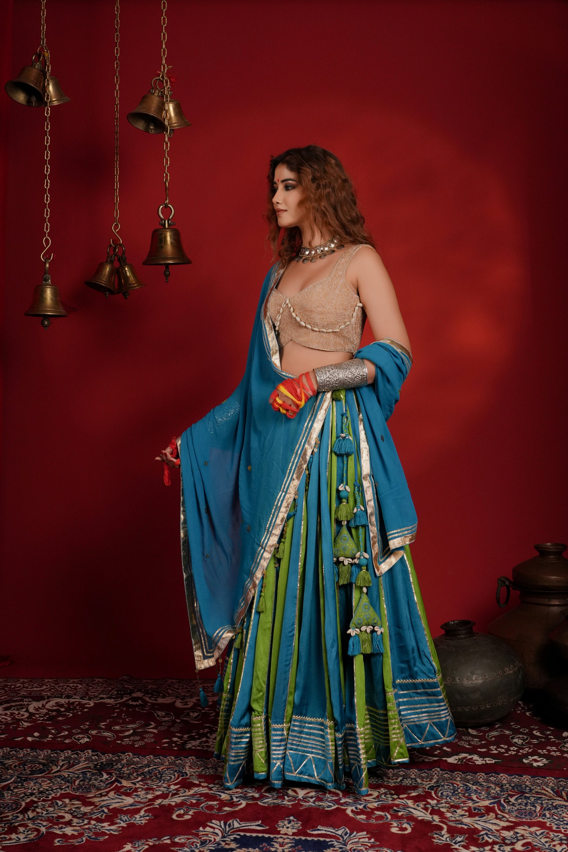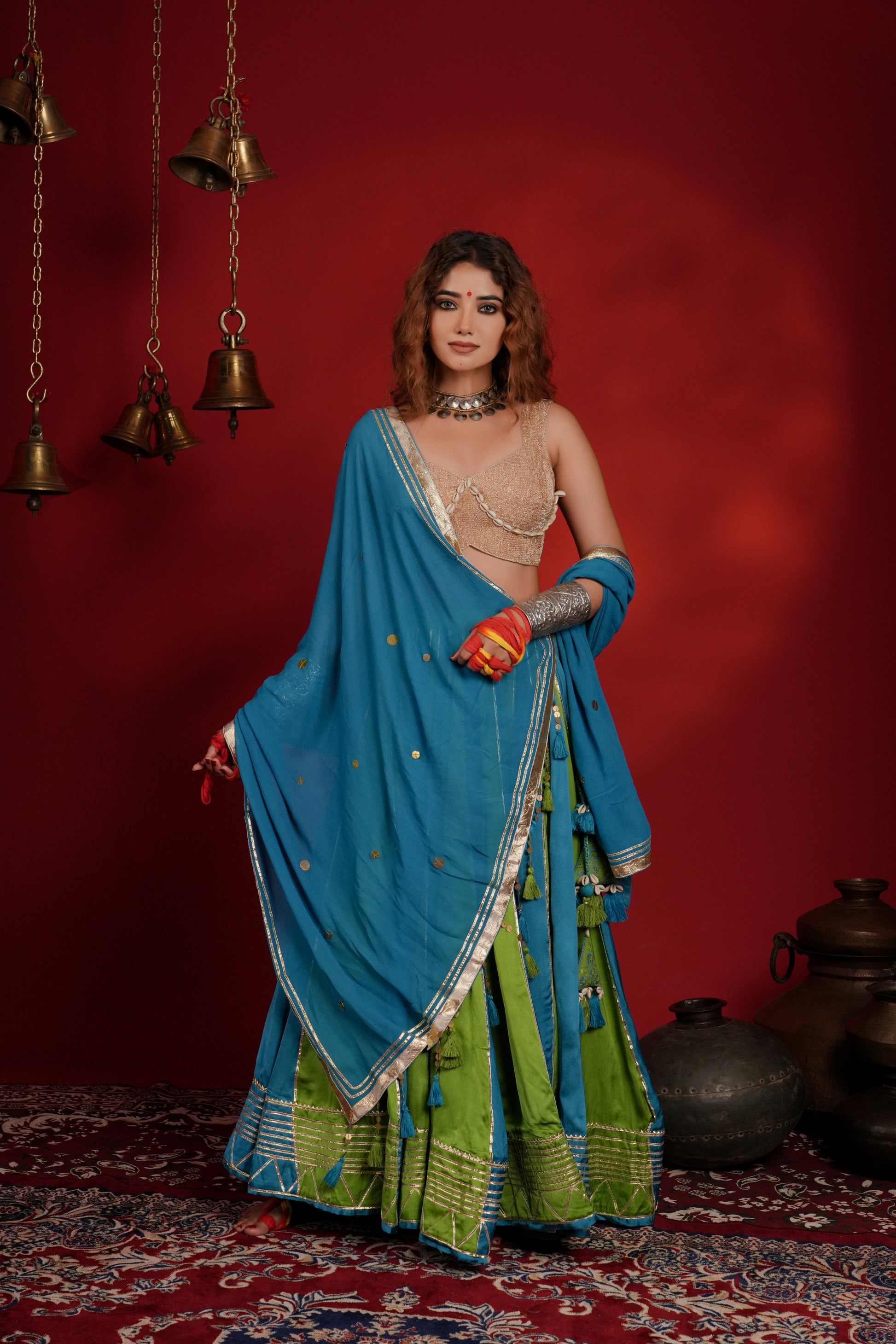 Indulge in the vibrant lehenga in modal satin fabric from Indrani store. The lehenga has beautiful gota border all over with tassel detailing. The lehenga is paired with contrast shimmer golden blouse and embroidered dupatta. The lehenga’s 12-meter flare creates a breathtaking silhouette—elegant, graceful, and truly captivating, whether you're swirling to the beats of Garba or revelling in the festive fervour.