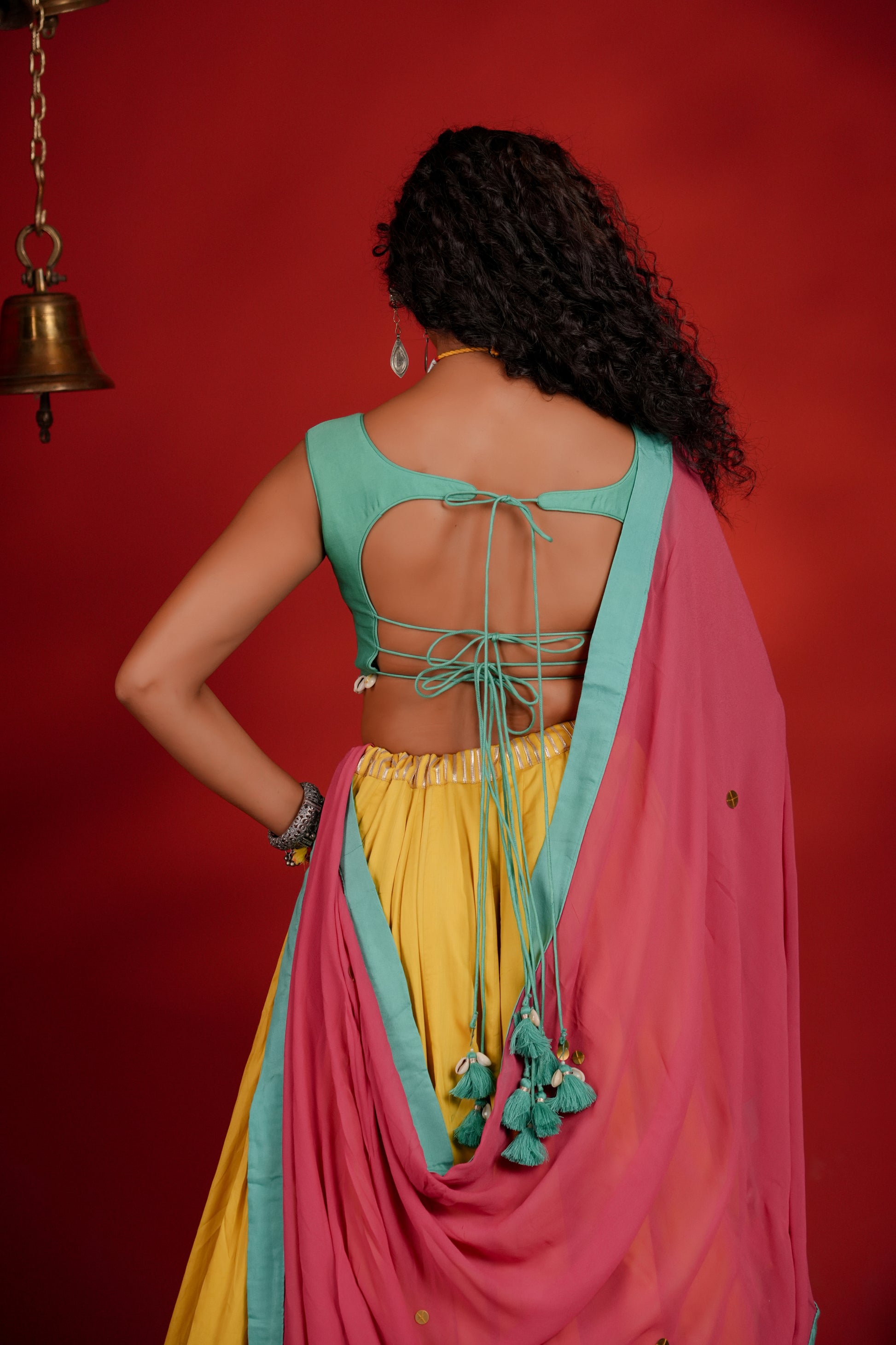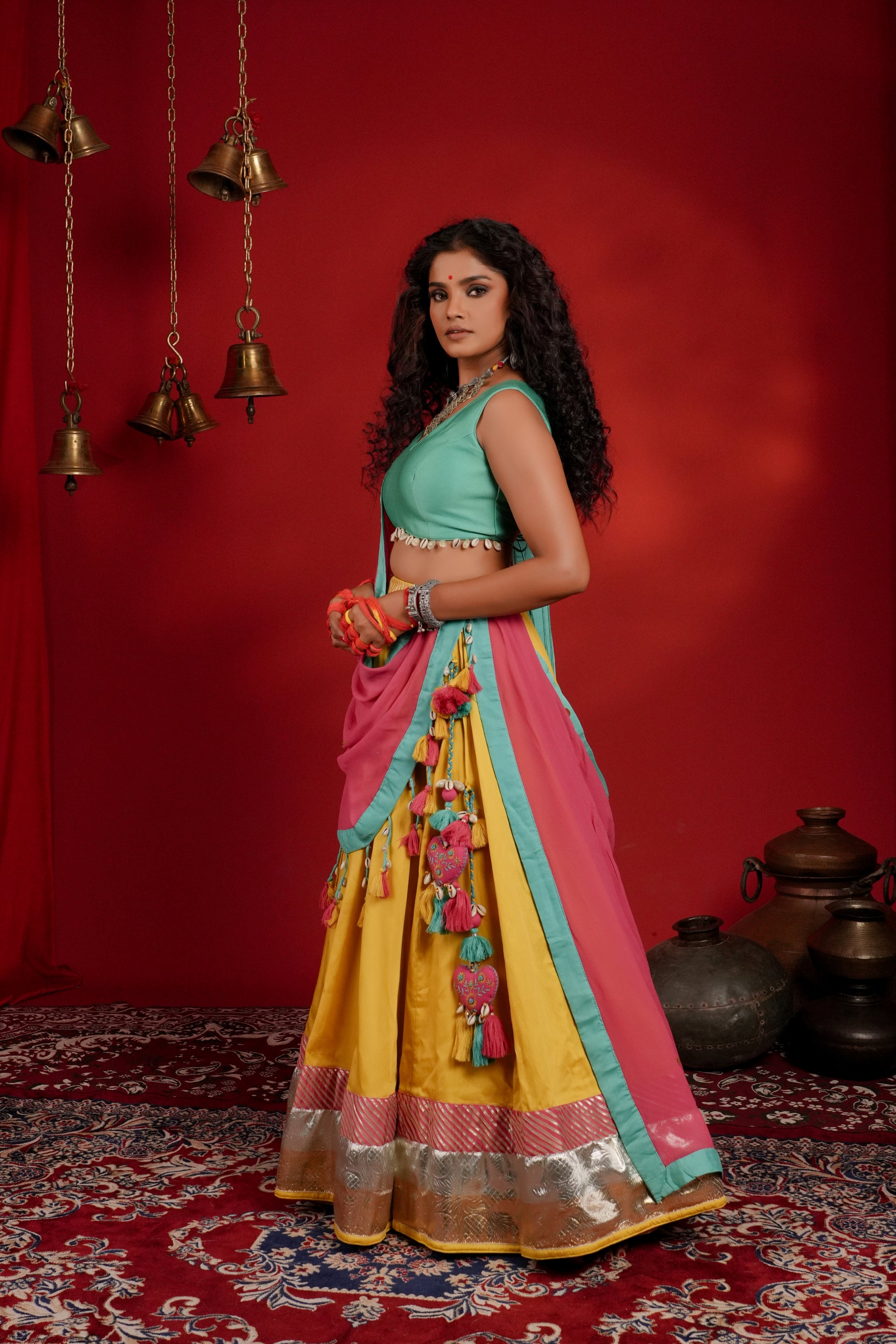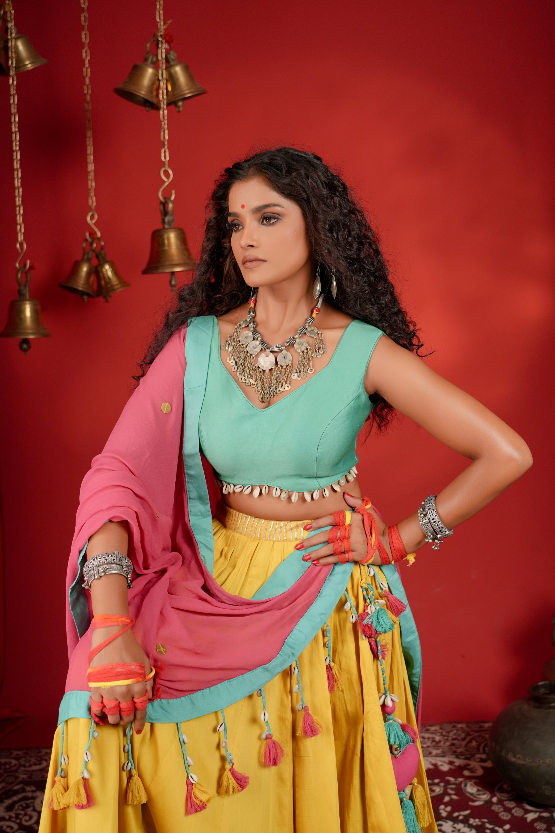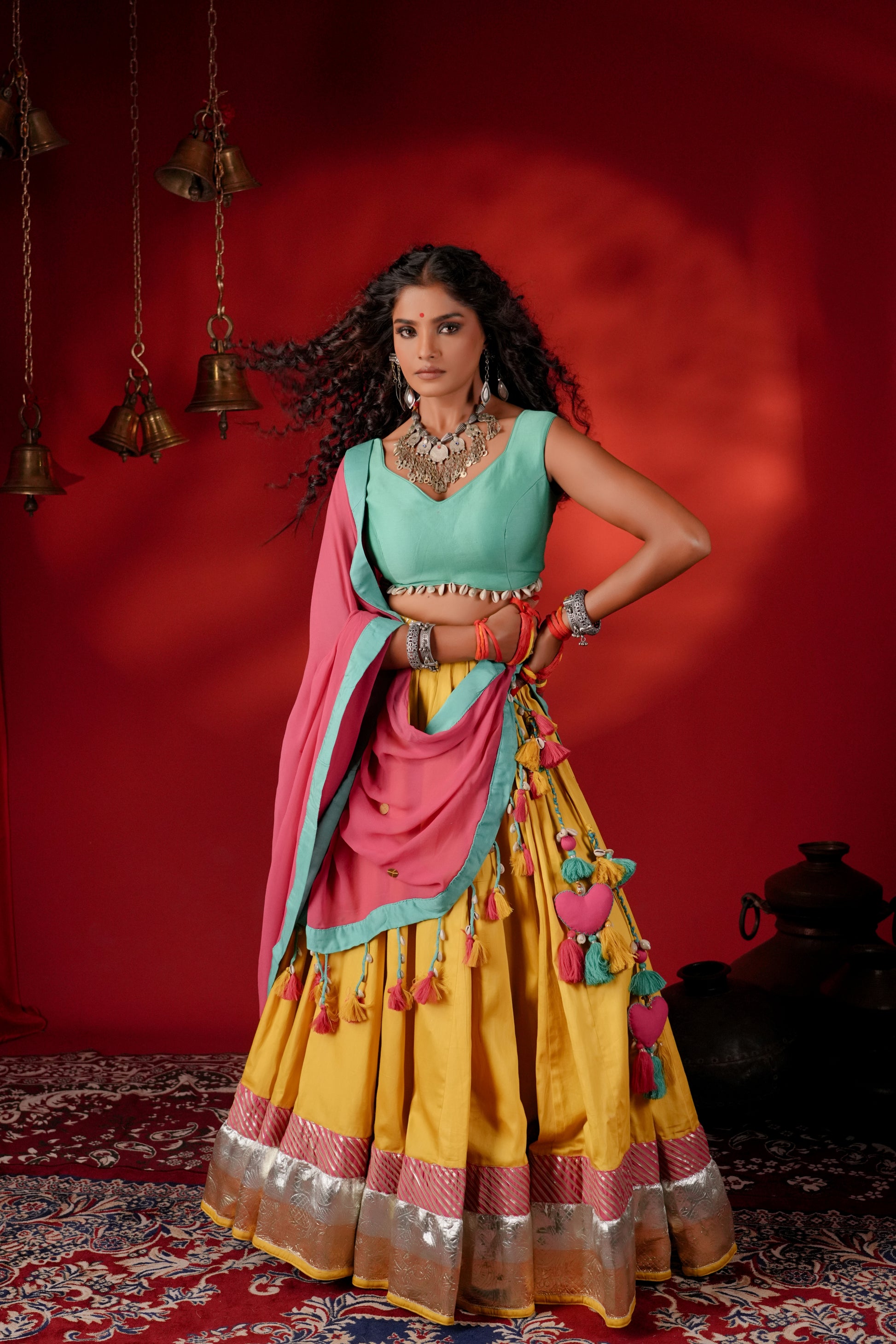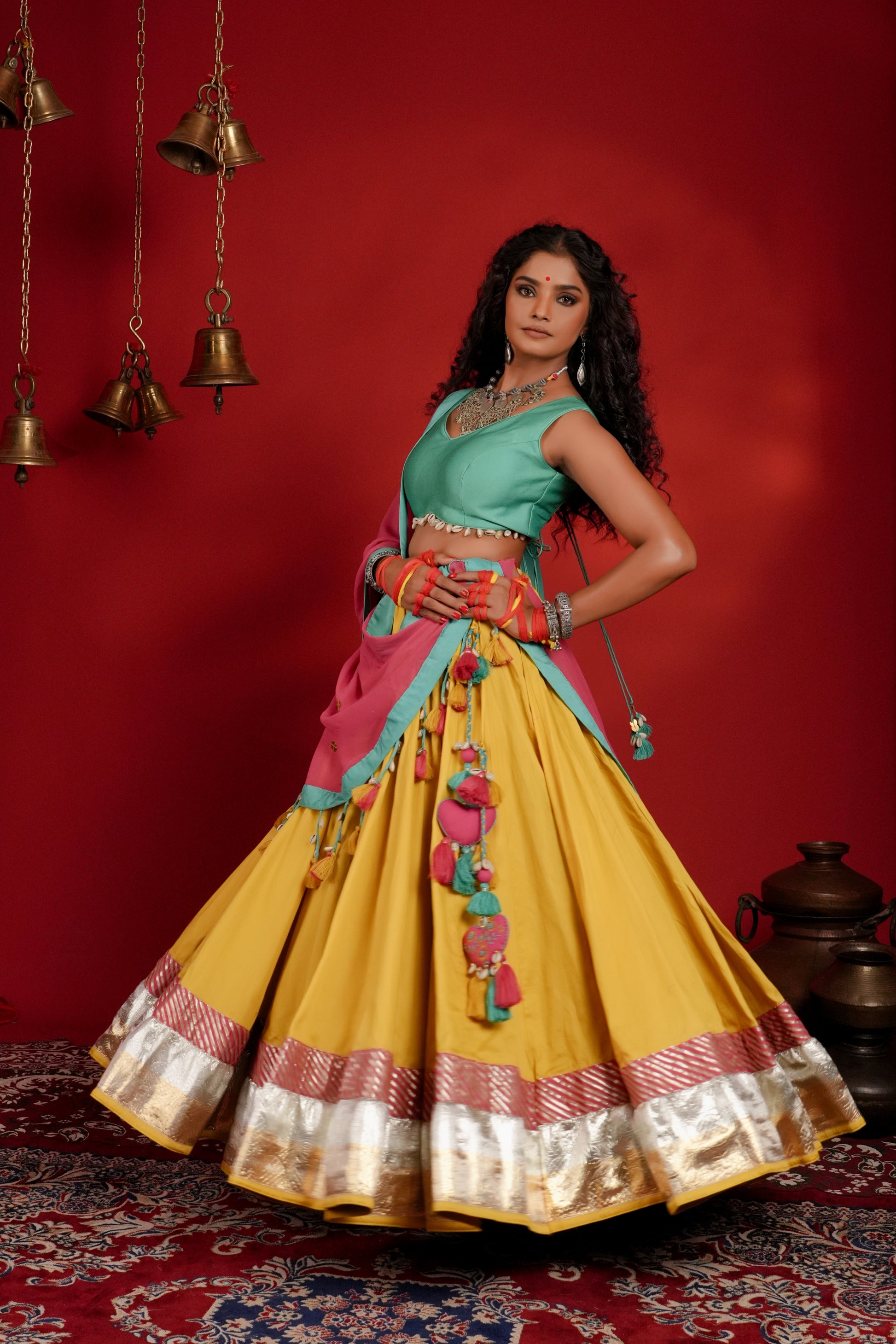 Indulge in the bright yellow lehenga in cotton satin fabric from Indrani store. The lehenga has beautiful lampi skirt border all over with tassel detailing. The lehenga is paired with contrasting turquoise blouse and embroidered pink dupatta. The lehenga’s 12-meter flare creates a breathtaking silhouette—elegant, graceful, and truly captivating, whether you're swirling to the beats of Garba or revelling in the festive fervour.